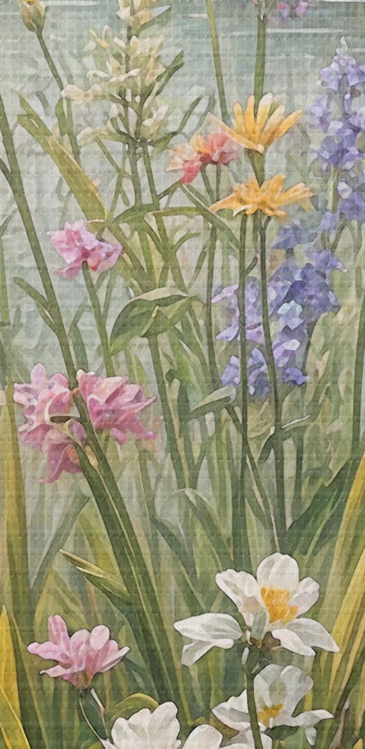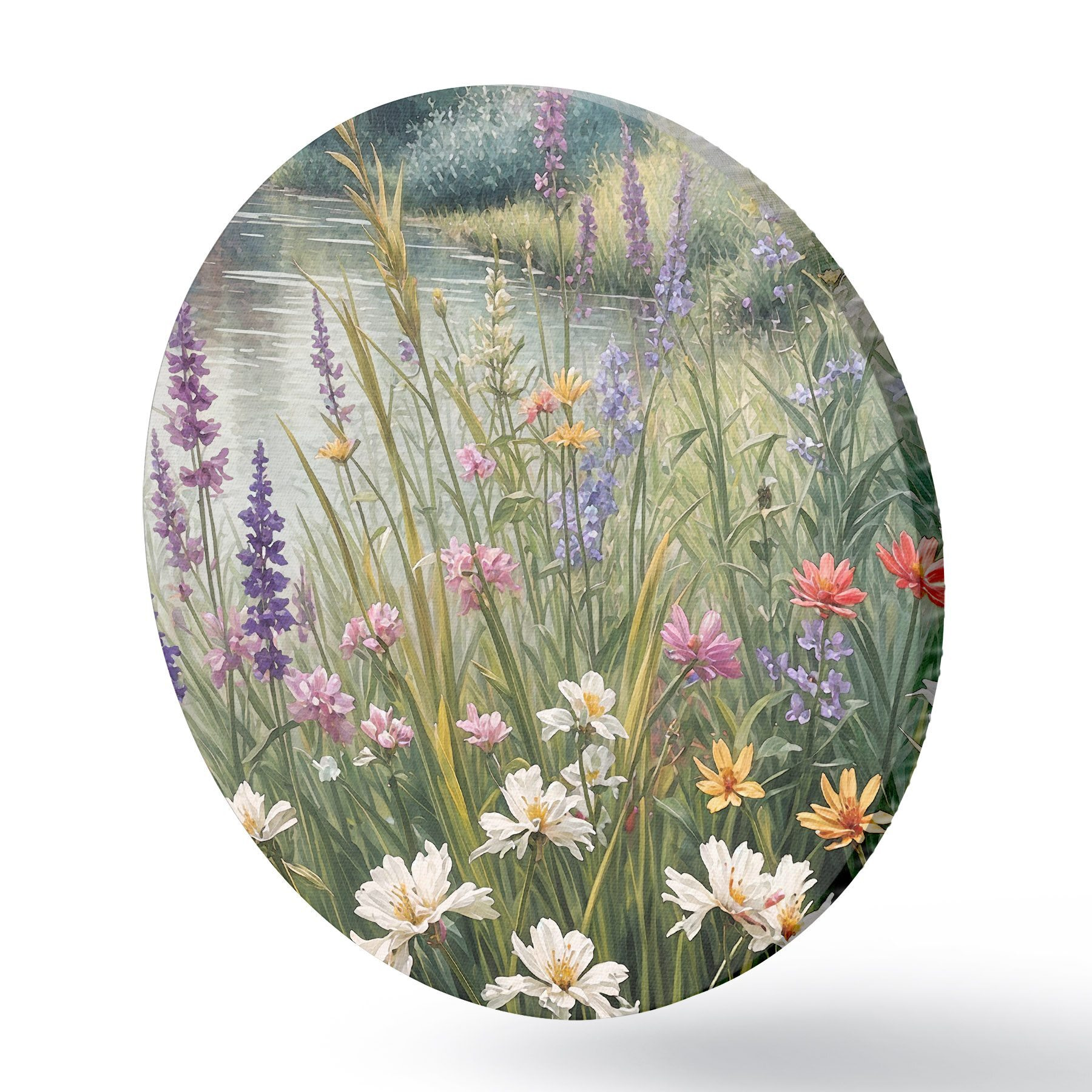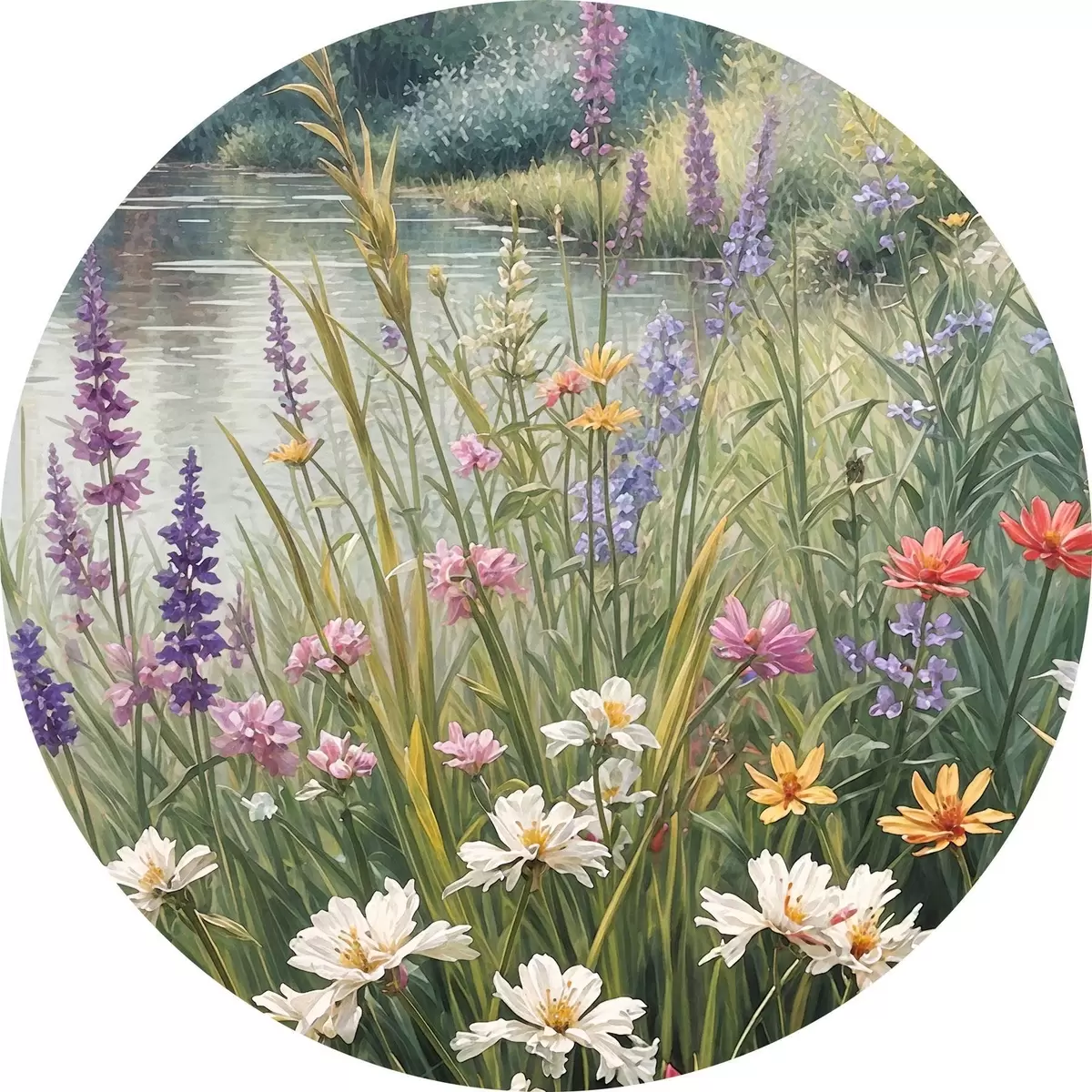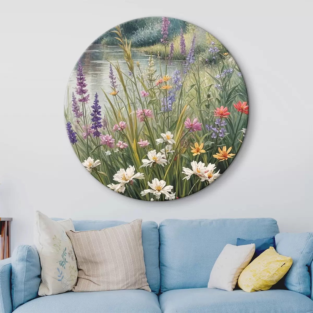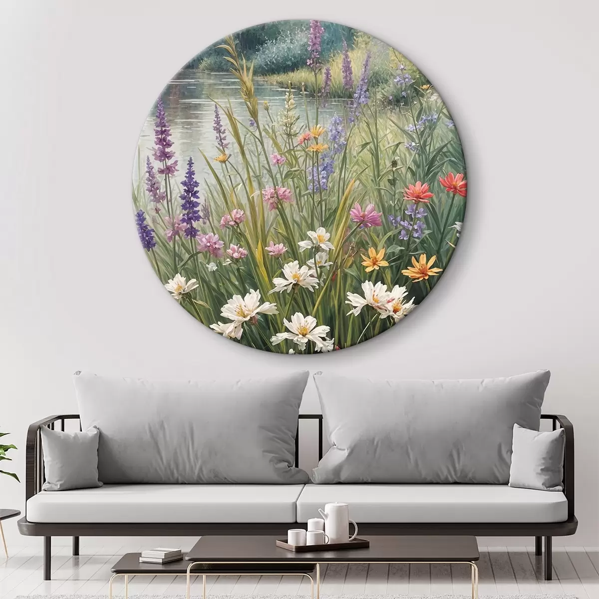 Cuadros redondos Flores silvestres y pastos altos. La escena general representa un paisaje natural vibrante r38829