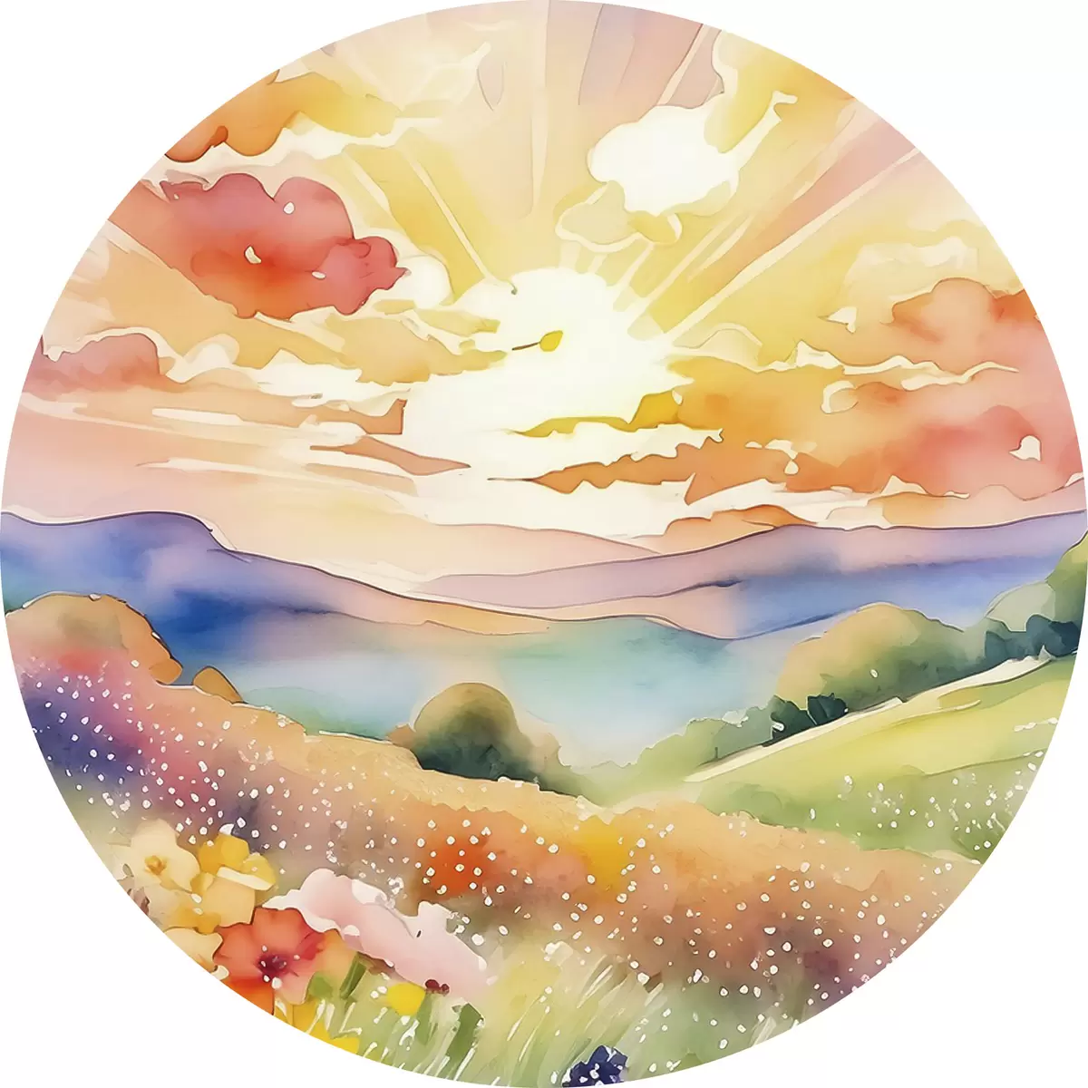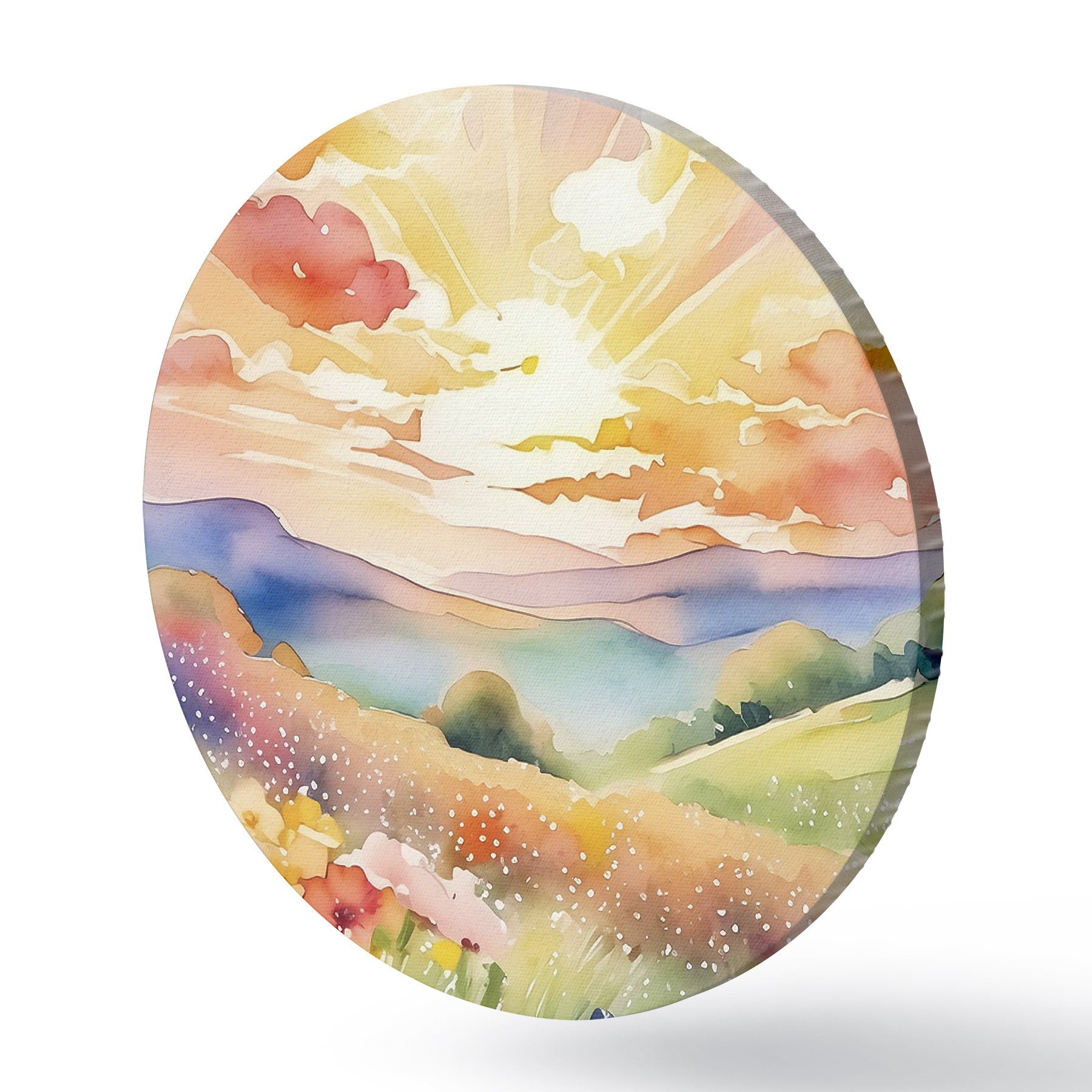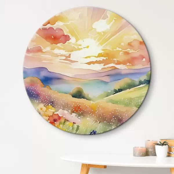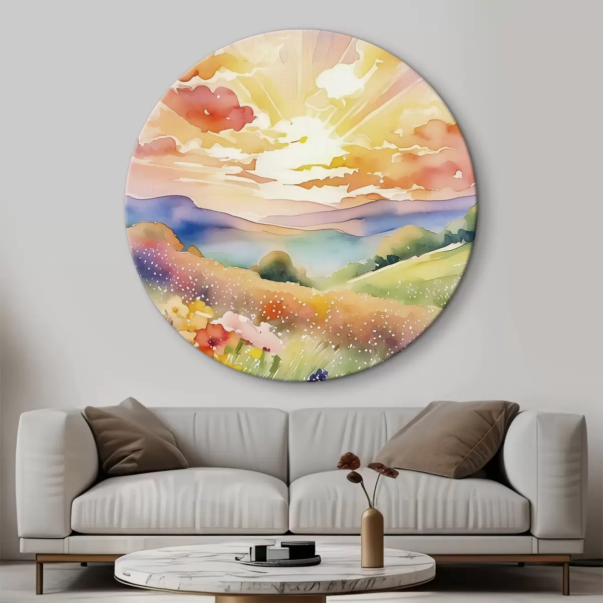 Cuadros redondos Puesta de sol en el campo de verano, flores, sol, cielo colorido, nubes, naturaleza r38842