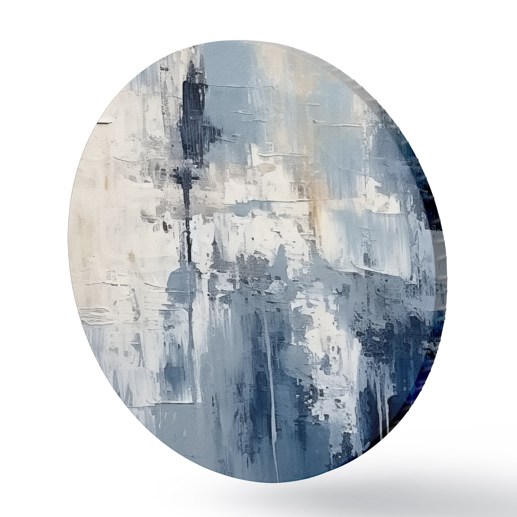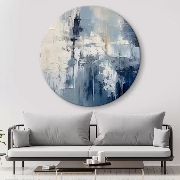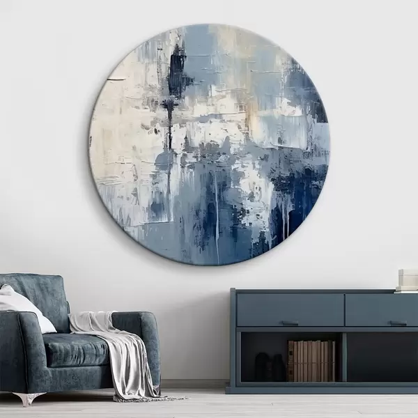 Cuadros redondos Pintura al óleo minimalista abstracta, frotada, geométrica, mancha, color azul y blanco r38906