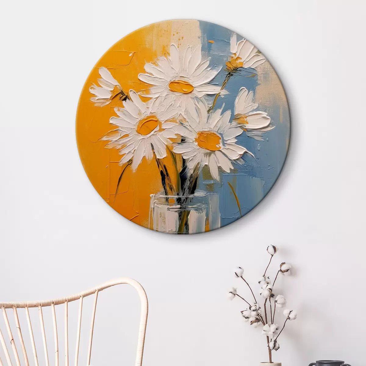 Cuadros redondos Margaritas blancas en un jarrón de cristal sobre fondo azul y amarillo, imitación de pintura al óleo, grandes trazos r38907
