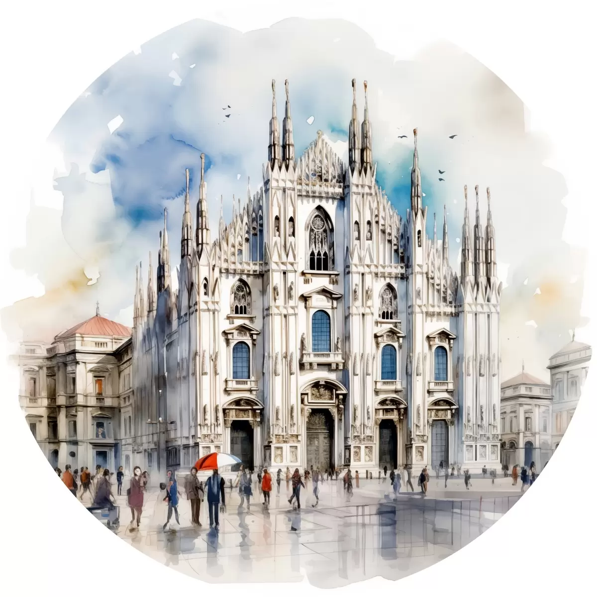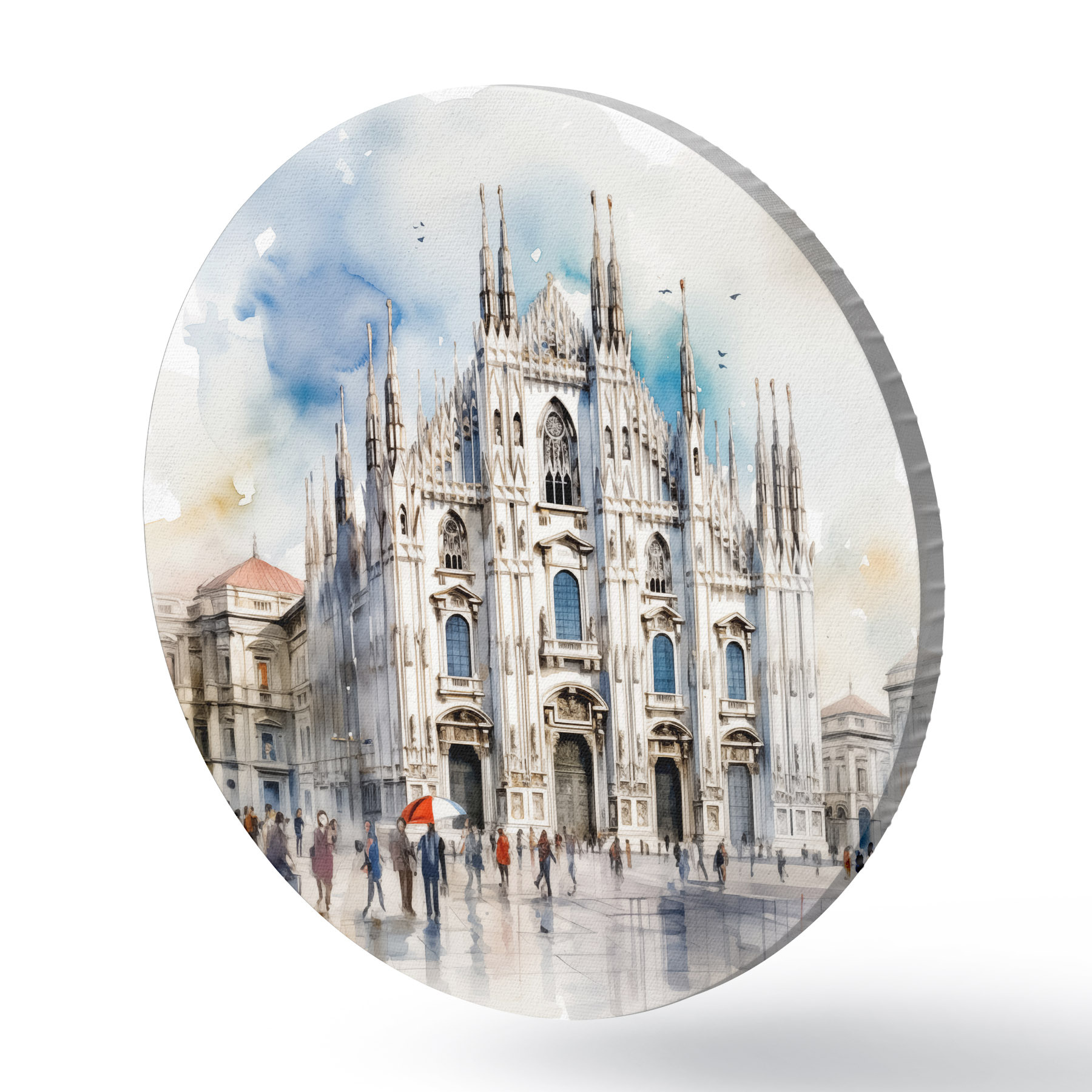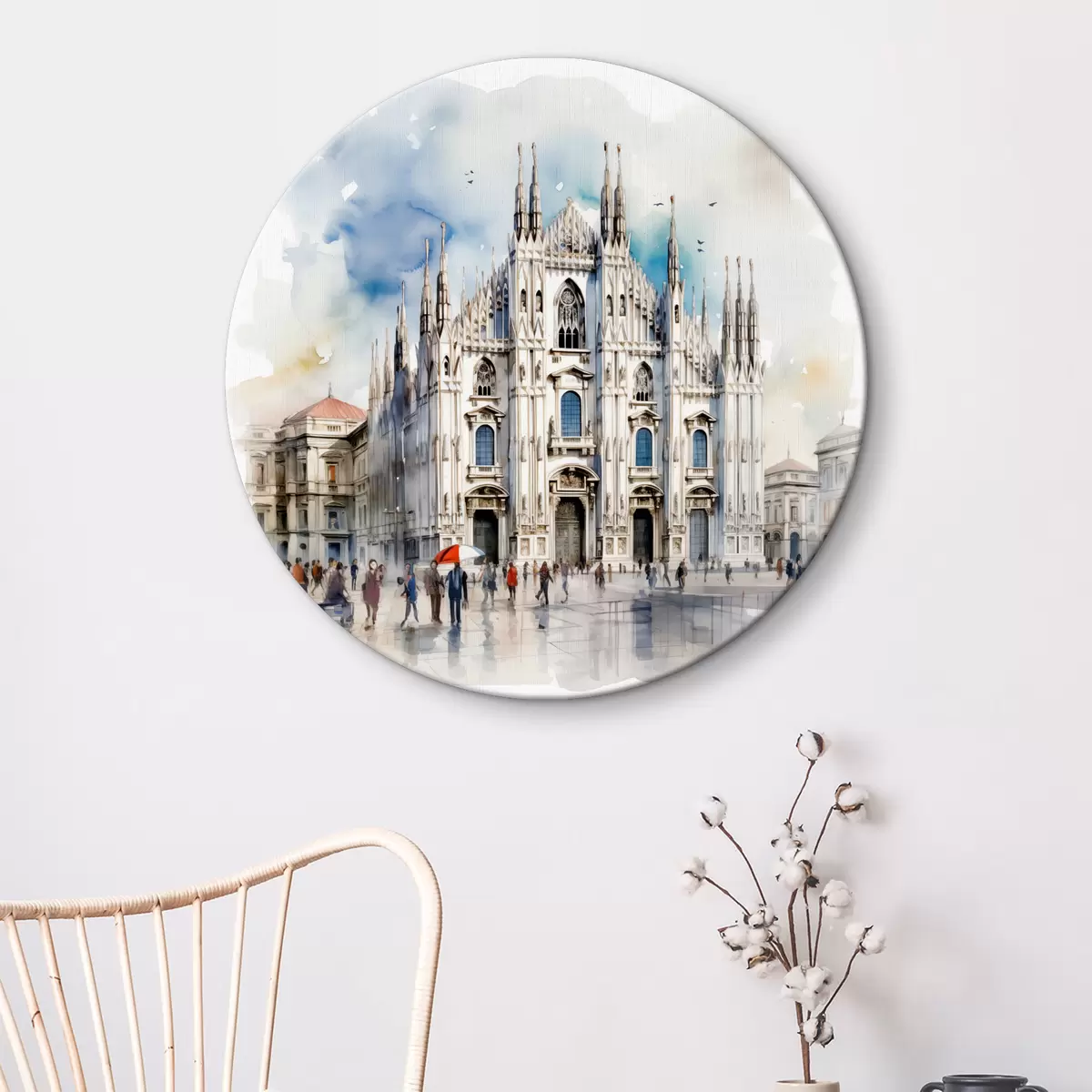 Cuadros redondos Catedral del Duomo en Milán, arquitectura, ciudad, lluvia, acuarela, azul, gris, gente caminando r38938