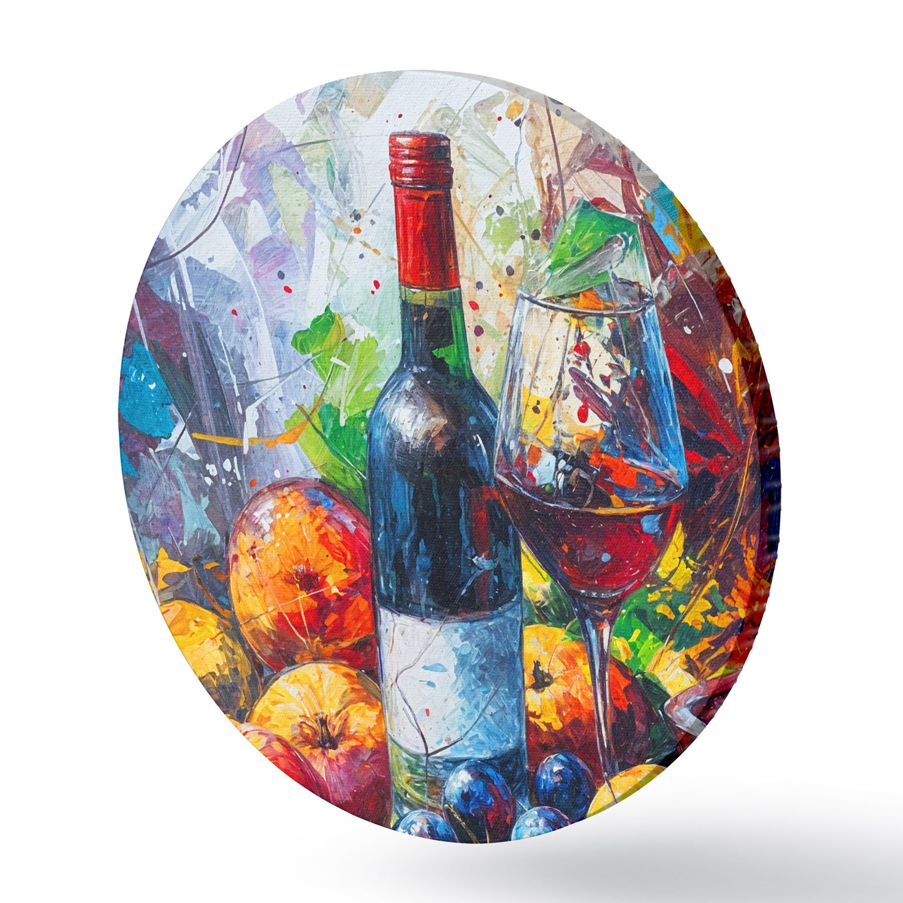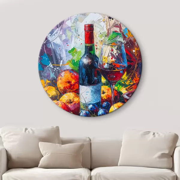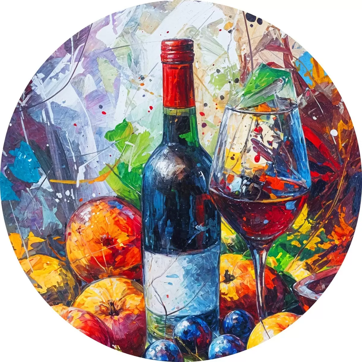 Cuadros redondos Bodegón abstracto con una botella de vino, una copa de vino y frutas coloridas con toques de varios colores r38958