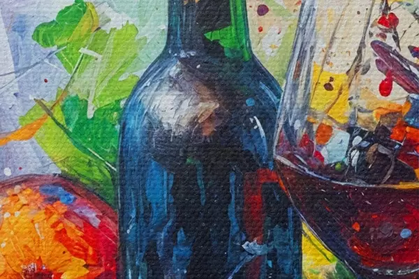 Foto Bodegón abstracto con una botella de vino, una copa de vino y frutas coloridas con toques de varios colores Nr r38958