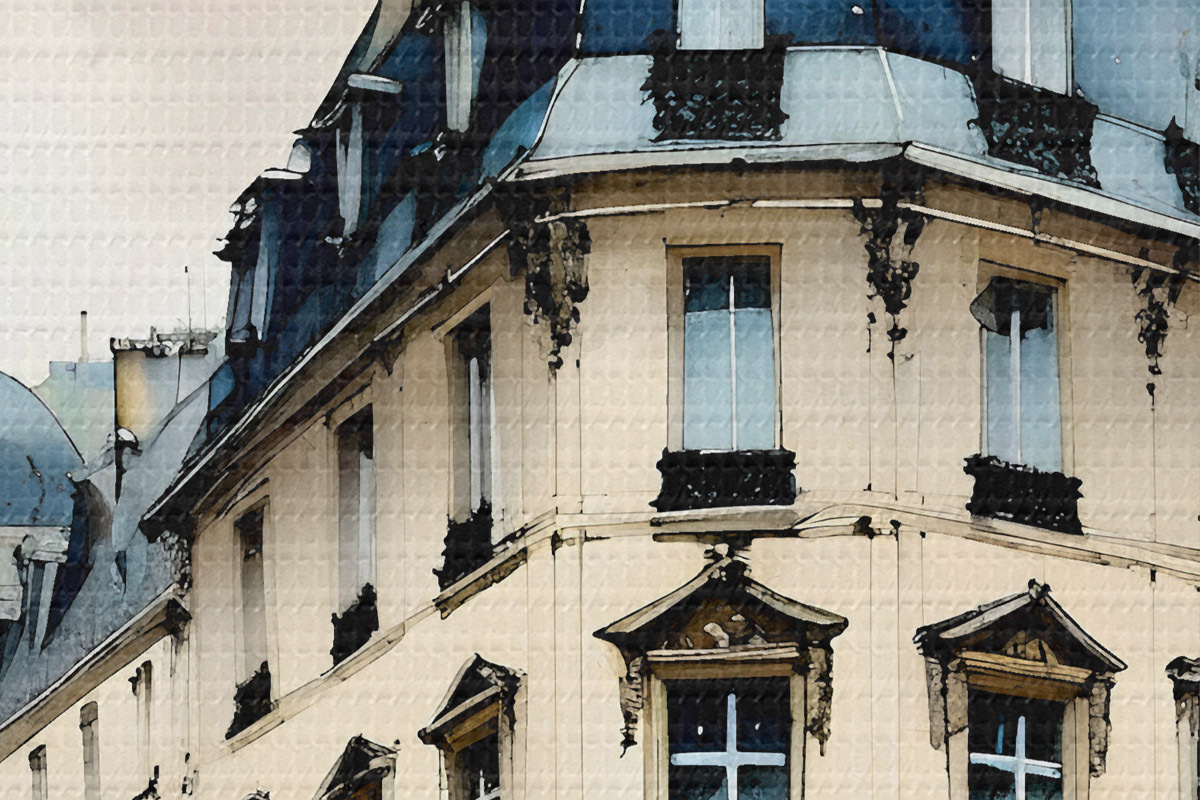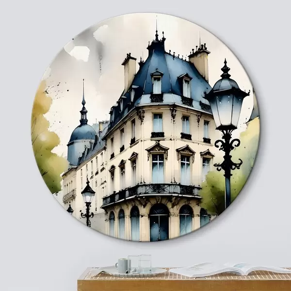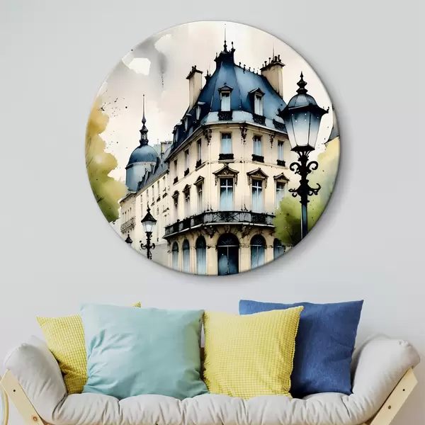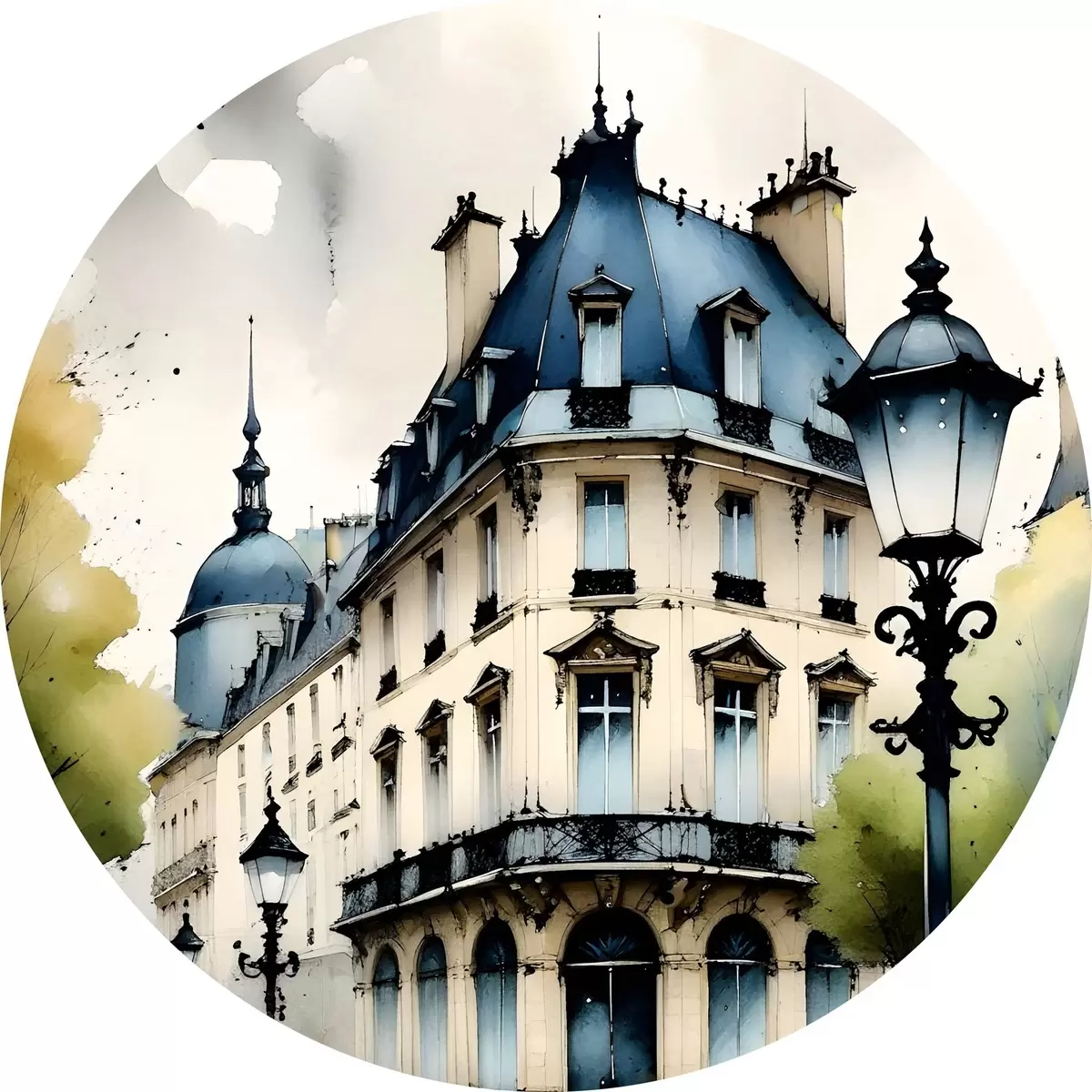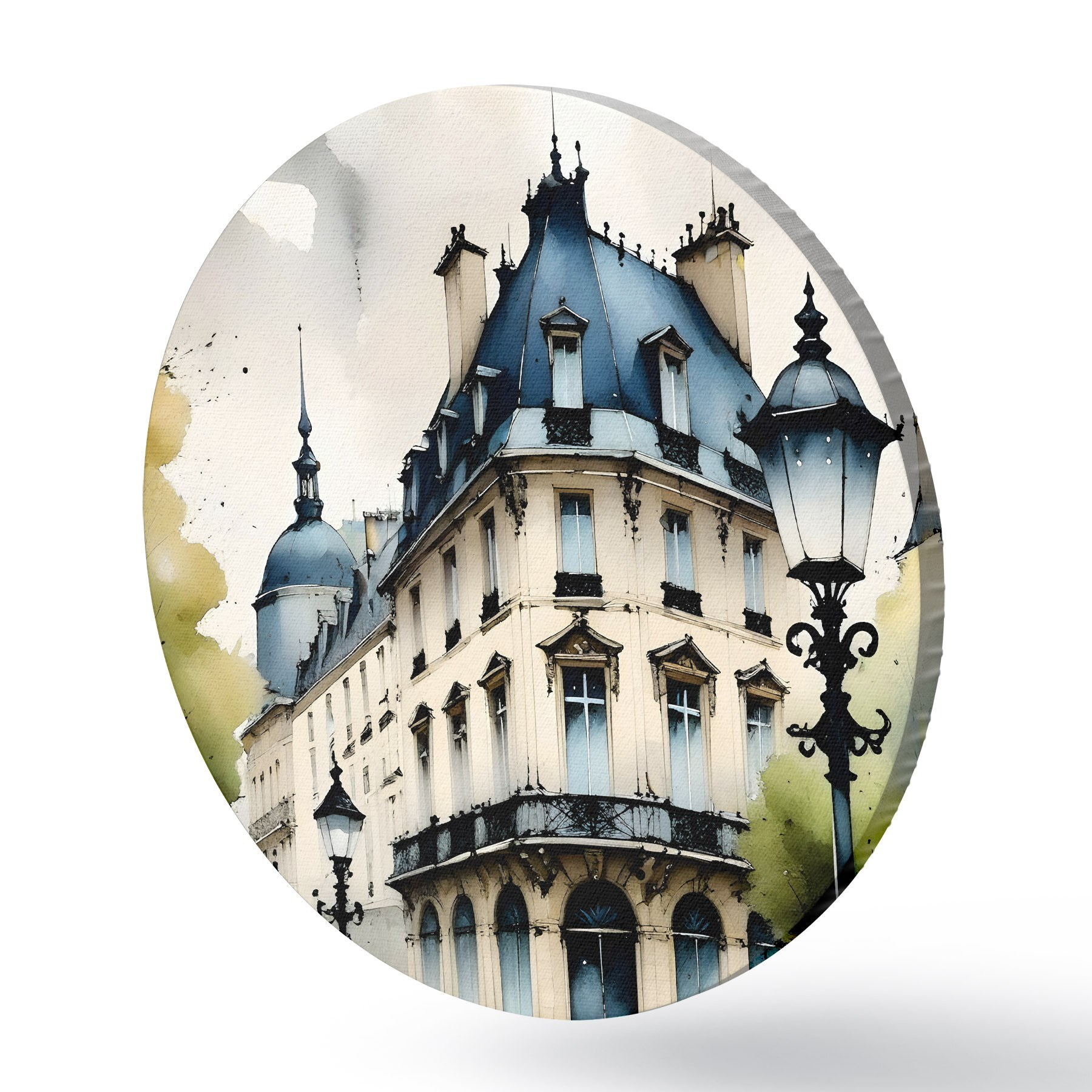 Cuadros redondos Pintura acuarela de un edificio histórico con fachada curva y elementos arquitectónicos decorativos r38975