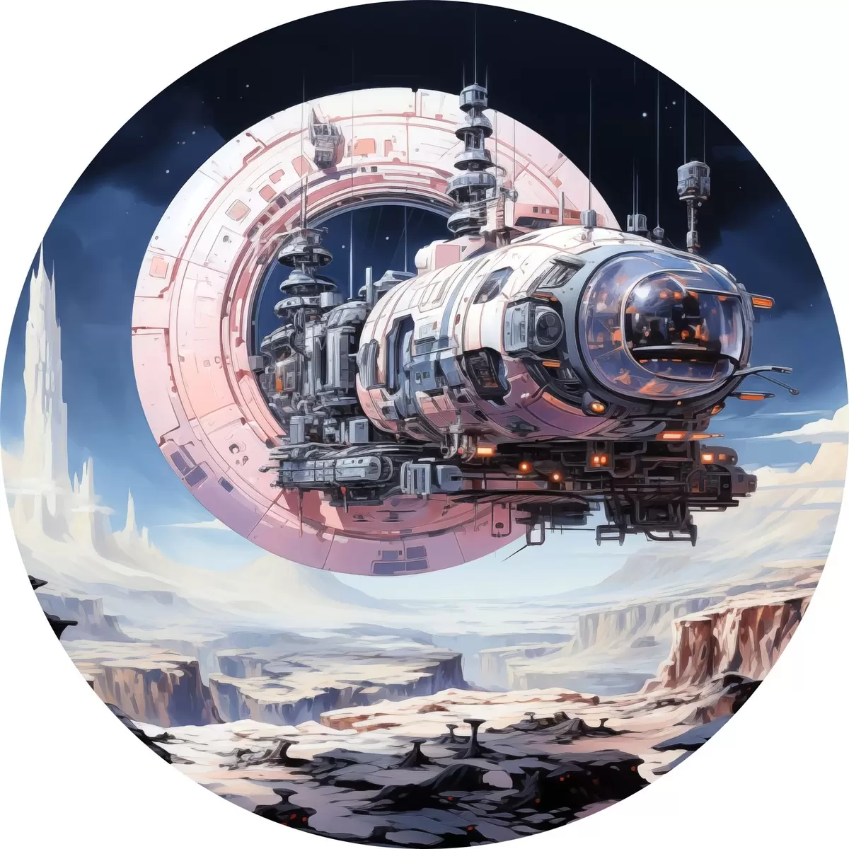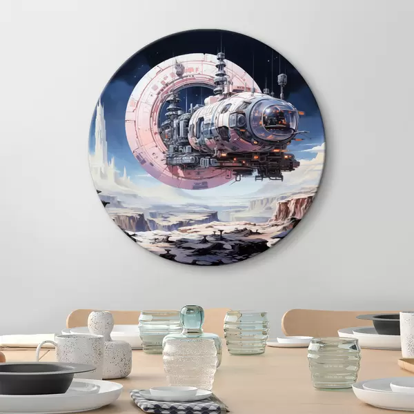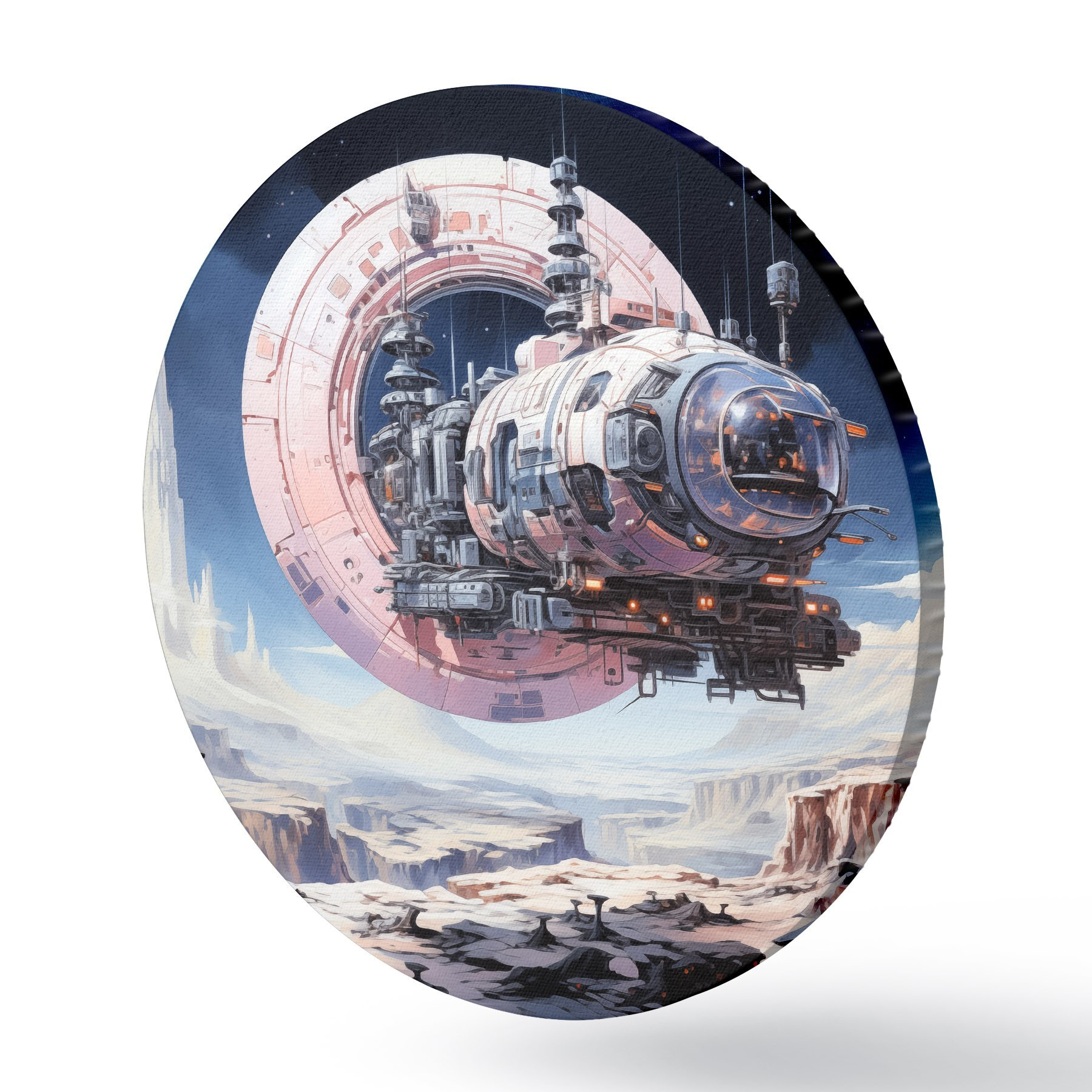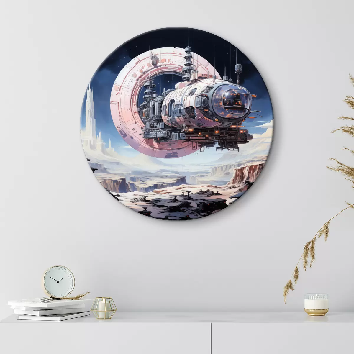 Cuadros redondos Una nave espacial al estilo cyberpunk vuela en el espacio sobre un asteroide y un planeta, de color azul, beige, rosa y blanco r39115