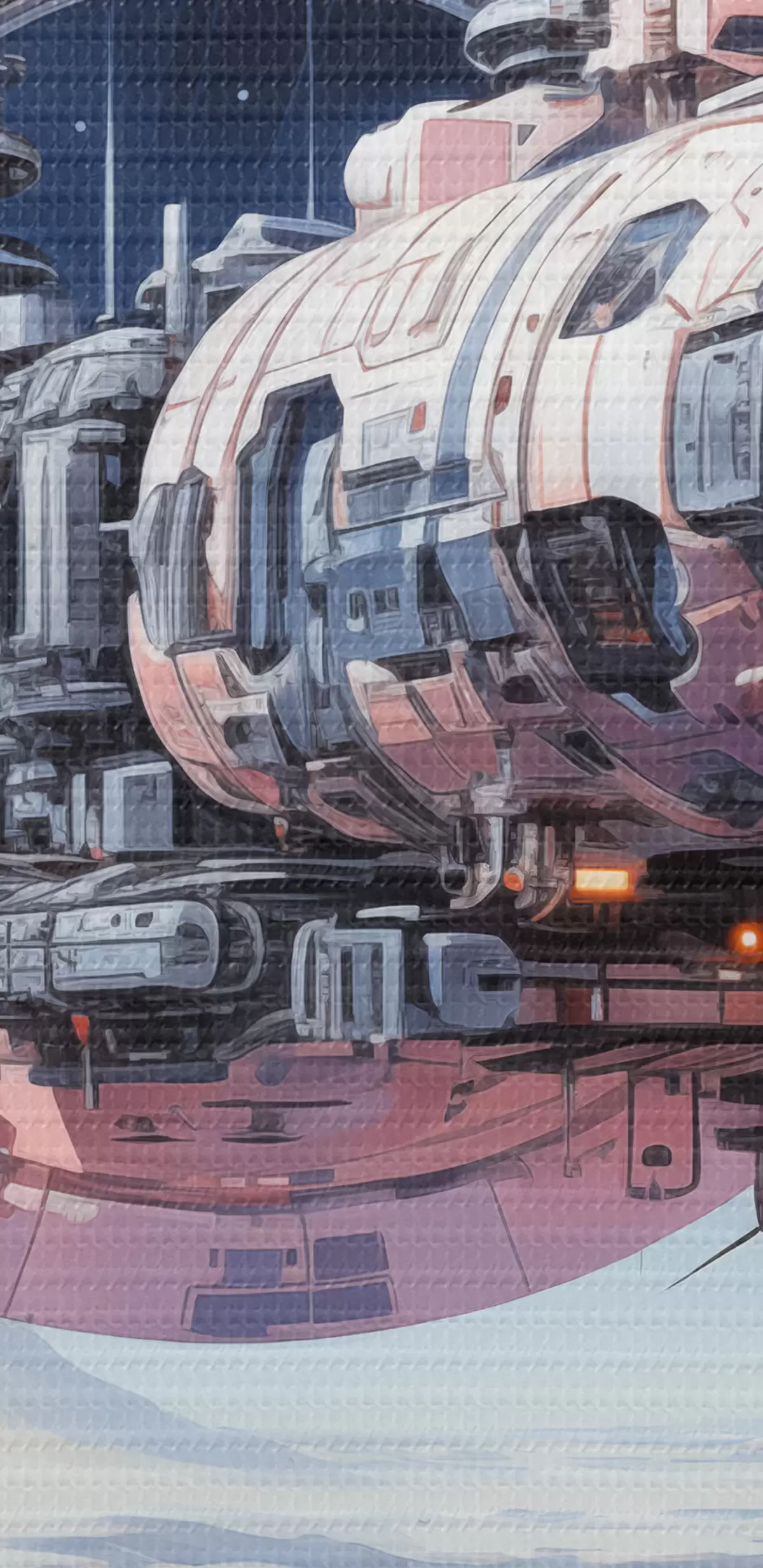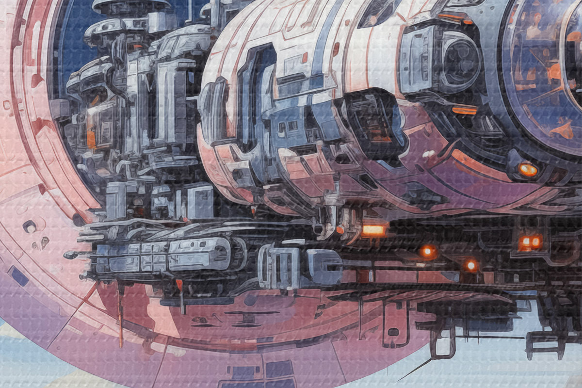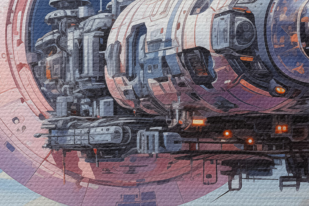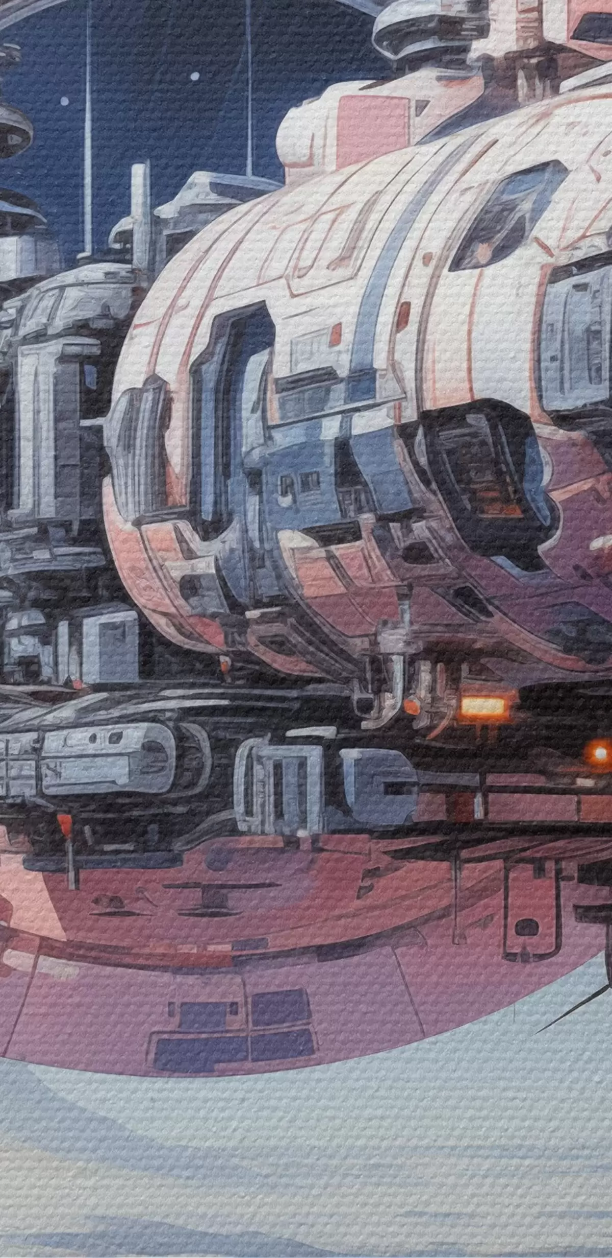 Cuadros redondos Una nave espacial al estilo cyberpunk vuela en el espacio sobre un asteroide y un planeta, de color azul, beige, rosa y blanco r39115