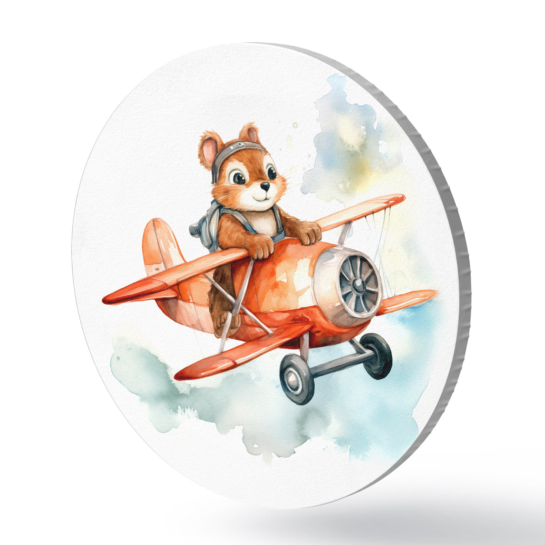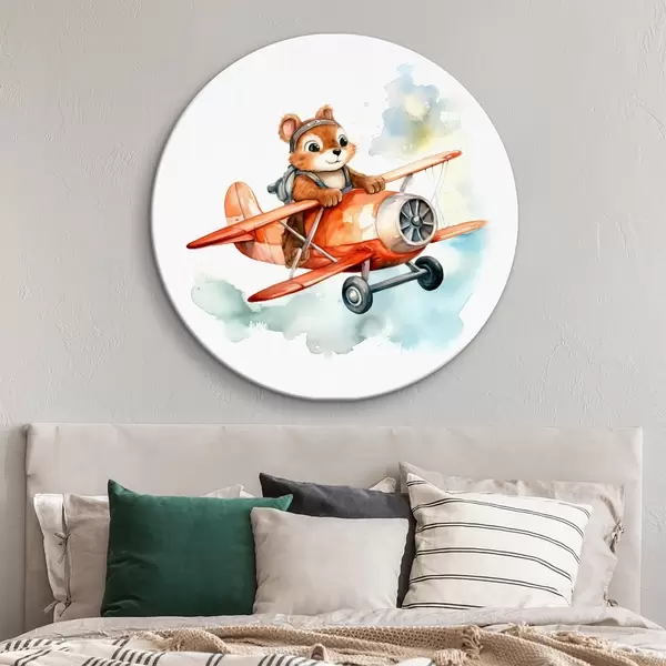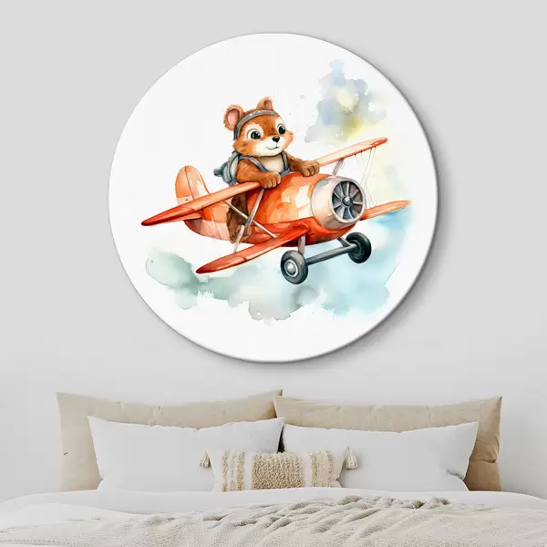 Cuadros redondos Ardilla bebé vuela en un avión rojo ilustración infantil acuarela r39116