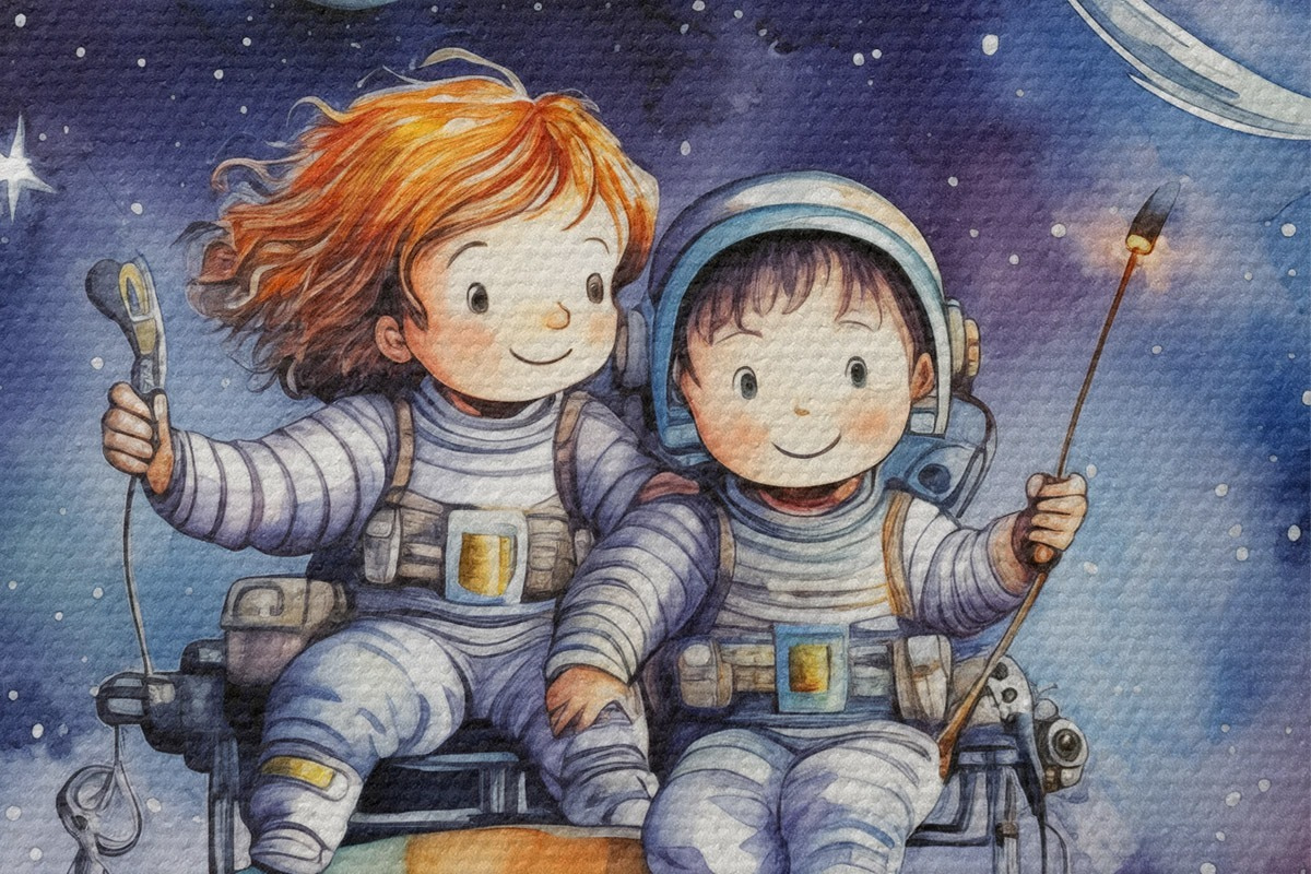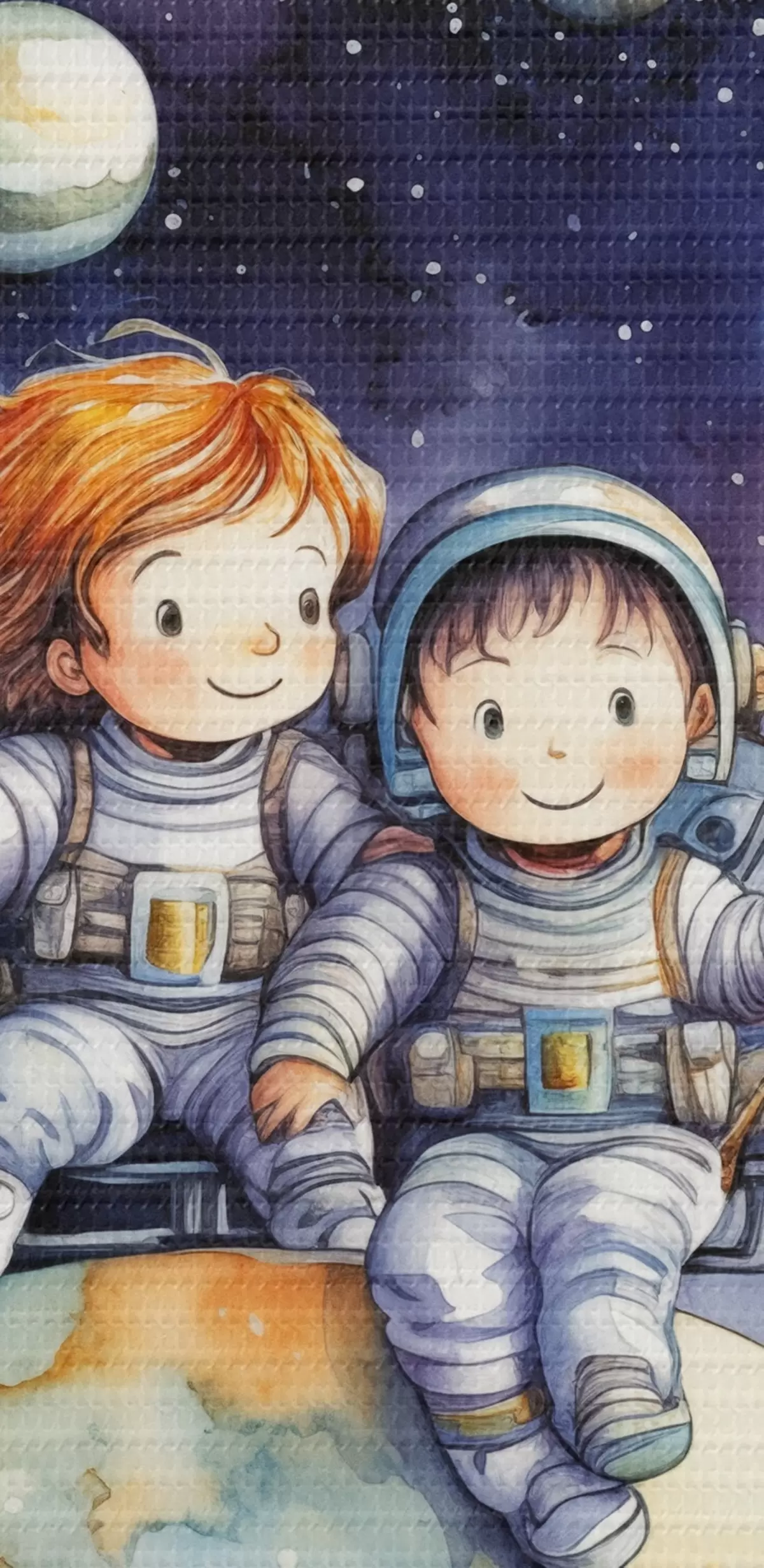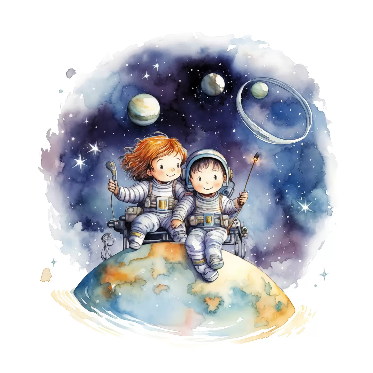 Foto Niños en trajes espaciales sentados en un planeta en el espacio ilustración de acuarela para niños Nr r39117