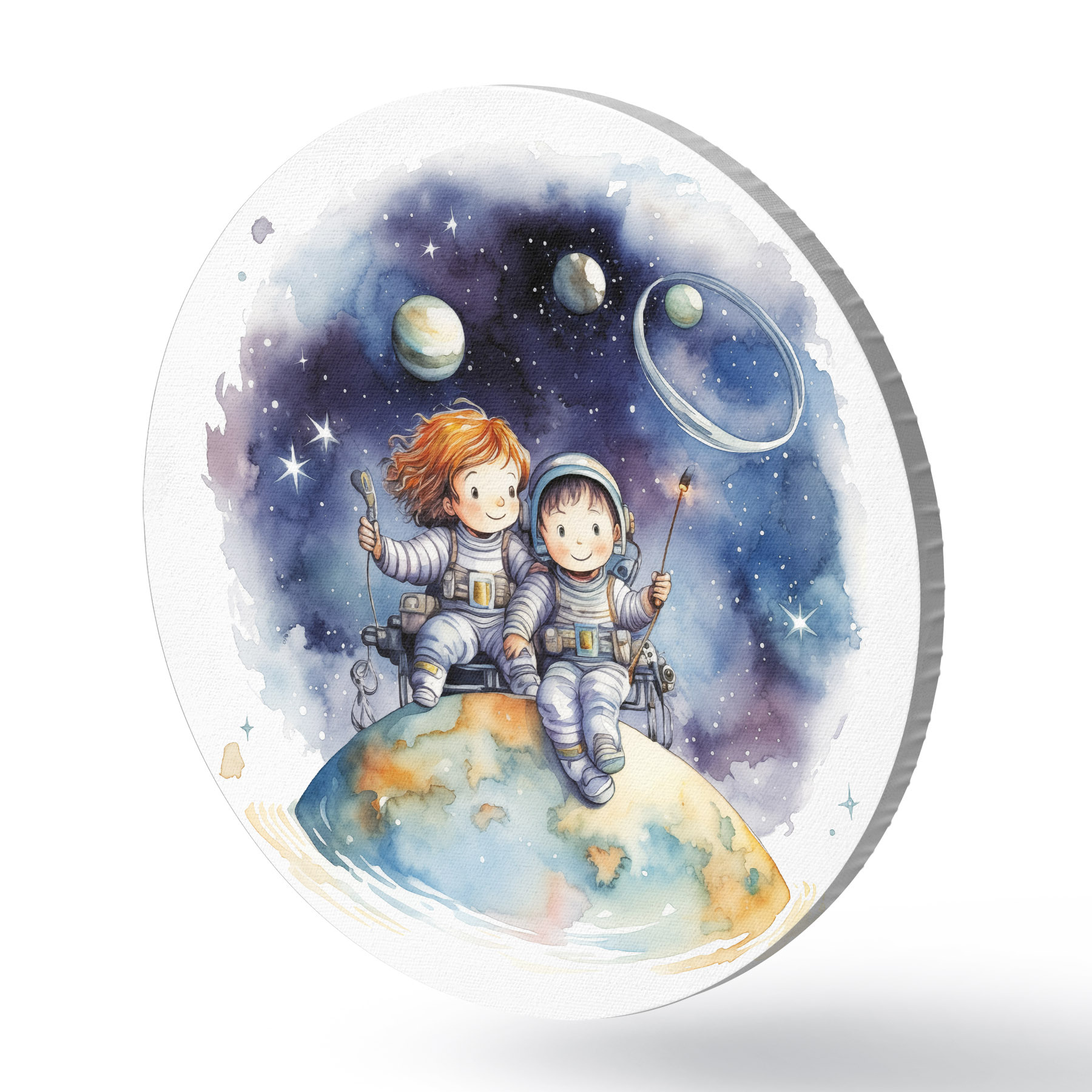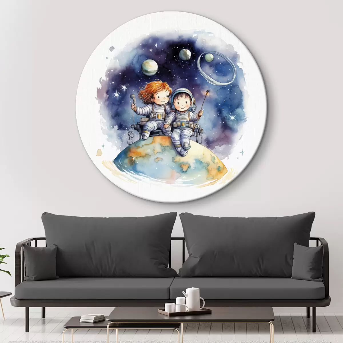 Cuadros redondos Niños en trajes espaciales sentados en un planeta en el espacio ilustración de acuarela para niños r39117