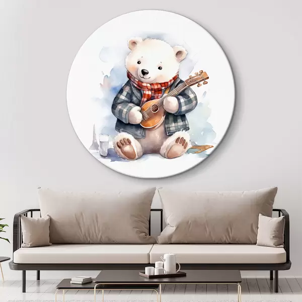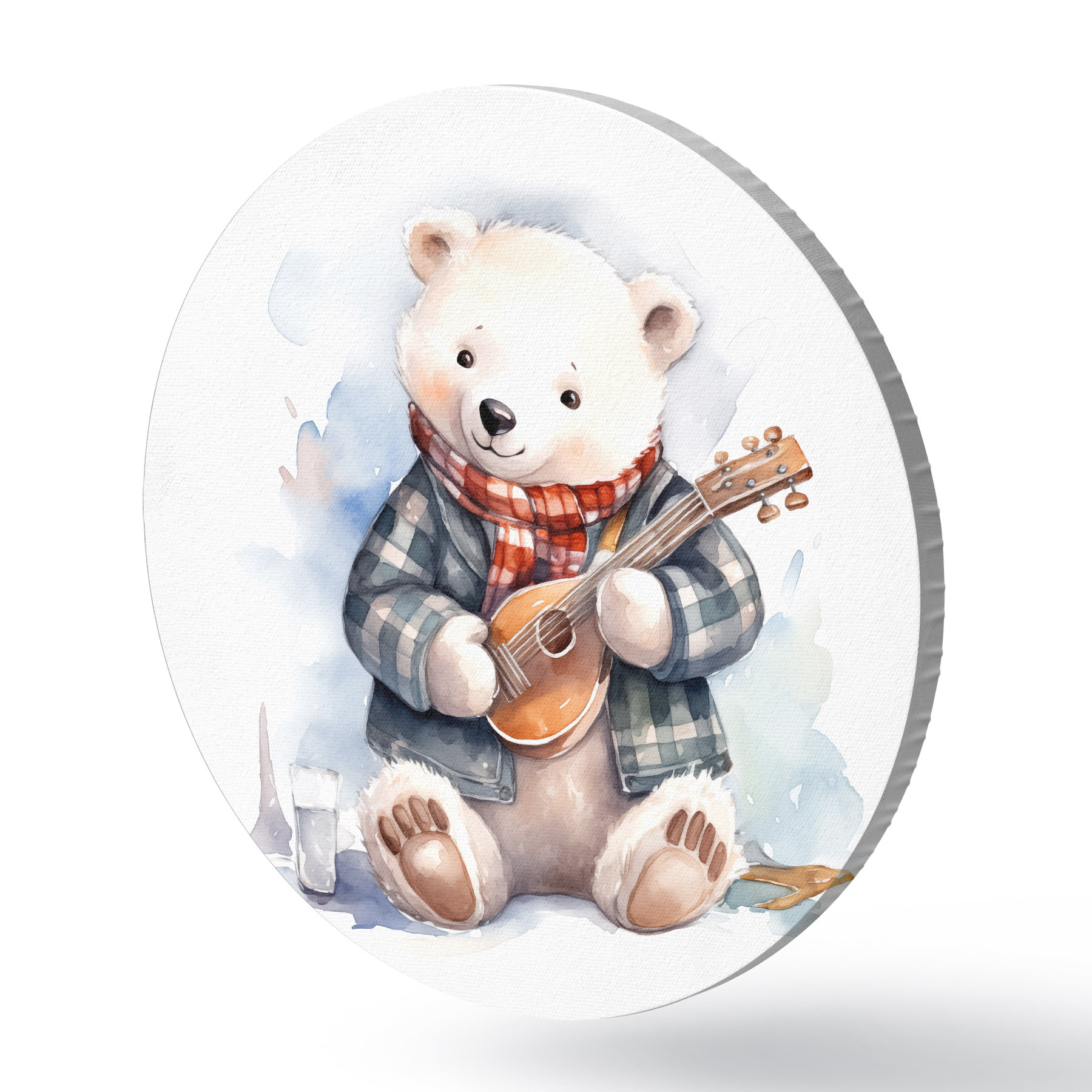 Cuadros redondos Un músico de oso polar con un traje azul a cuadros y una bufanda roja toca la ilustración acuarela de los niños de la guitarra r39120