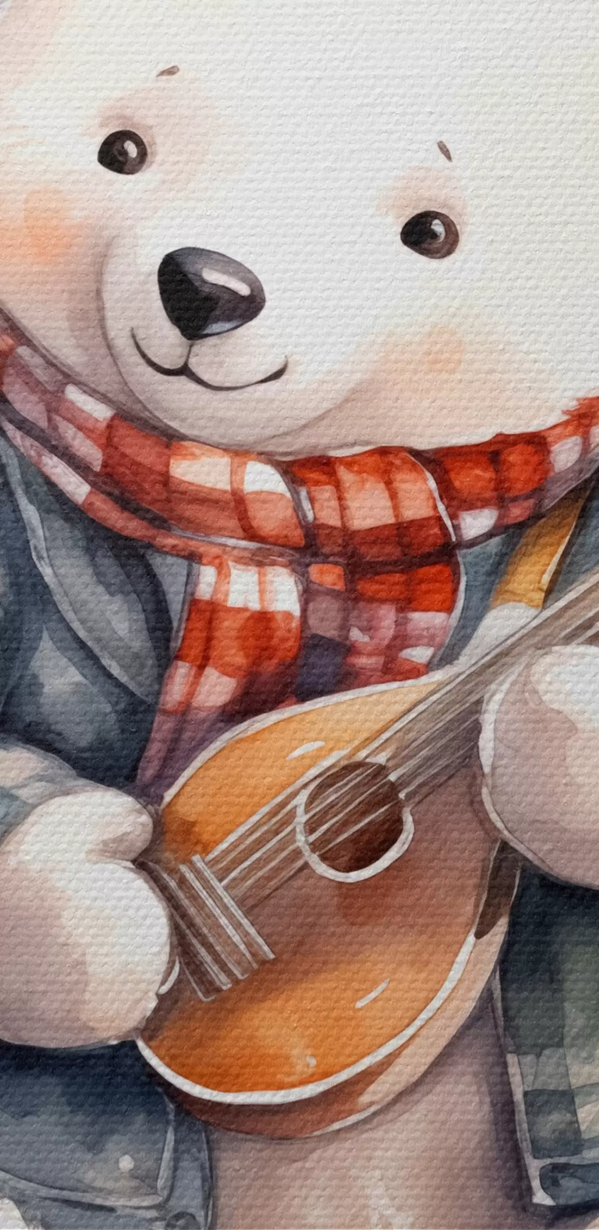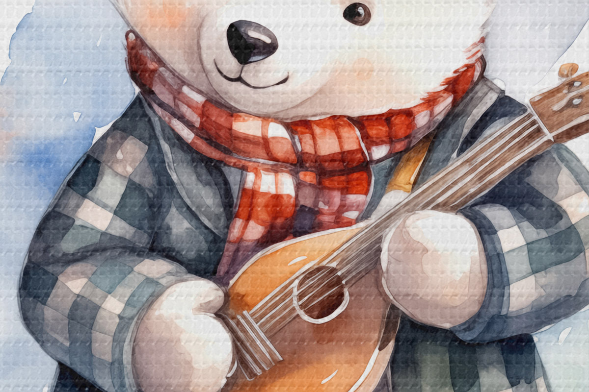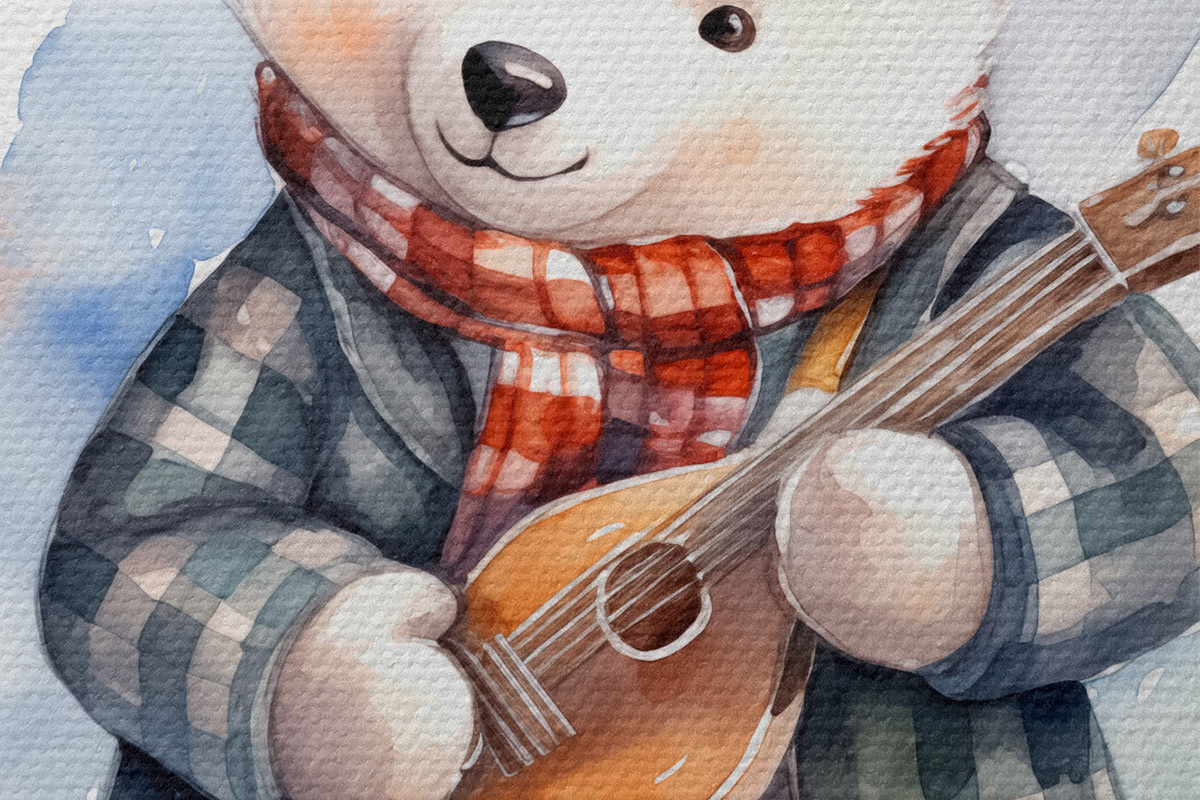 Foto Un músico de oso polar con un traje azul a cuadros y una bufanda roja toca la ilustración acuarela de los niños de la guitarra Nr r39120