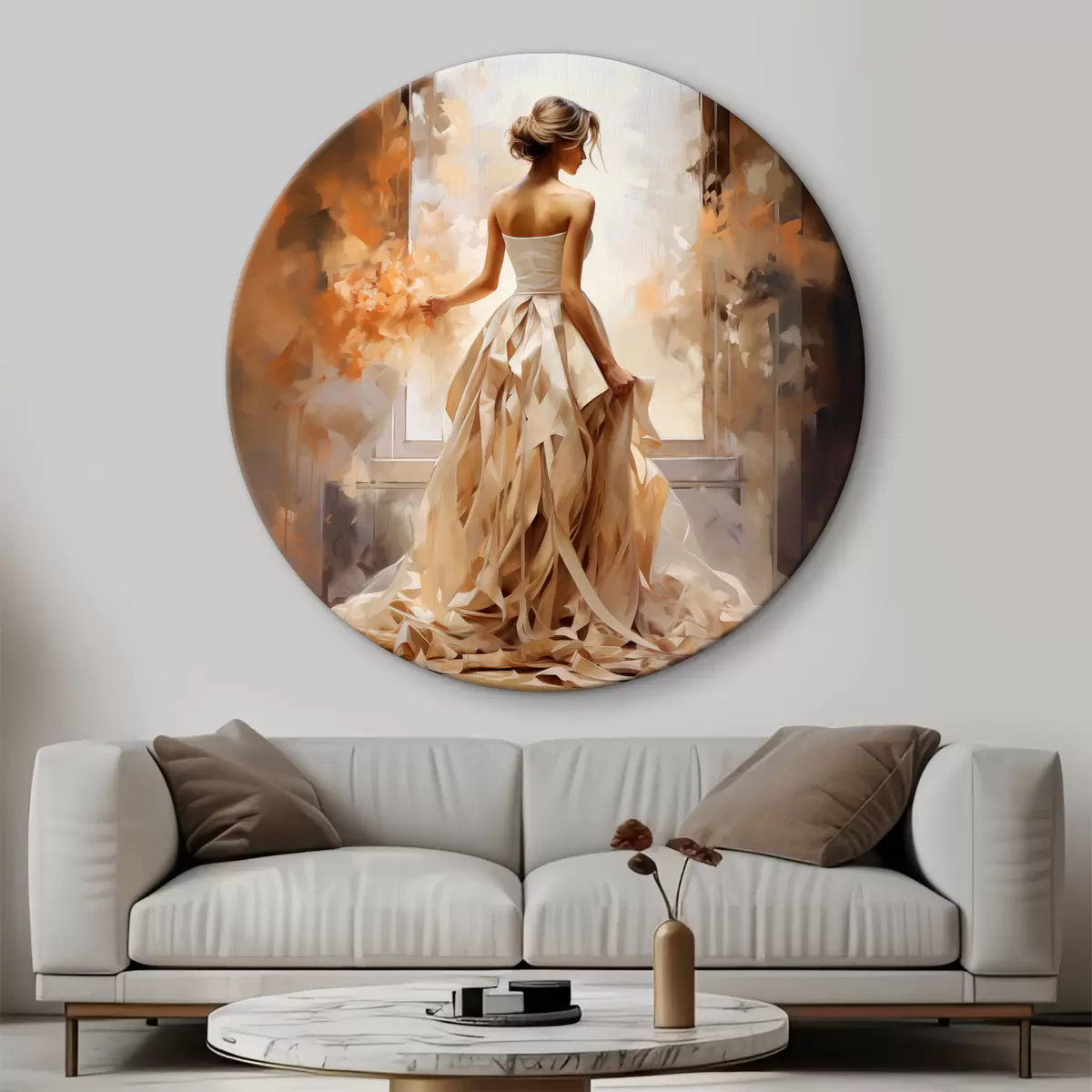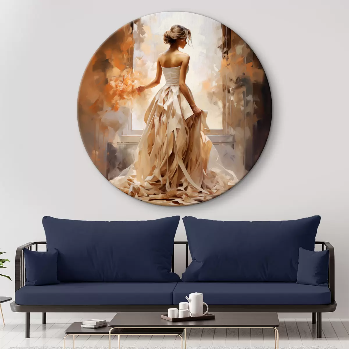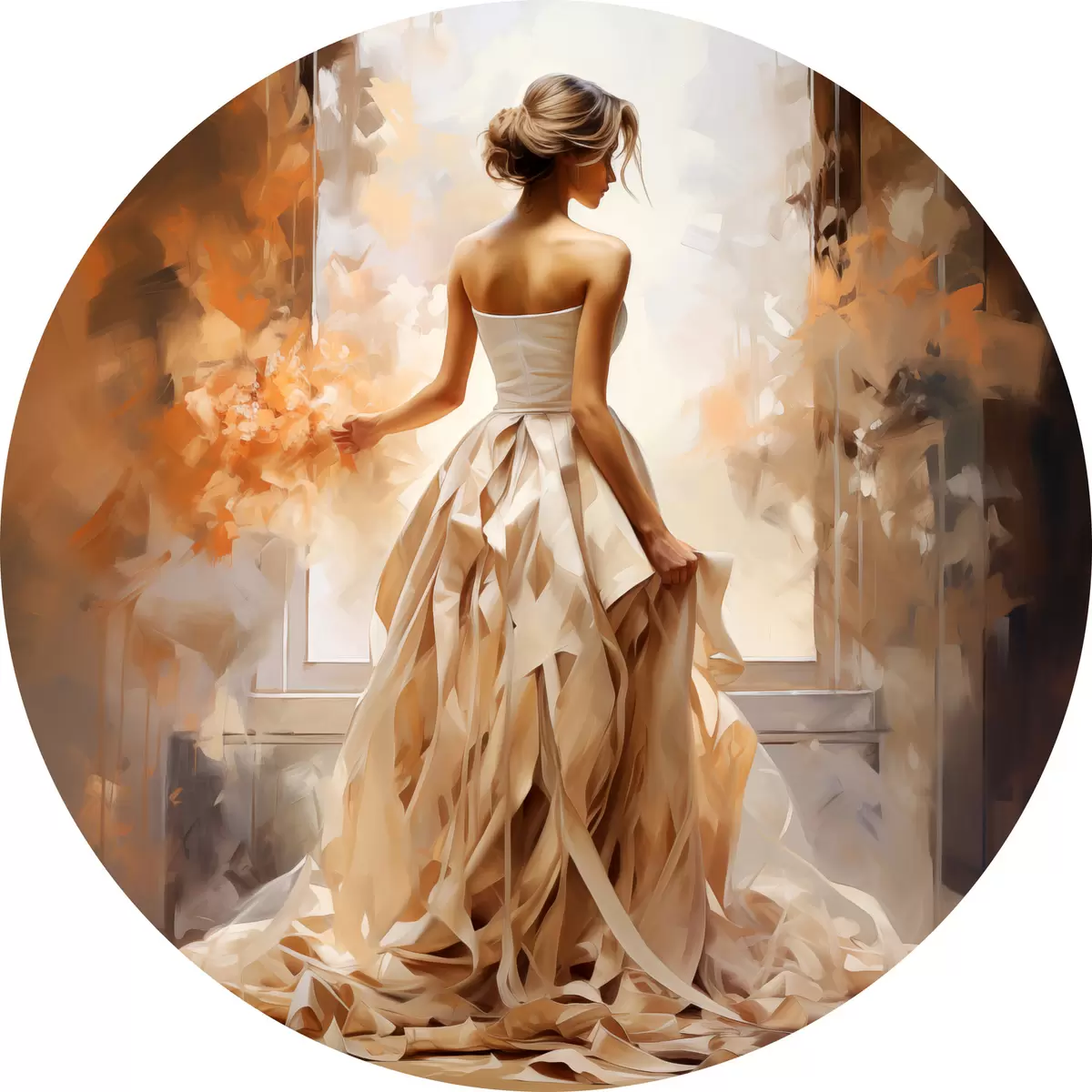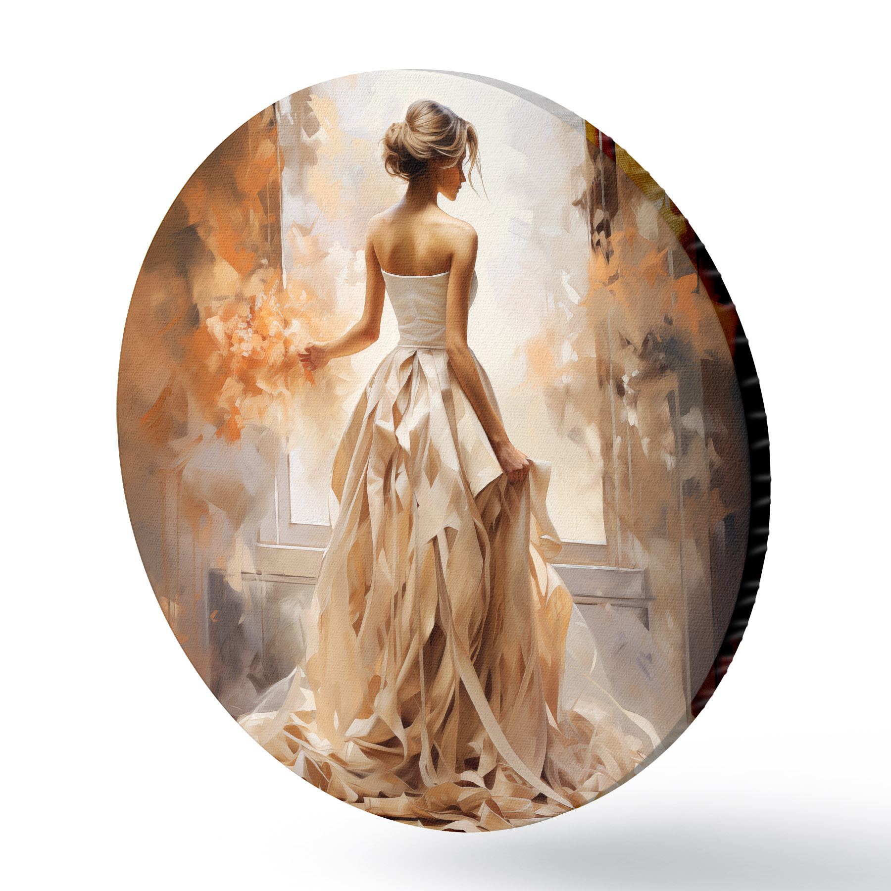 Cuadros redondos Una chica con un vestido largo de novia blanco se encuentra junto a la ventana entre el fuego, pintando con hechos a mano r39125