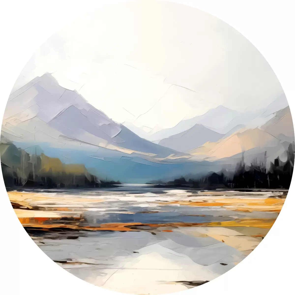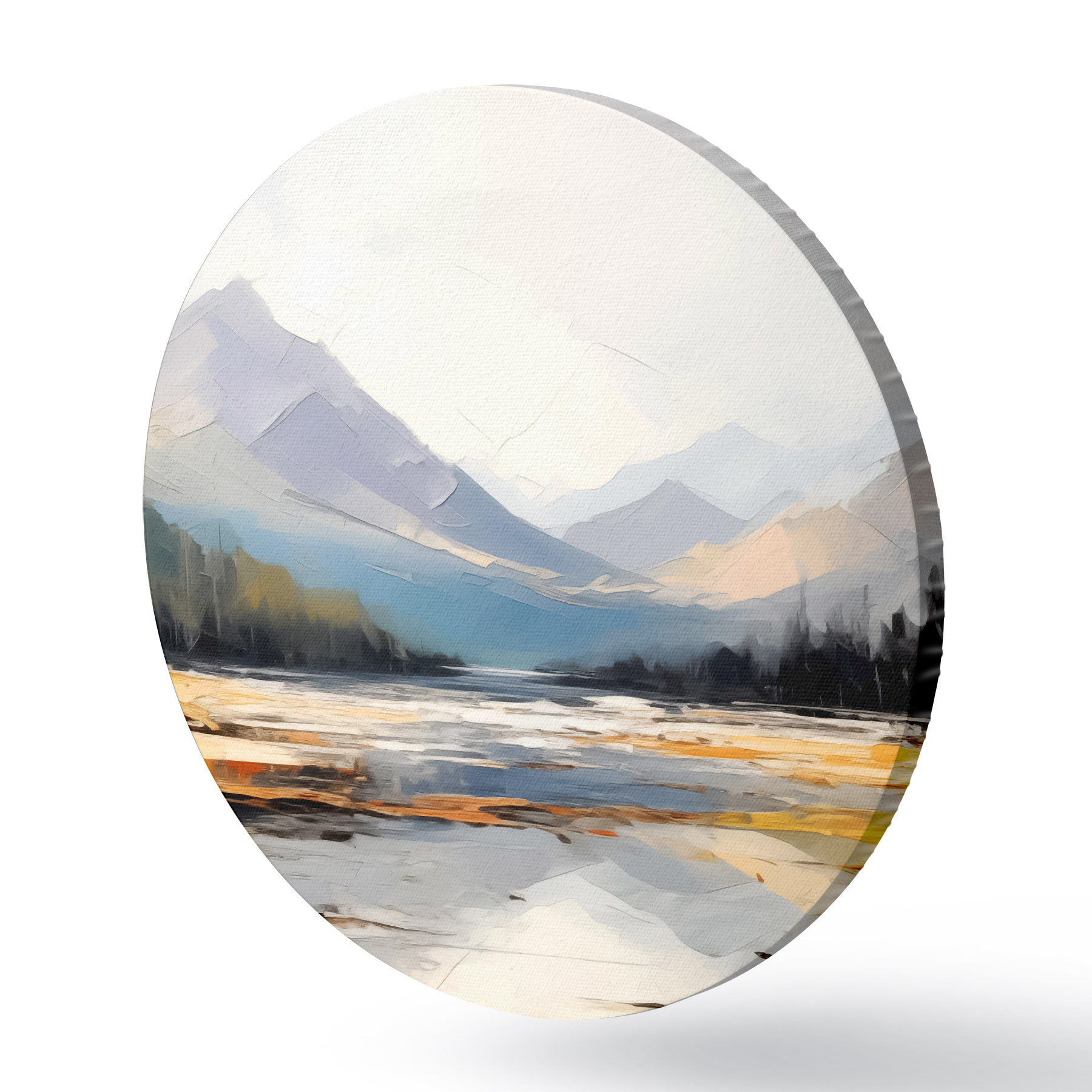 Cuadros redondos Cordilleras en el valle pintura al óleo, paisaje, naturaleza, azul, color amarillo blanco r39128