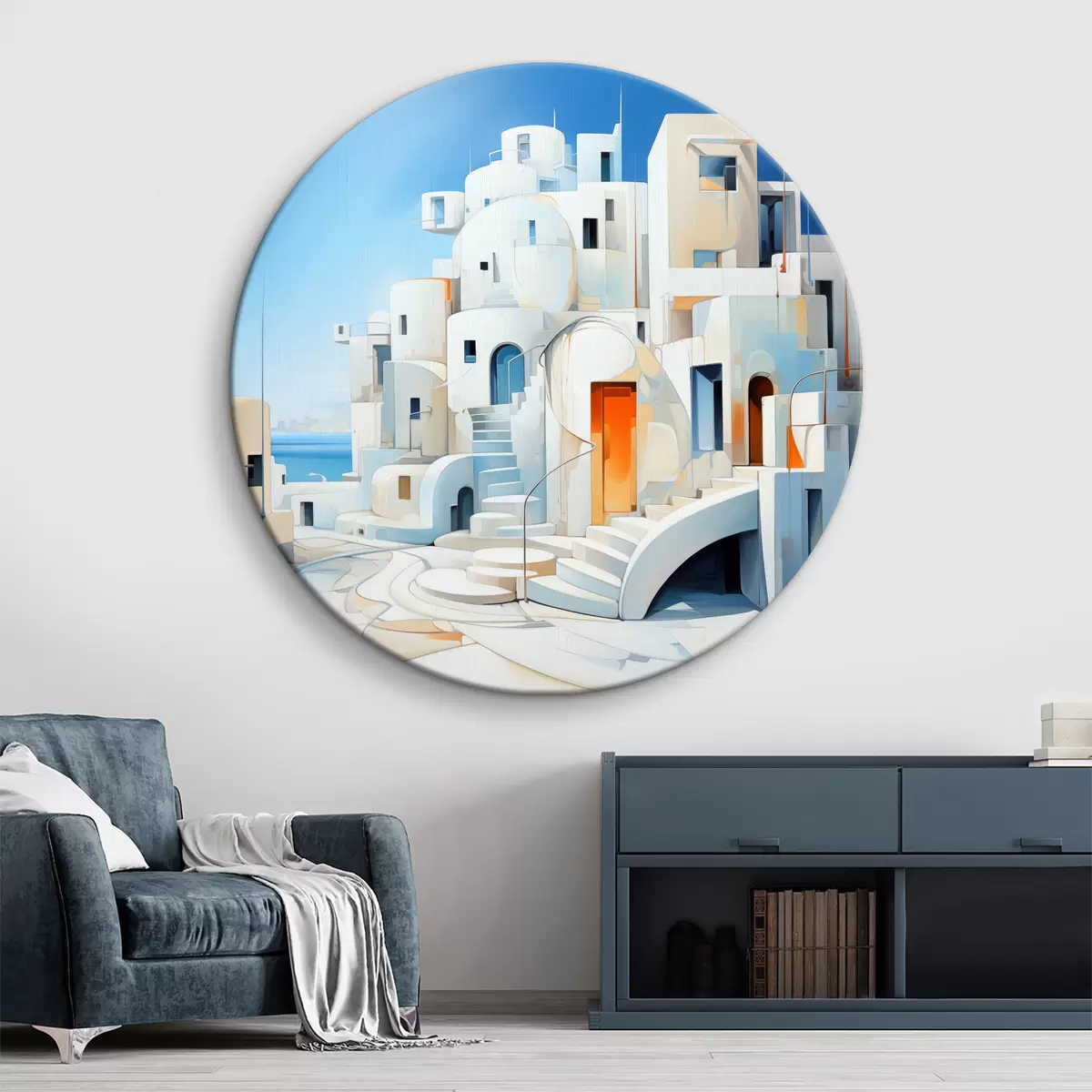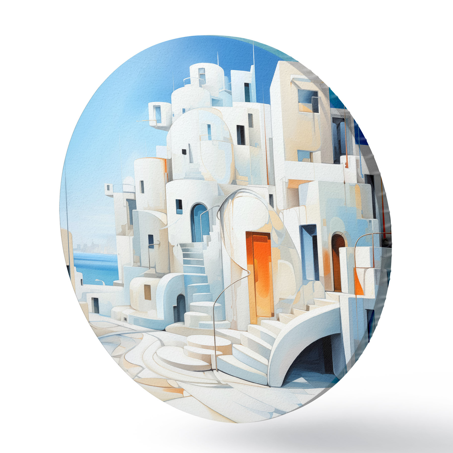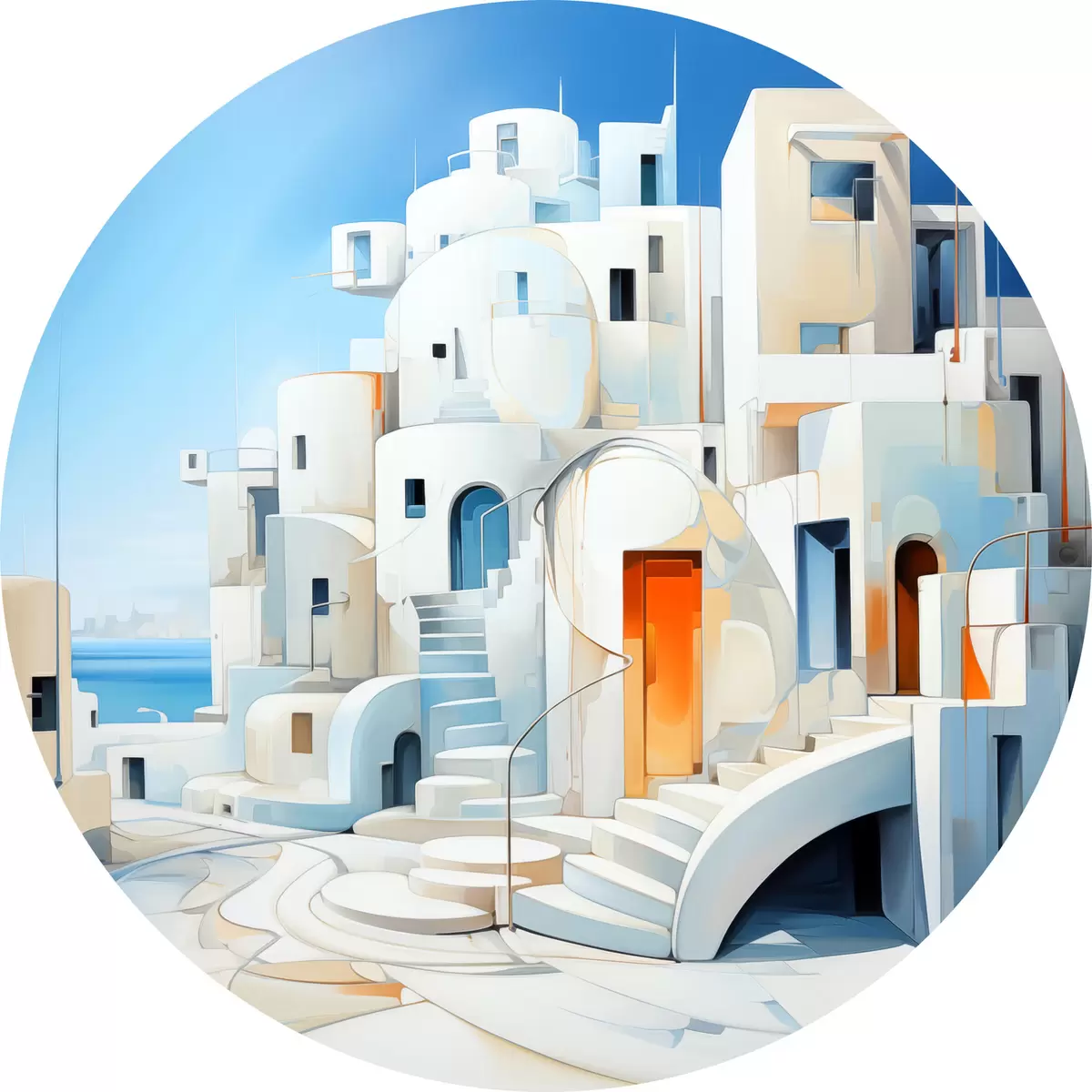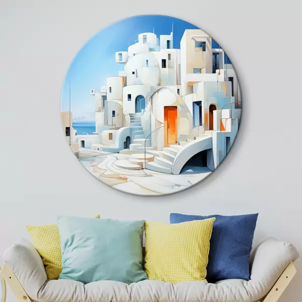 Cuadros redondos Ciudad blanca abstracta junto al mar, arquitectura, edificio, color azul r39188