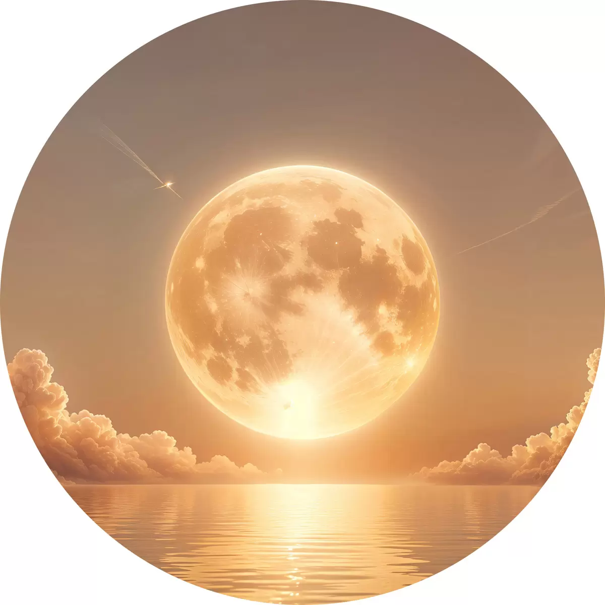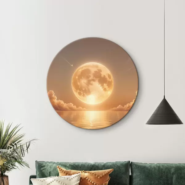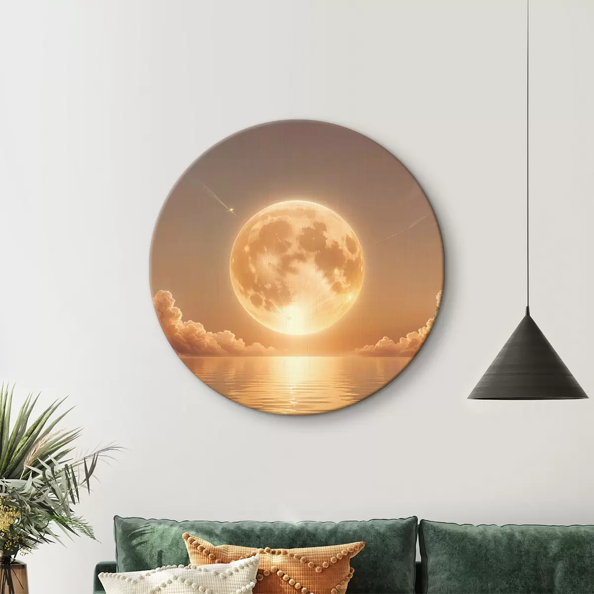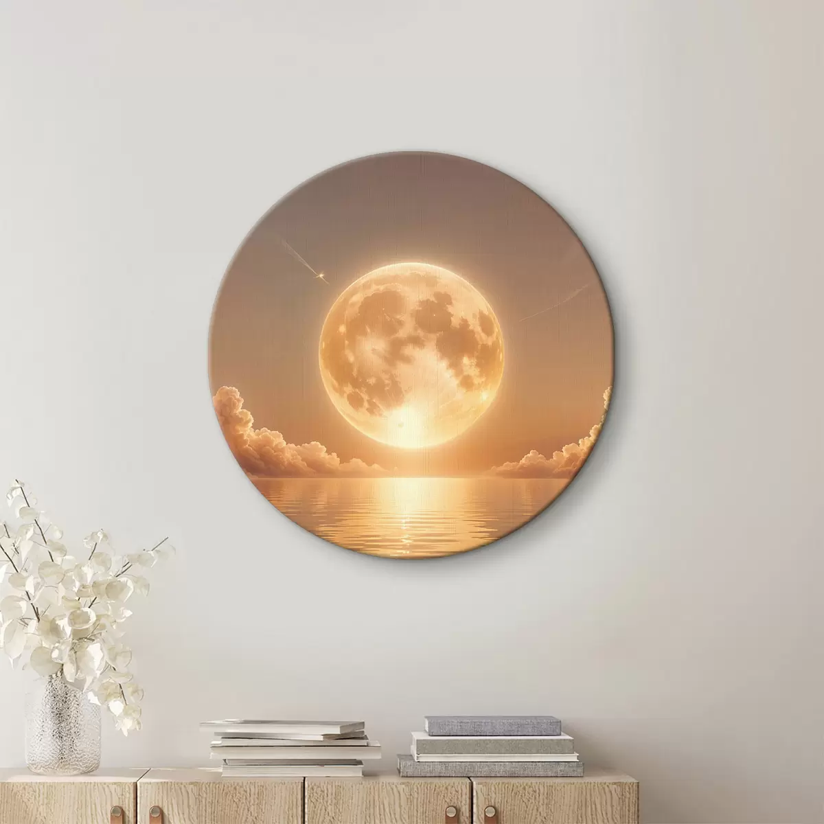 Cuadros redondos Una luna llena grande y brillante que se eleva sobre un océano tranquilo y reflectante al atardecer r39403