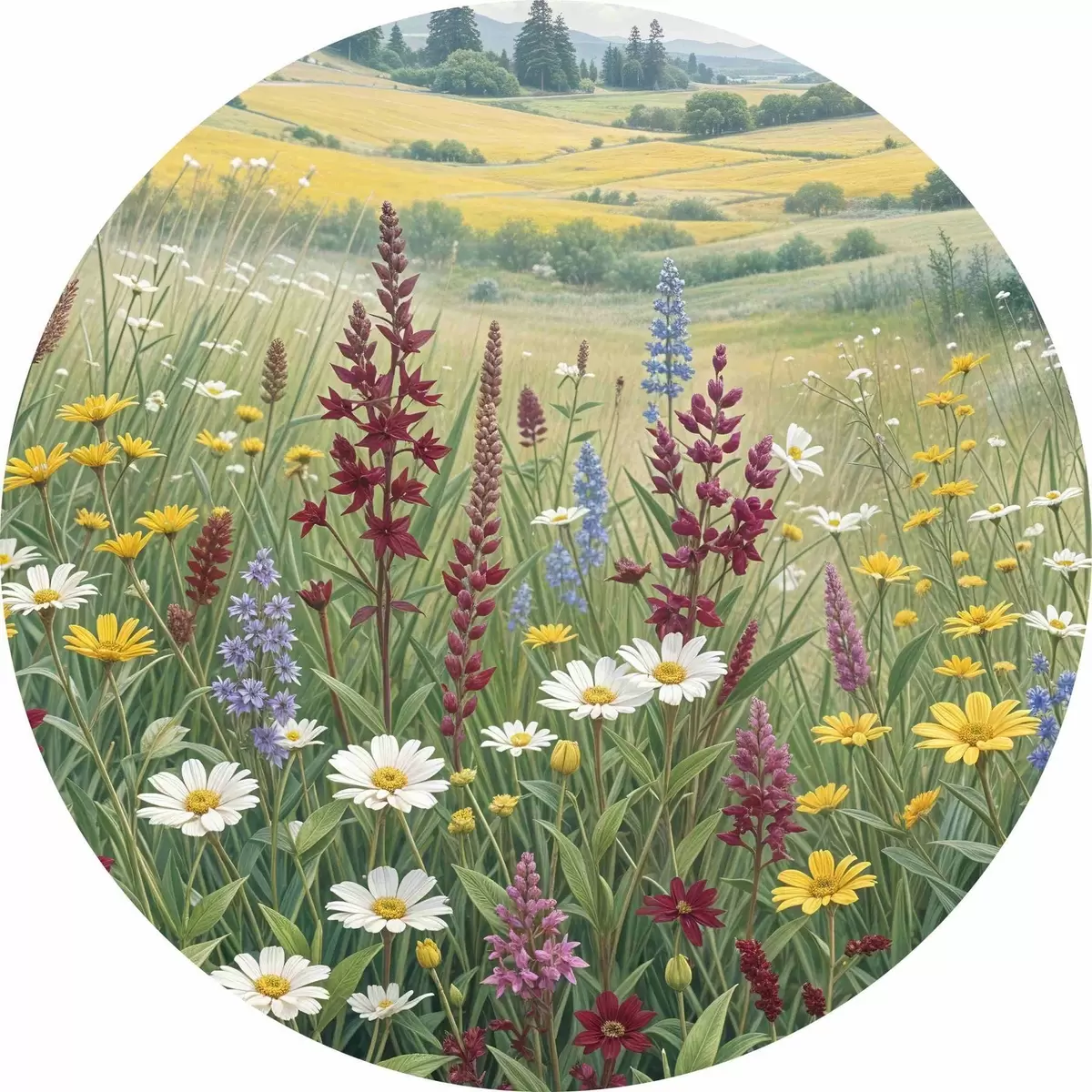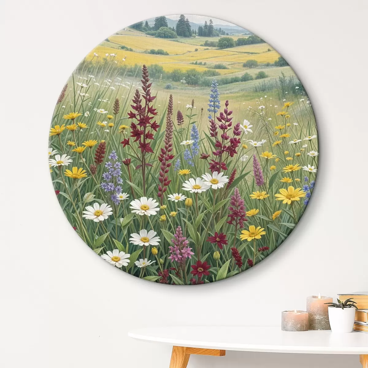 Cuadros redondos Un prado exuberante y colorido lleno de una gran variedad de flores silvestres r39407