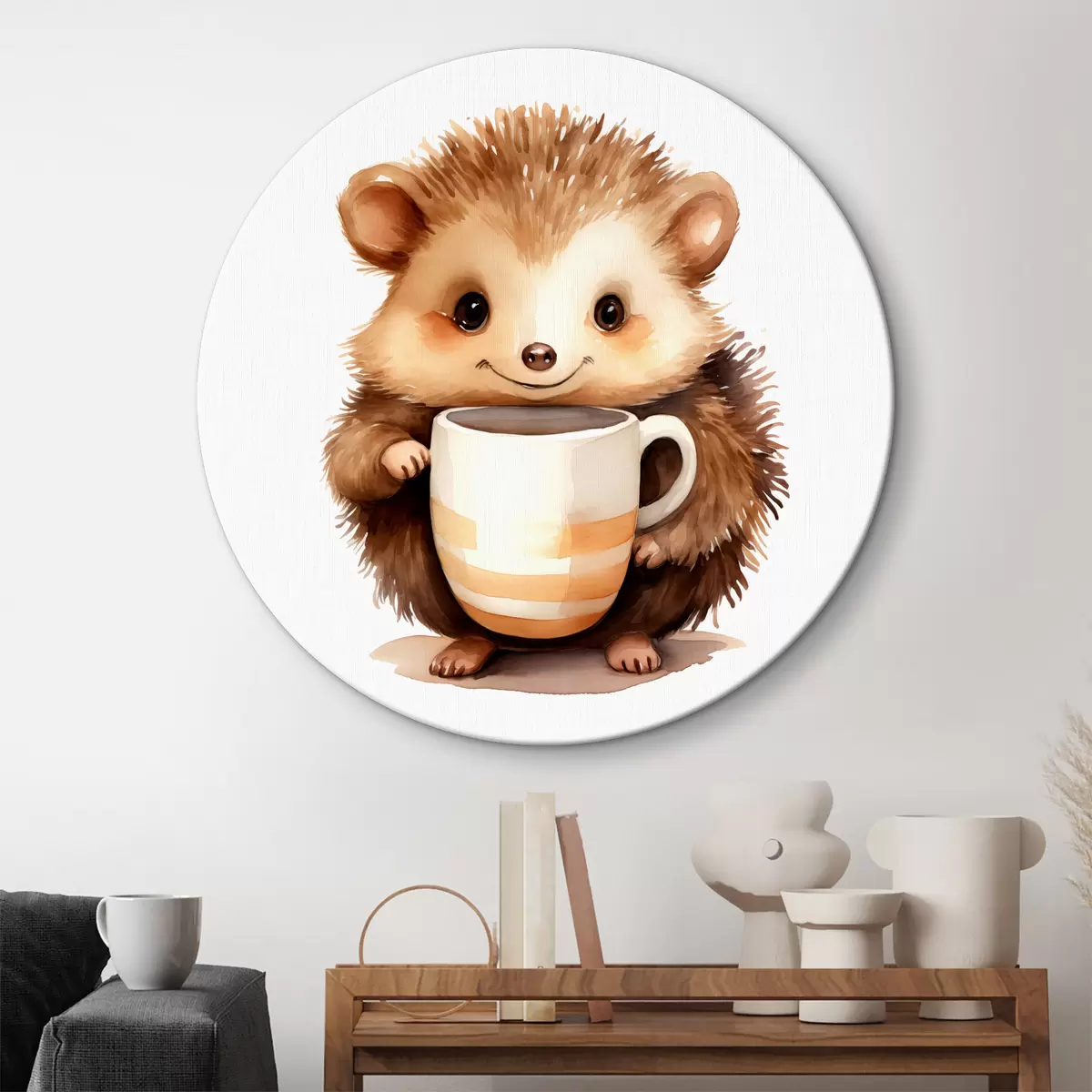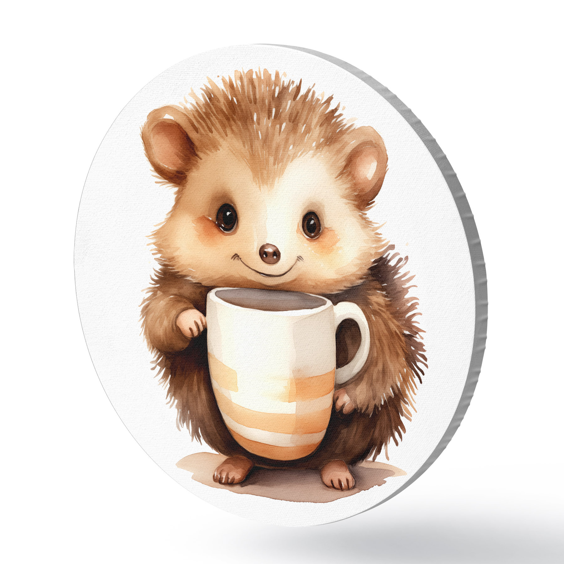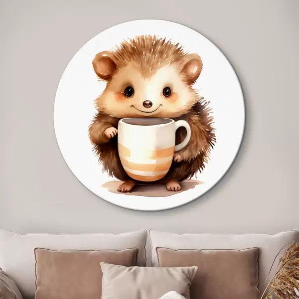 Cuadros redondos Erizo sosteniendo una taza blanca en sus patas ilustración infantil acuarela r39440