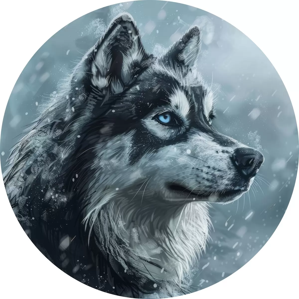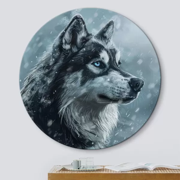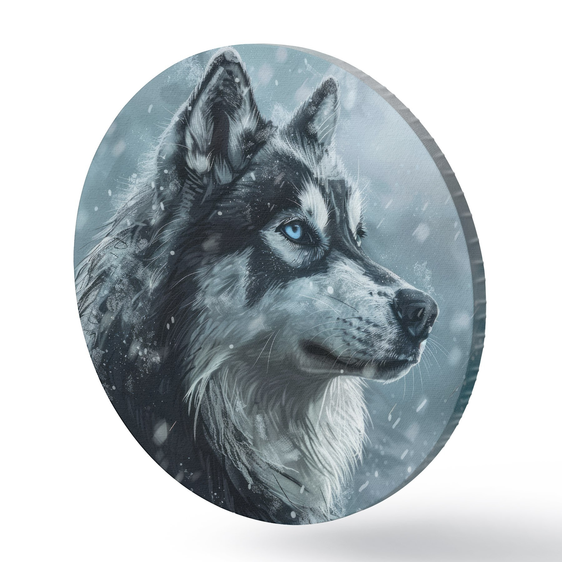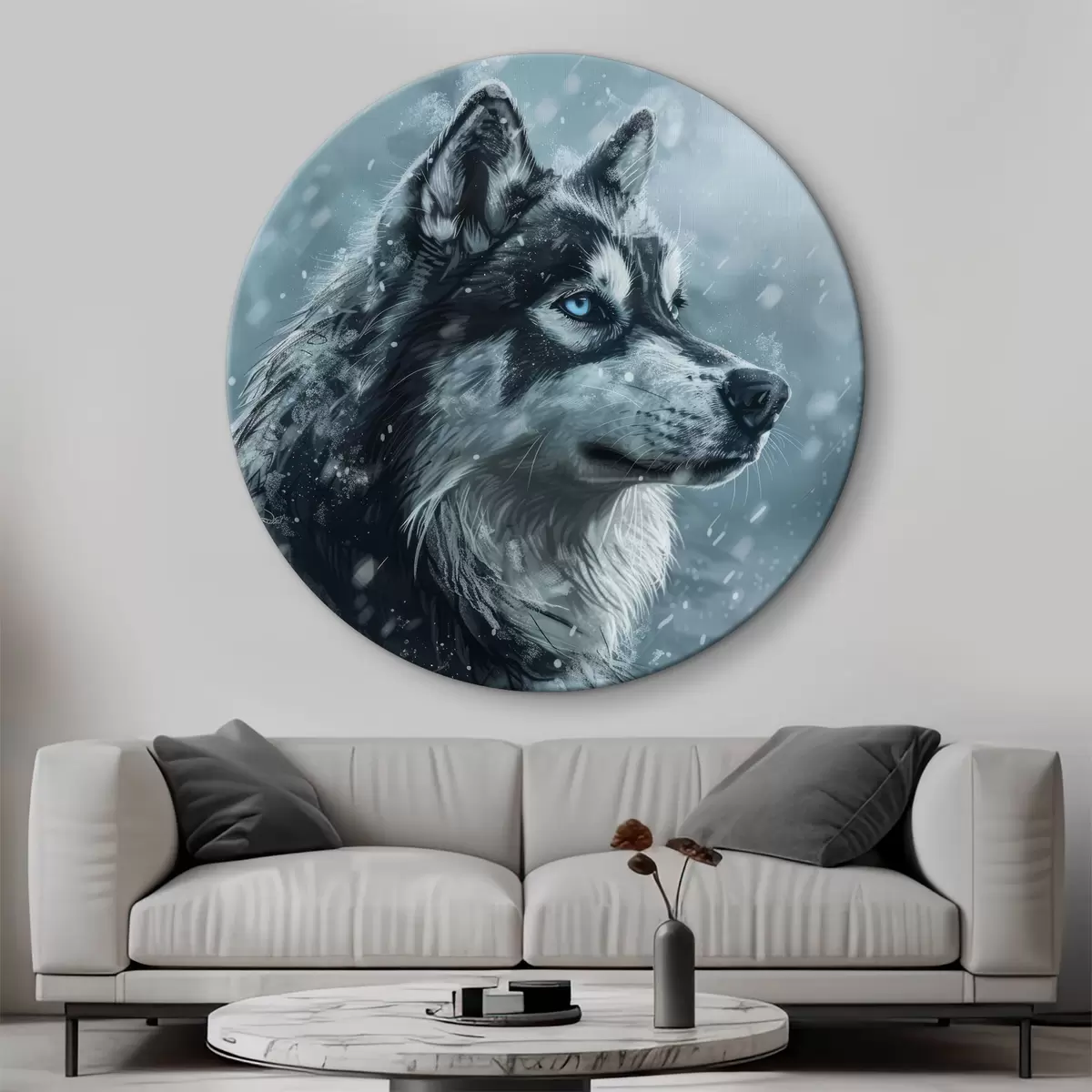 Cuadros redondos Husky con ojos azules sobre fondo azul invernal r39462