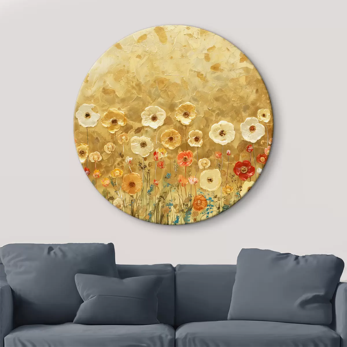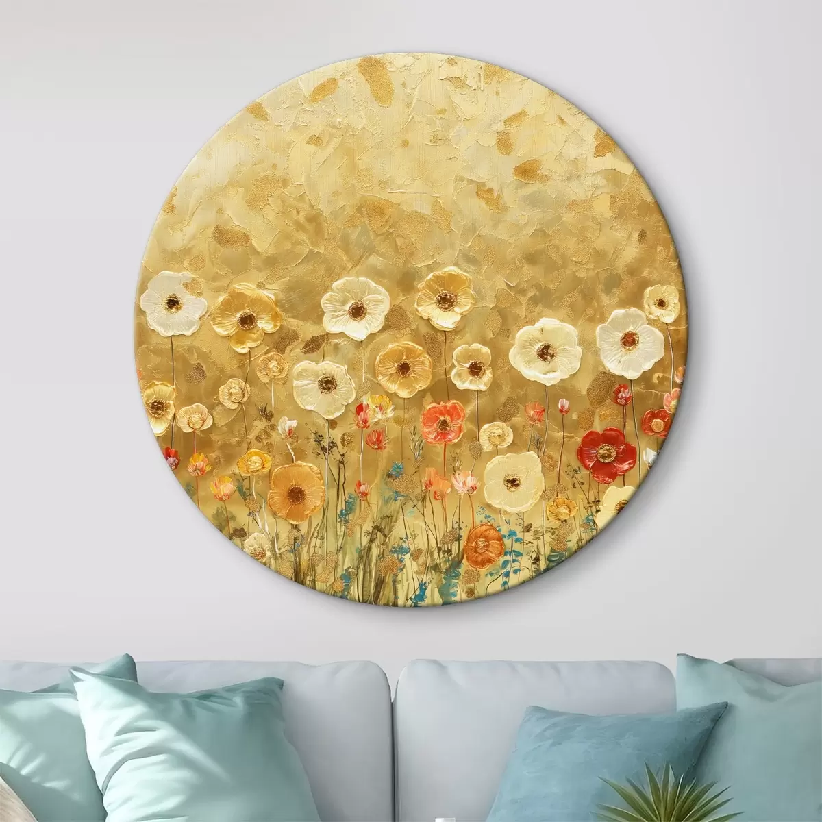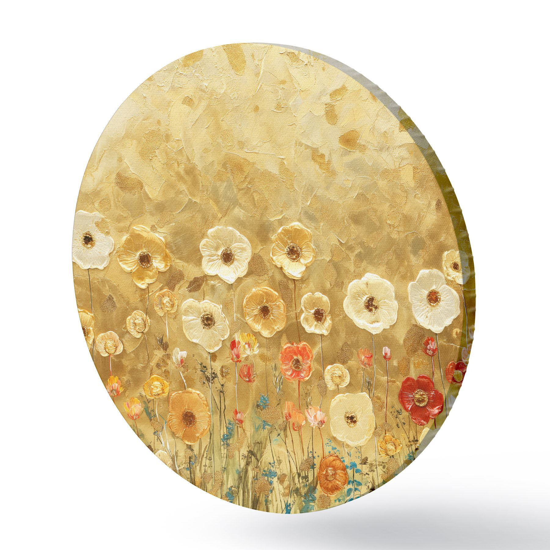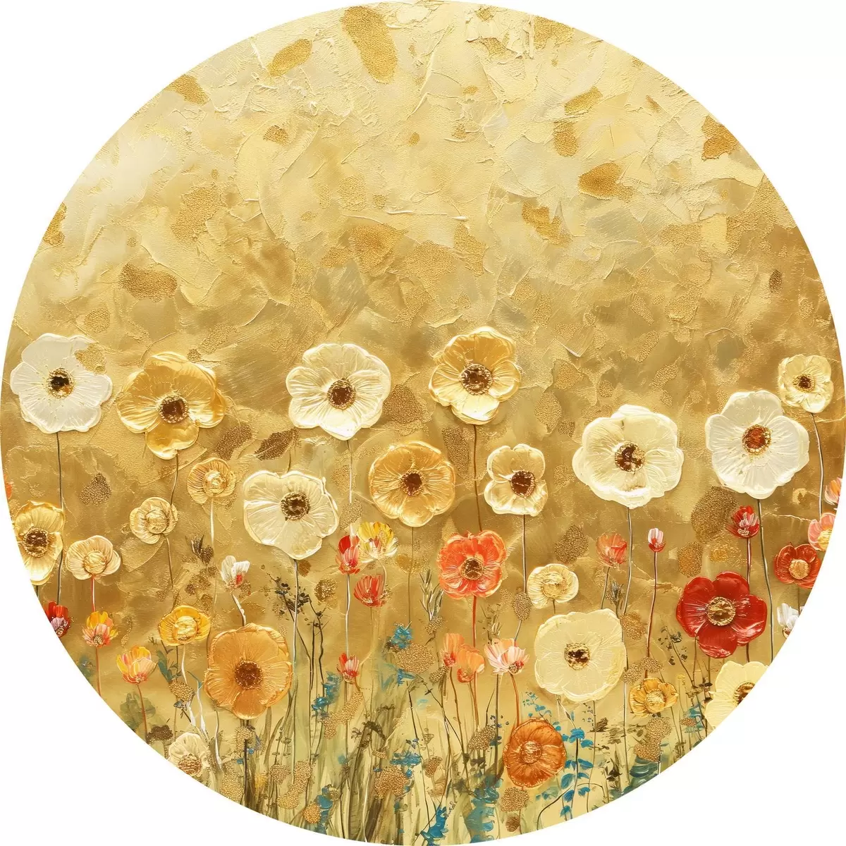 Cuadros redondos prado estilo klimt: delicadas flores pastel con textura fundida r39464
