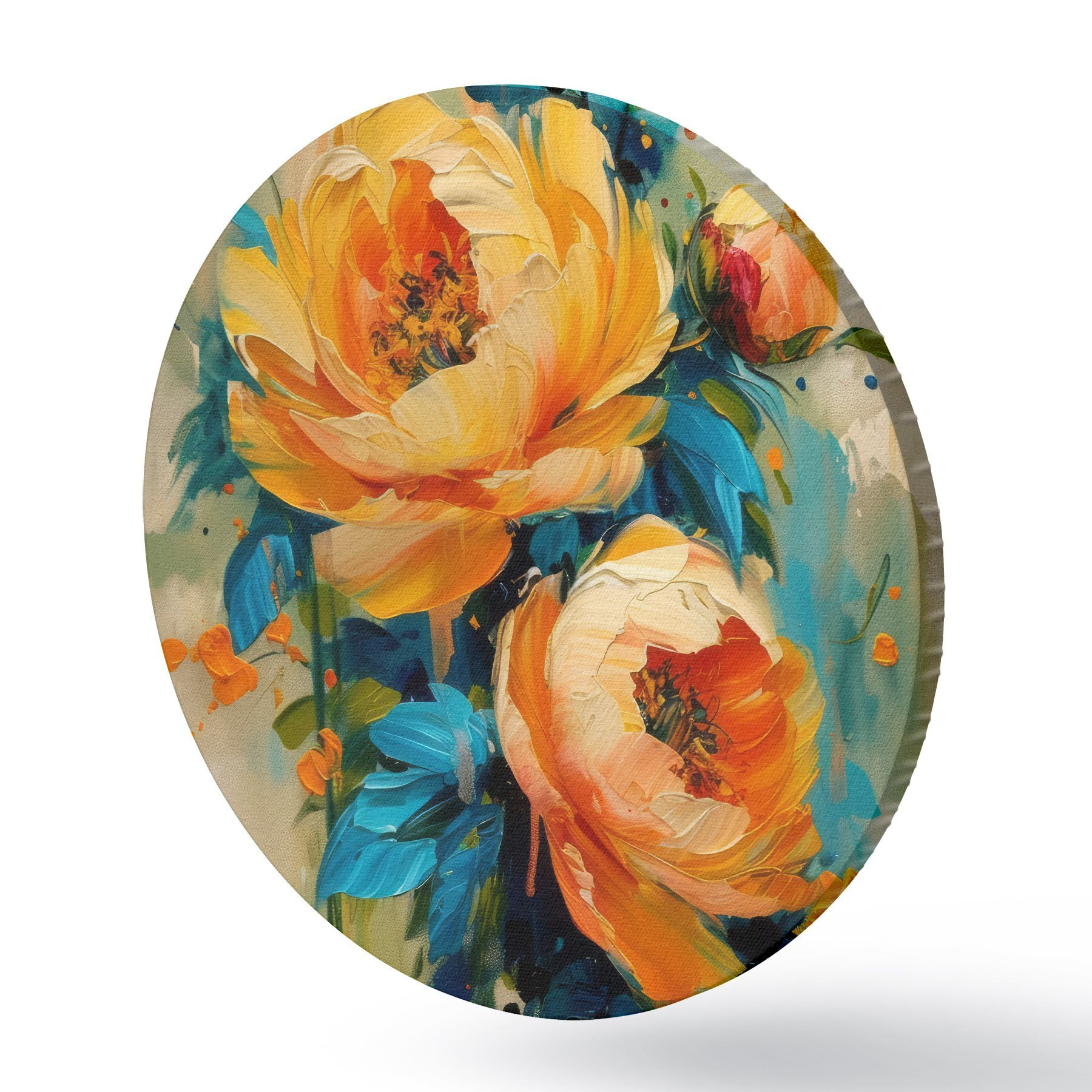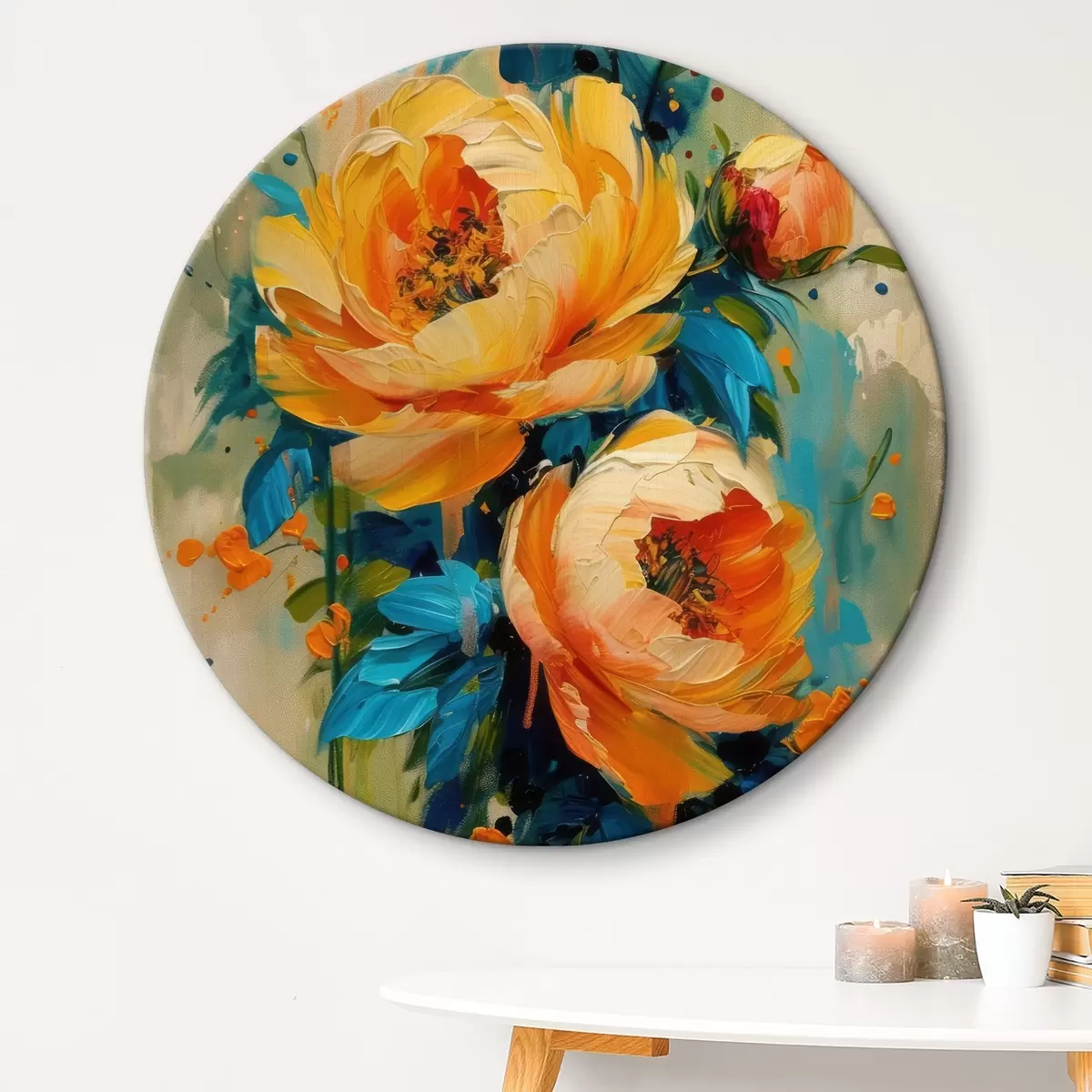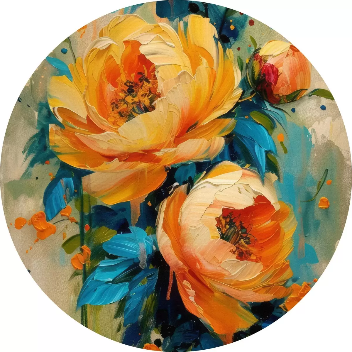 Cuadros redondos Pintura abstracta en tonos beige, amarillo, azul, verde salvia con toques de naranja, peonías vibrantes en verano r39472