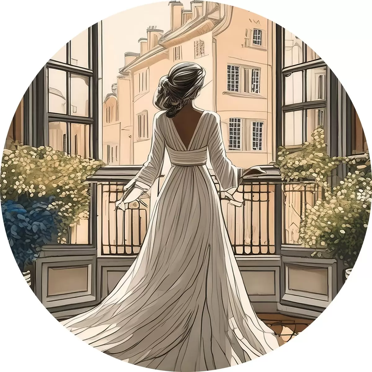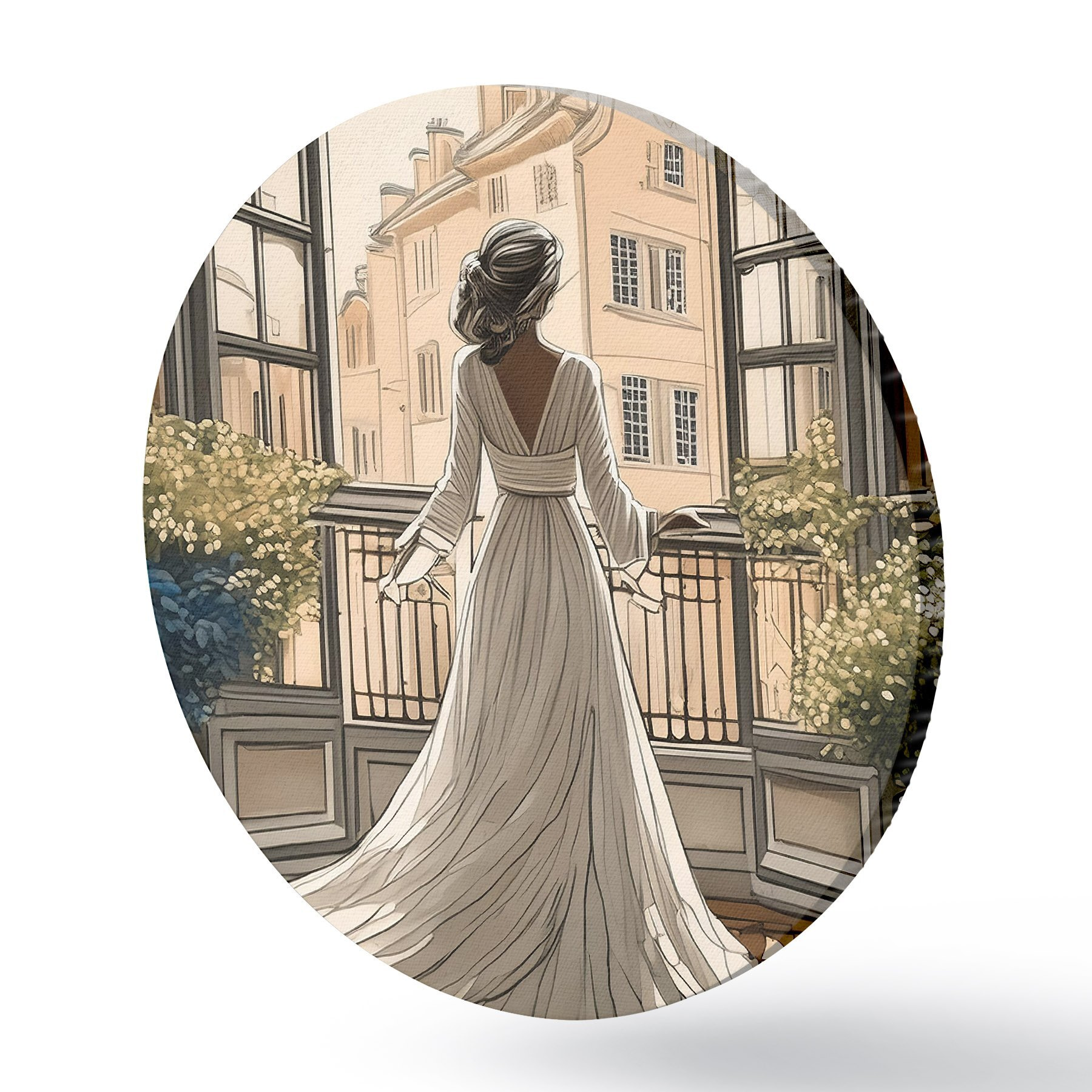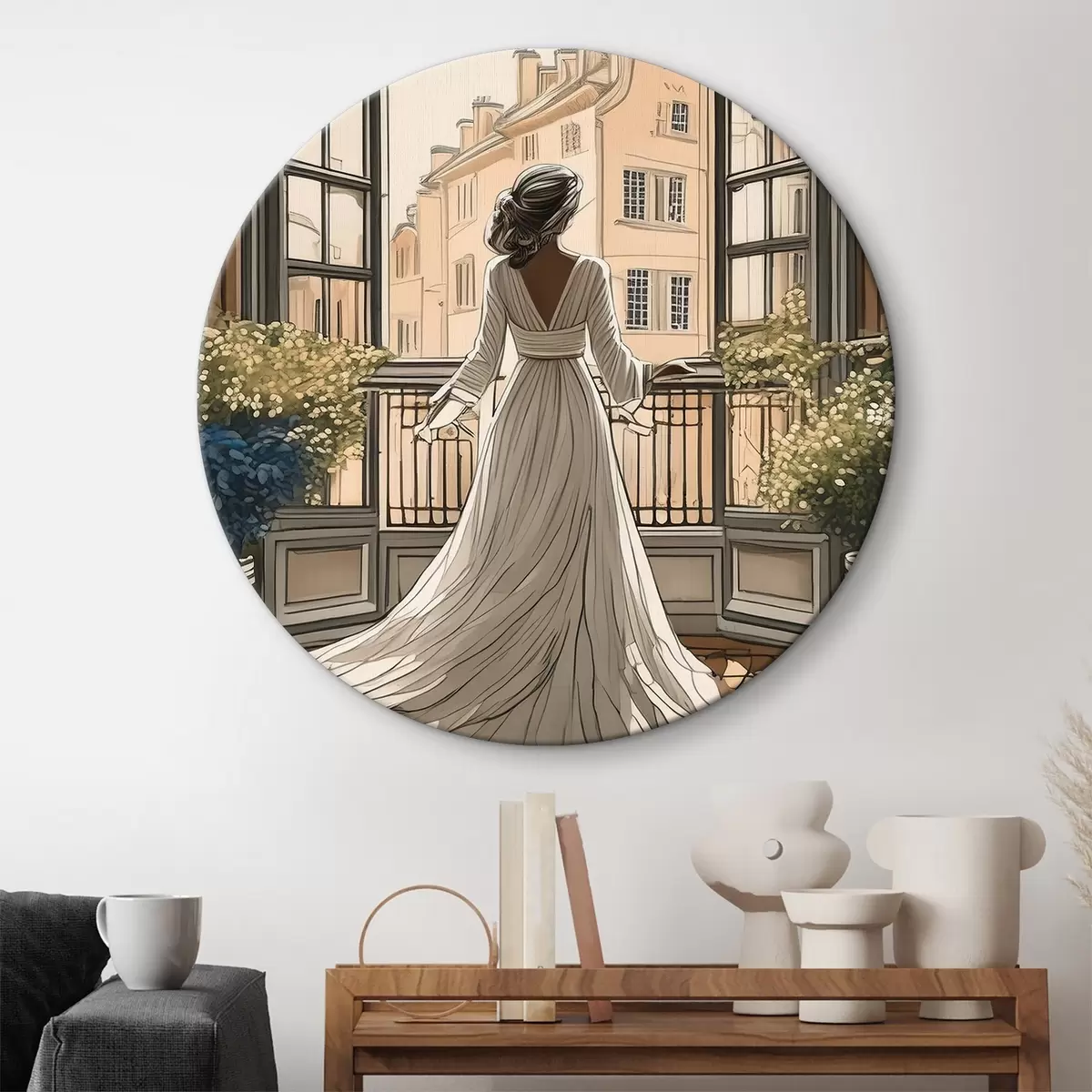 Cuadros redondos silueta de una chica con un vestido blanco cerca de una ventana grande r39480