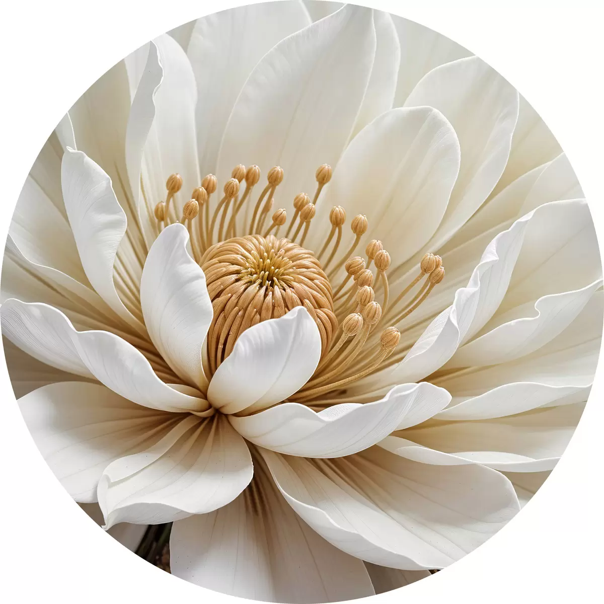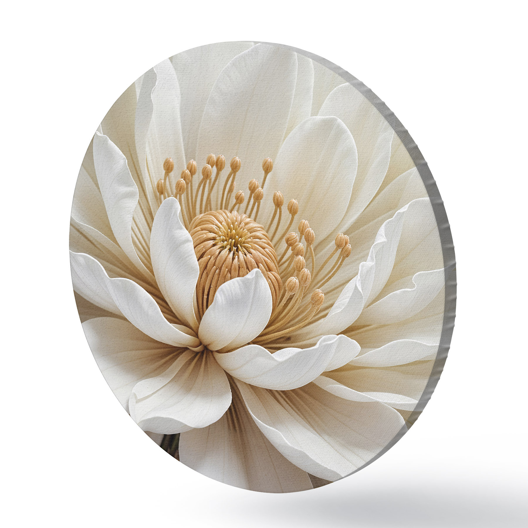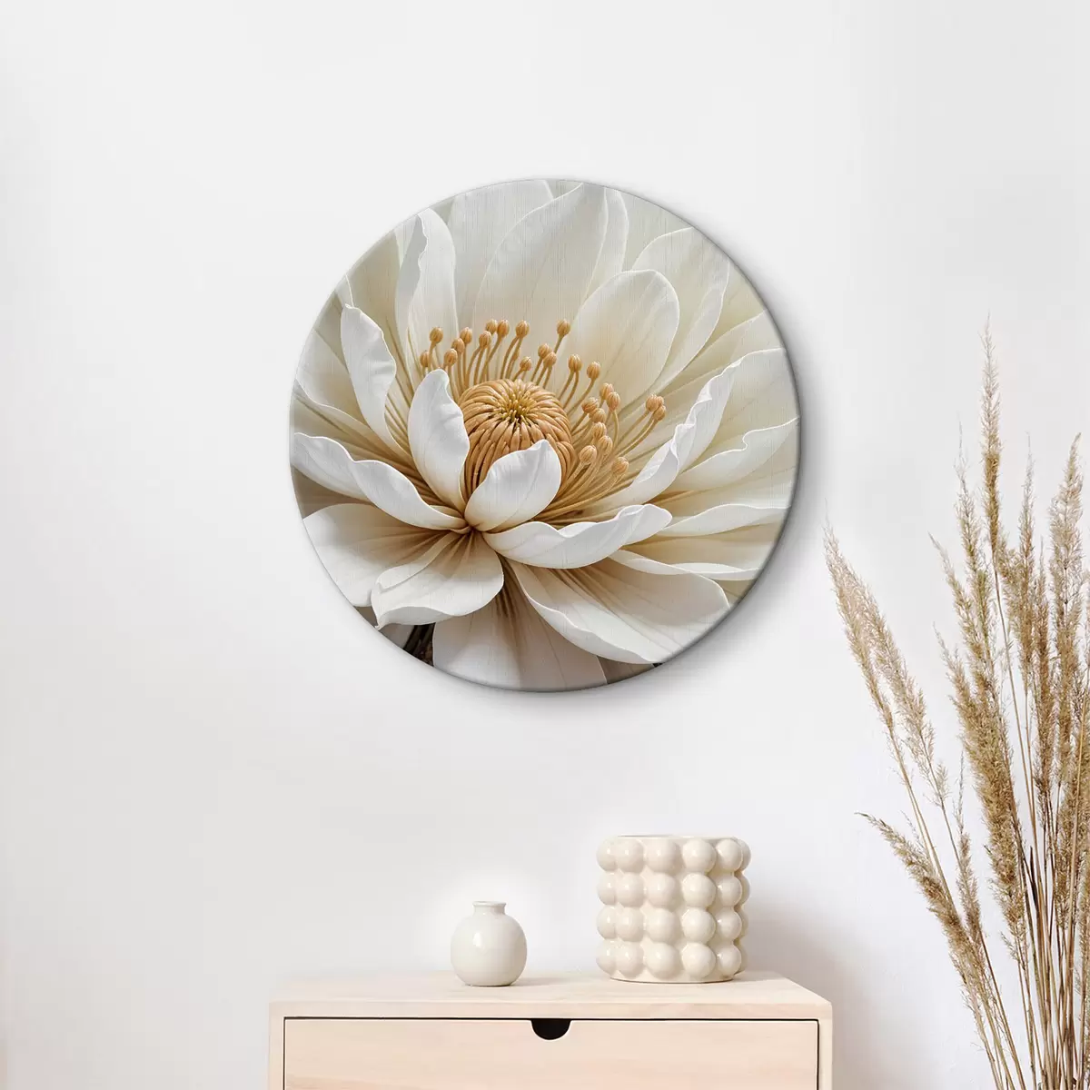 Cuadros redondos Un primer plano de una gran dalia blanca con pétalos delicados y un centro amarillo vibrante r39508