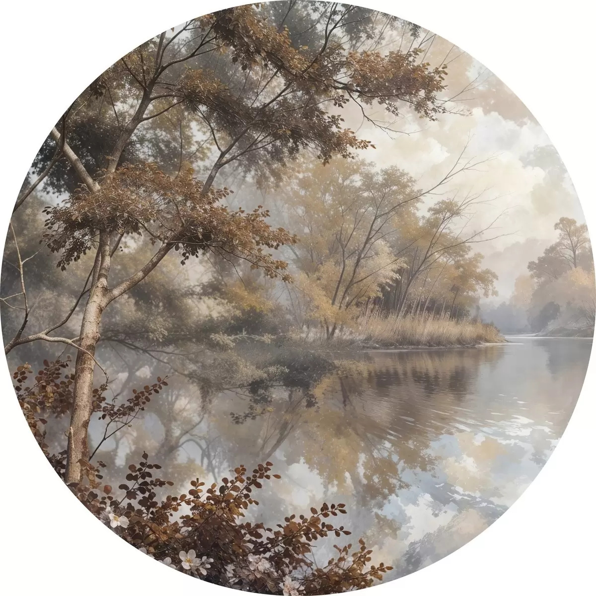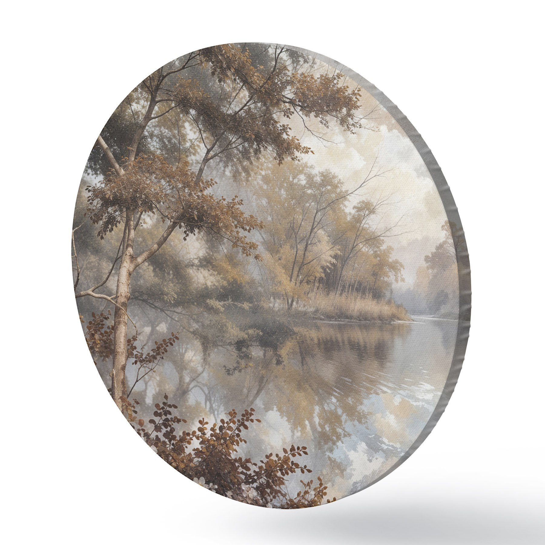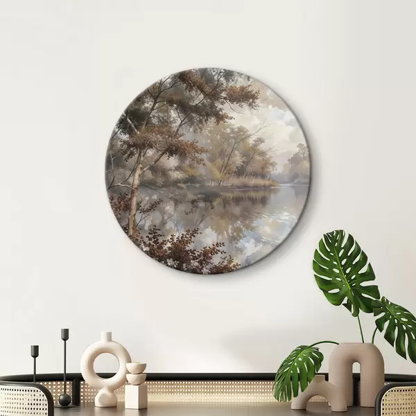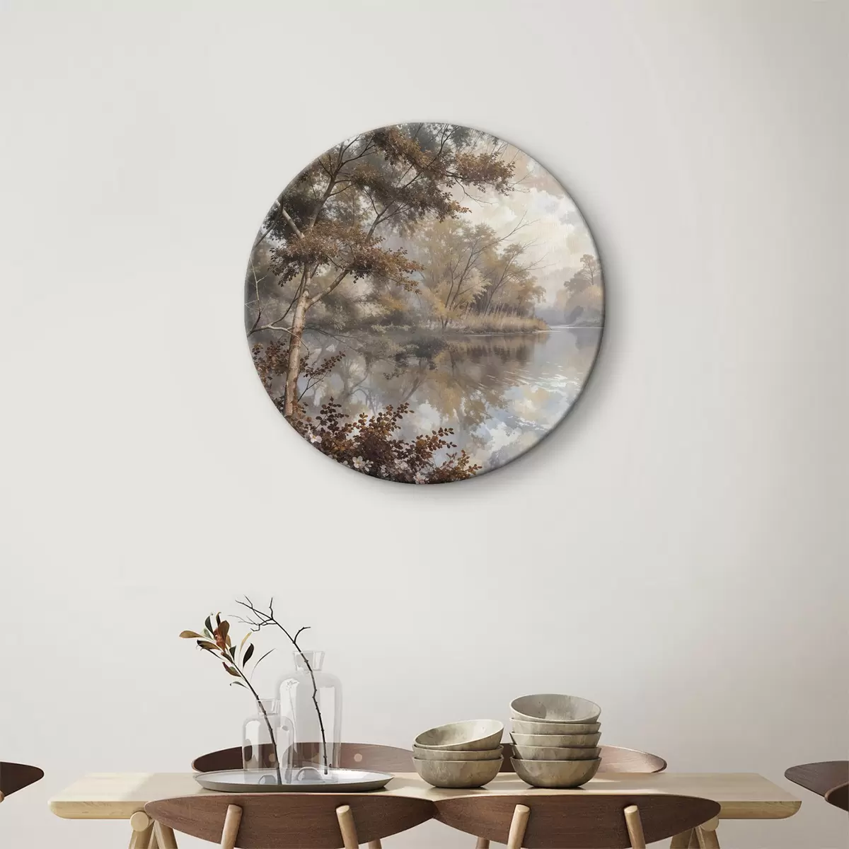 Cuadros redondos Paisaje otoñal con un tranquilo lago rodeado de árboles con vibrante follaje naranja y amarillo r39511