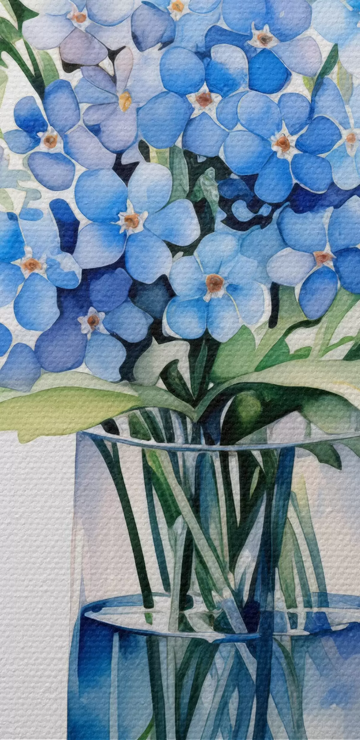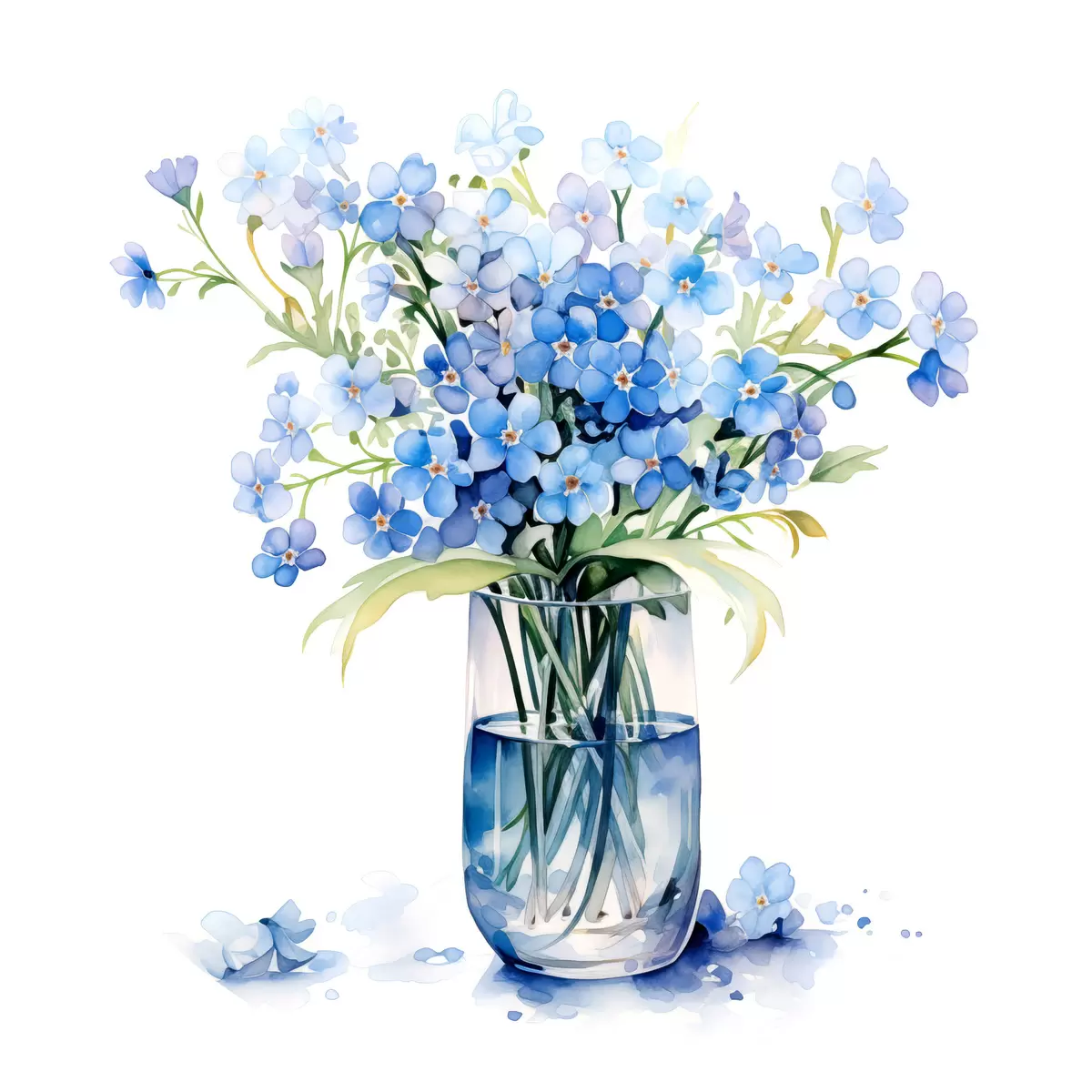 Foto Ramo de flores silvestres azules en un jarrón transparente acuarela Nr r39564