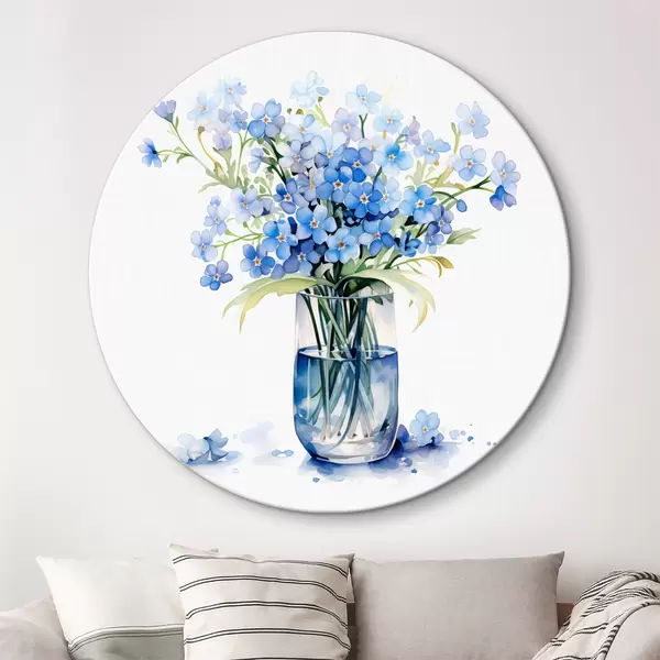 Cuadros redondos Ramo de flores silvestres azules en un jarrón transparente acuarela r39564