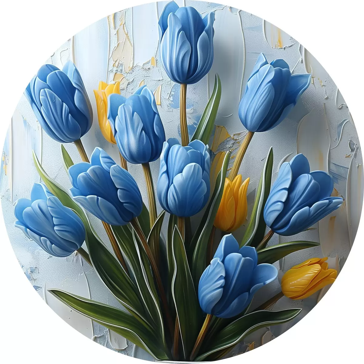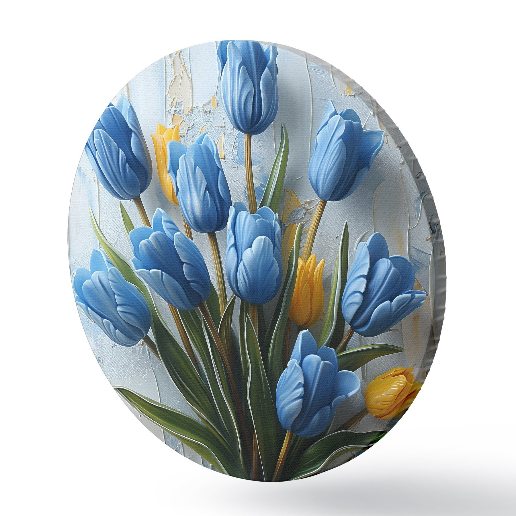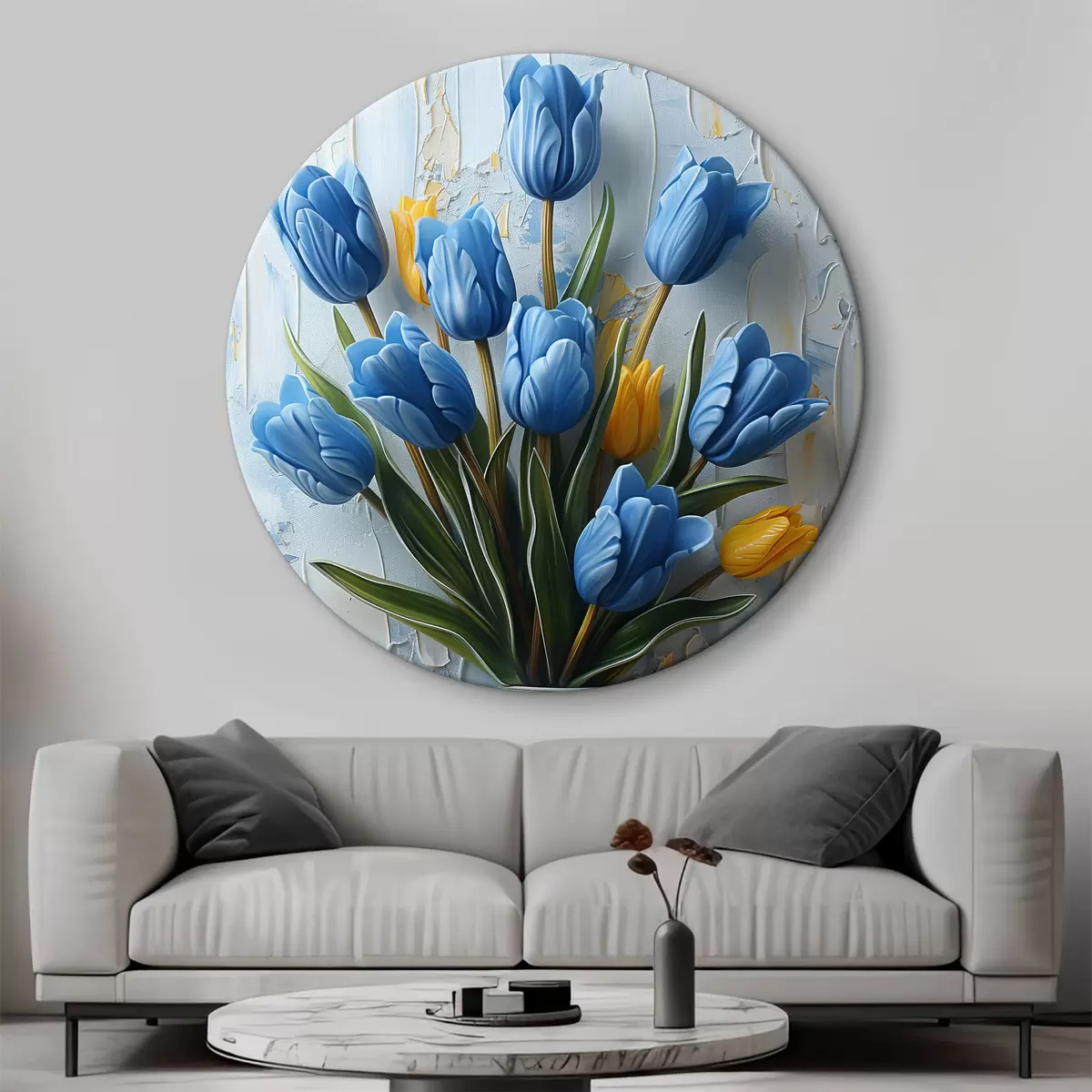 Cuadros redondos Tulipanes azules y amarillos en 3D: elegante cuadro pintado al óleo con fondo blanco y azul claro y jarrón grabado r39637