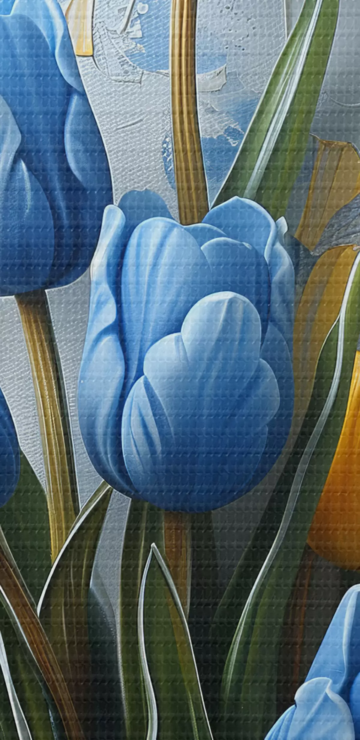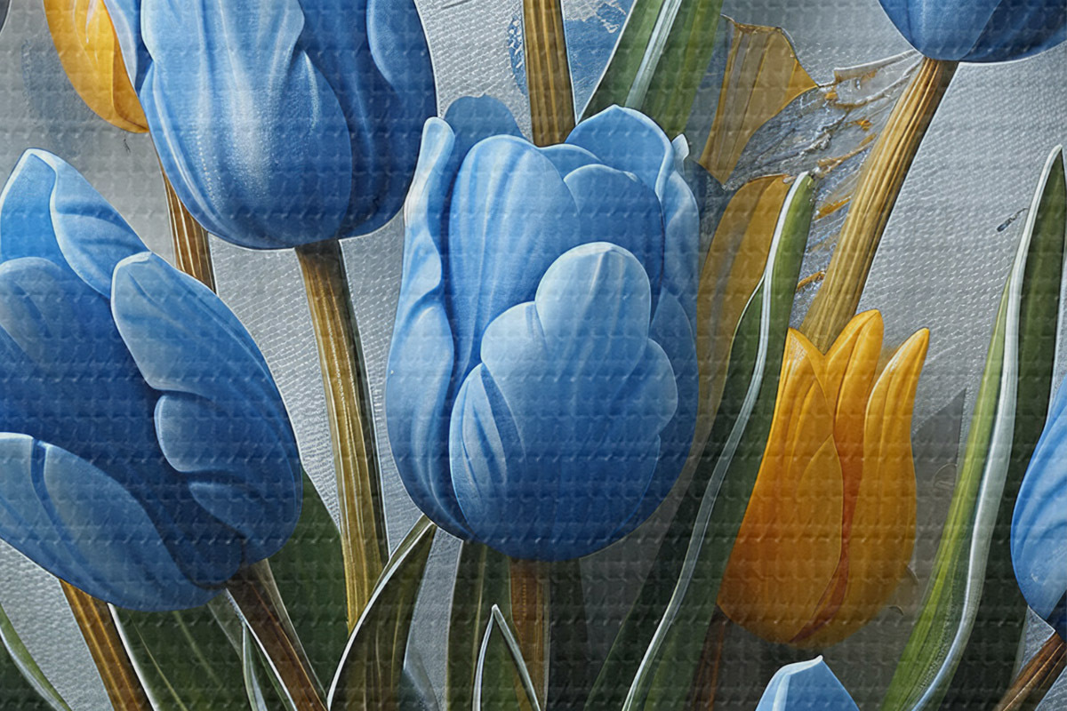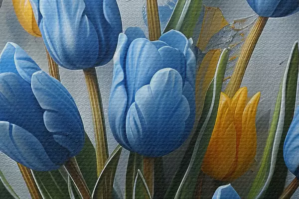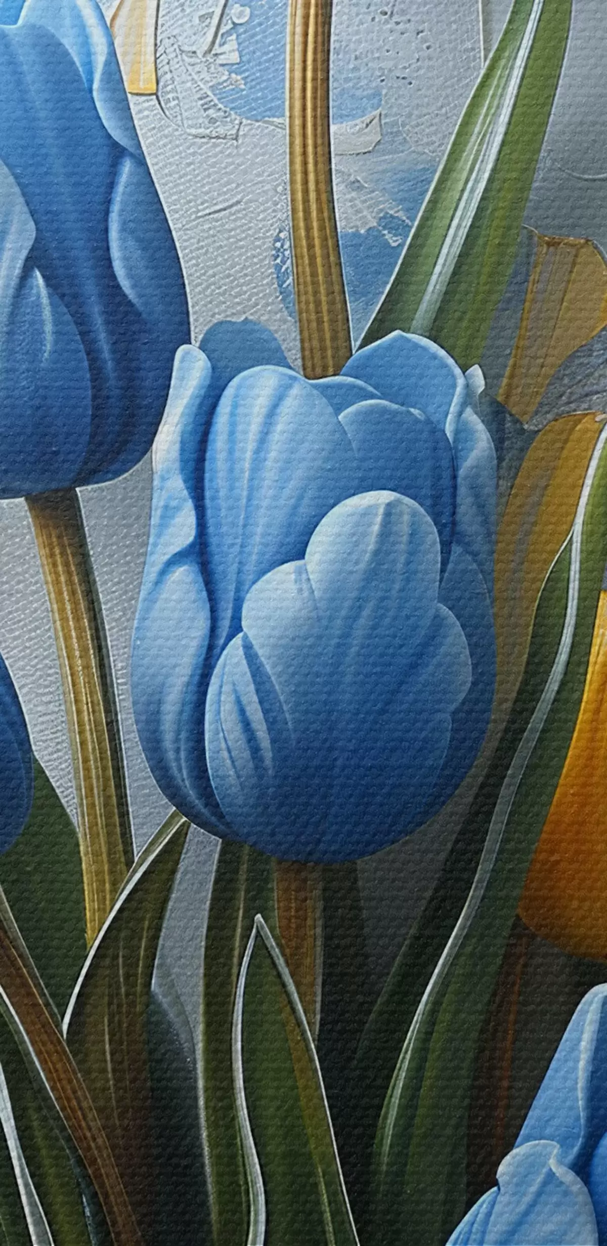 Foto Tulipanes azules y amarillos en 3D: elegante cuadro pintado al óleo con fondo blanco y azul claro y jarrón grabado Nr r39637