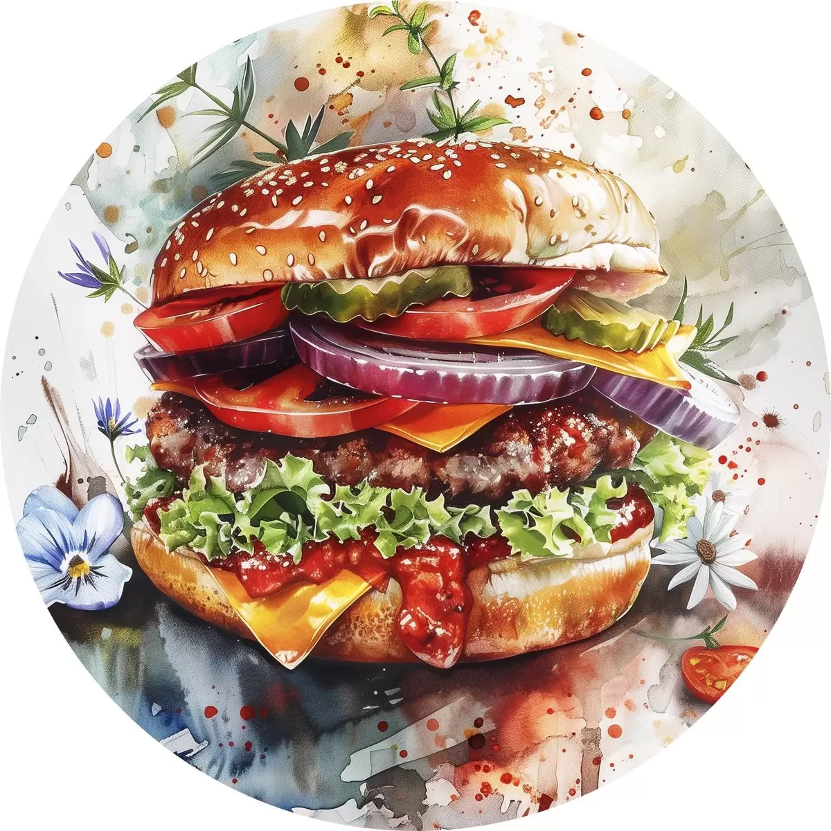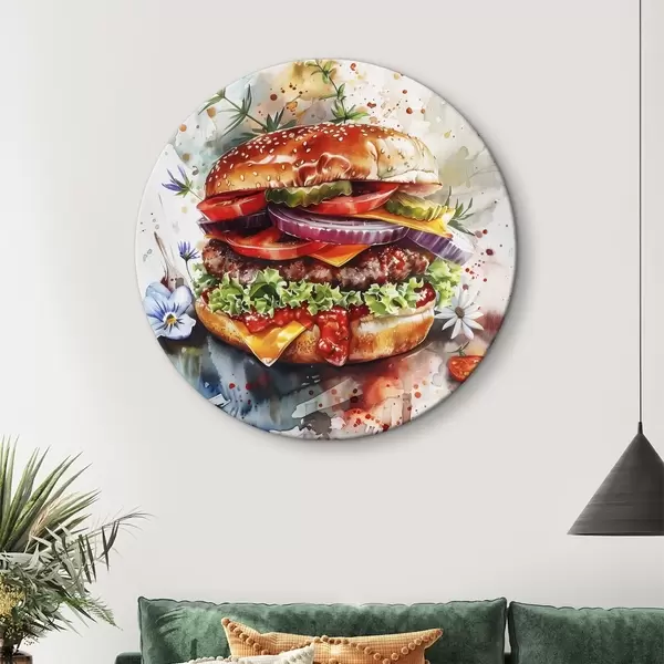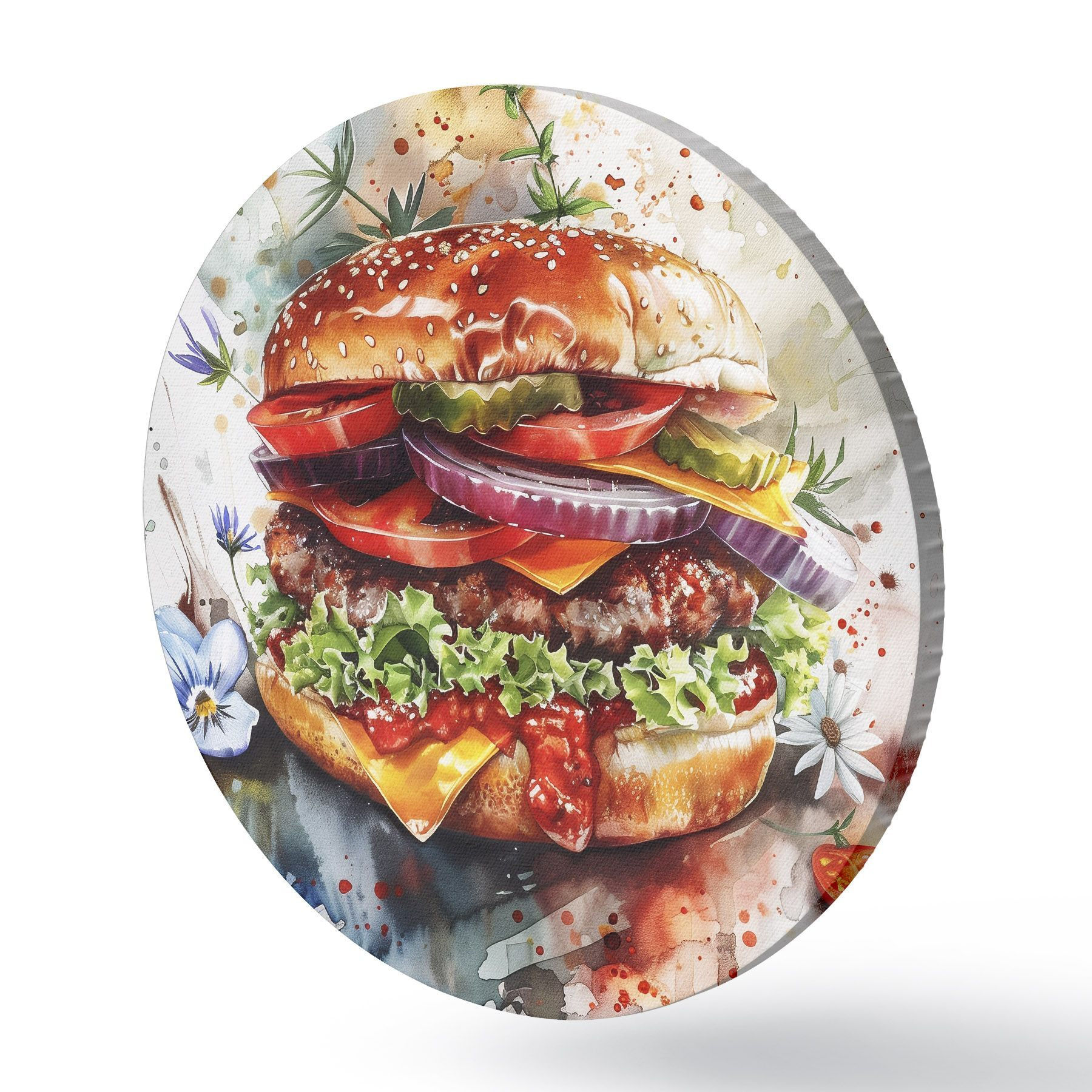 Cuadros redondos Sabrosa hamburguesa con carne, floral, acuarela, arte gastronómico r39699