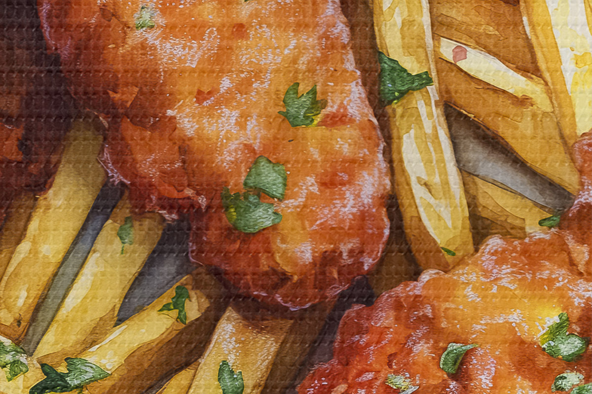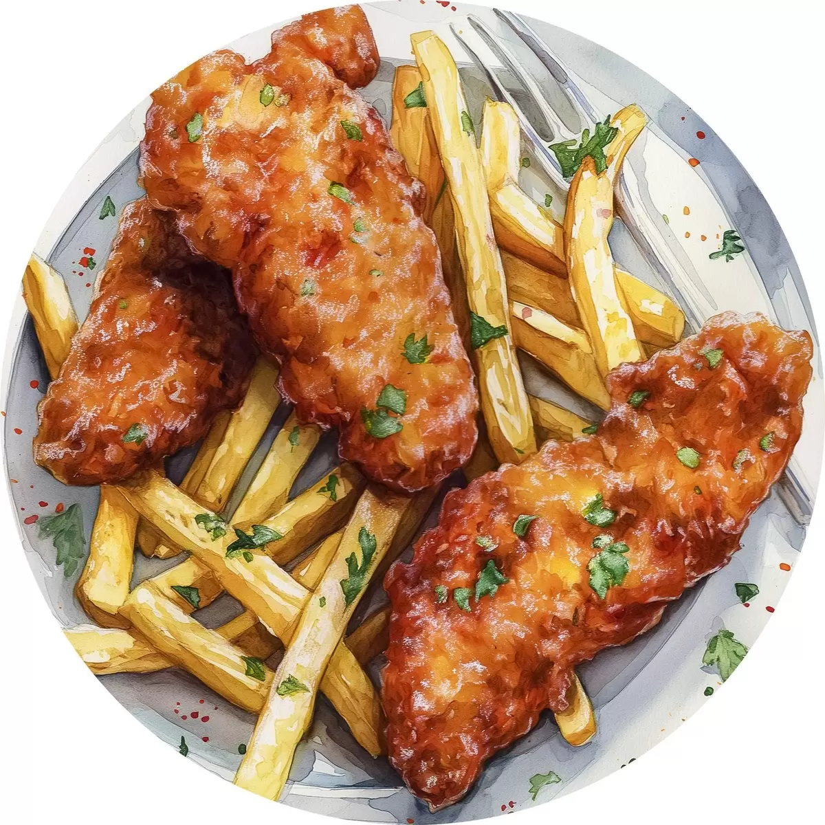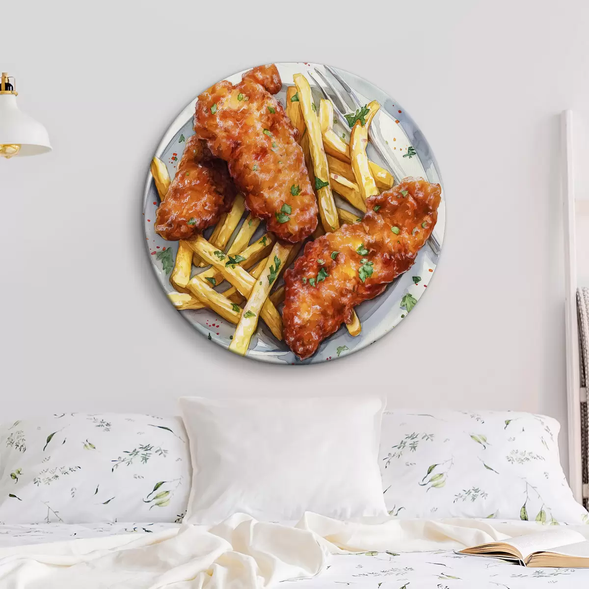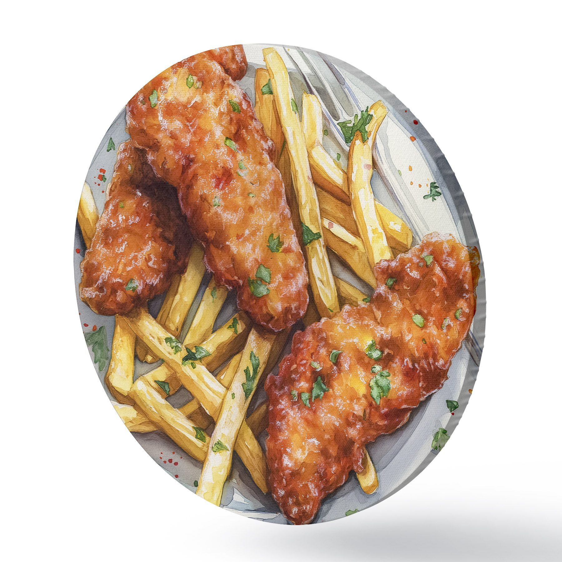 Cuadros redondos Arte gastronómico en acuarela, papas fritas con pollo asado, delicioso r39708