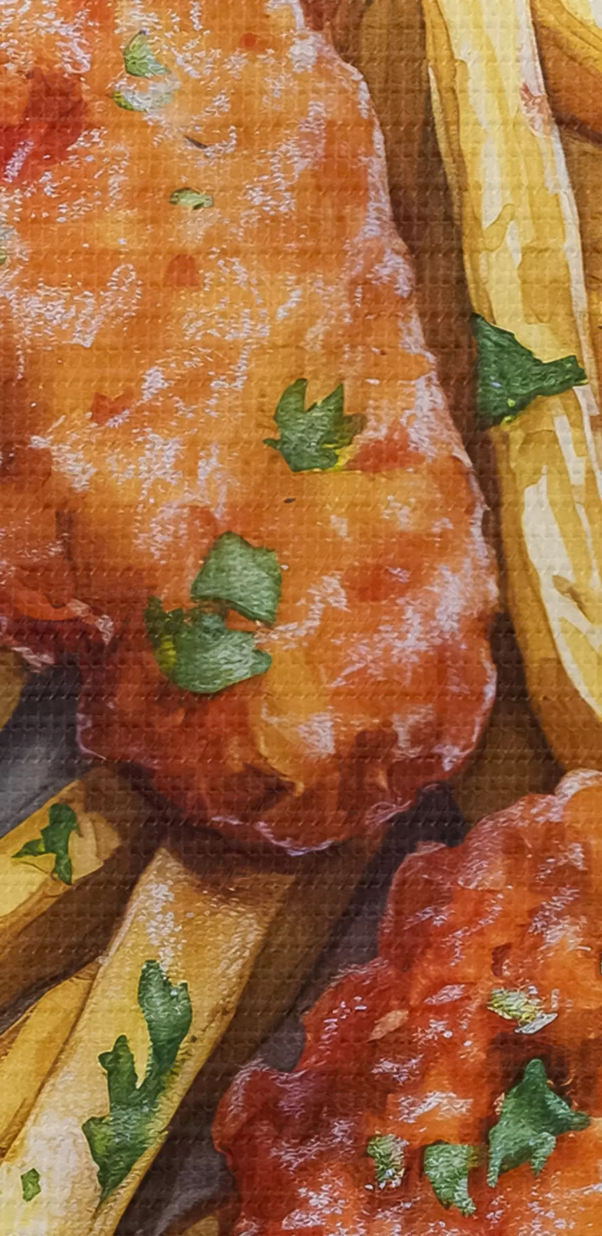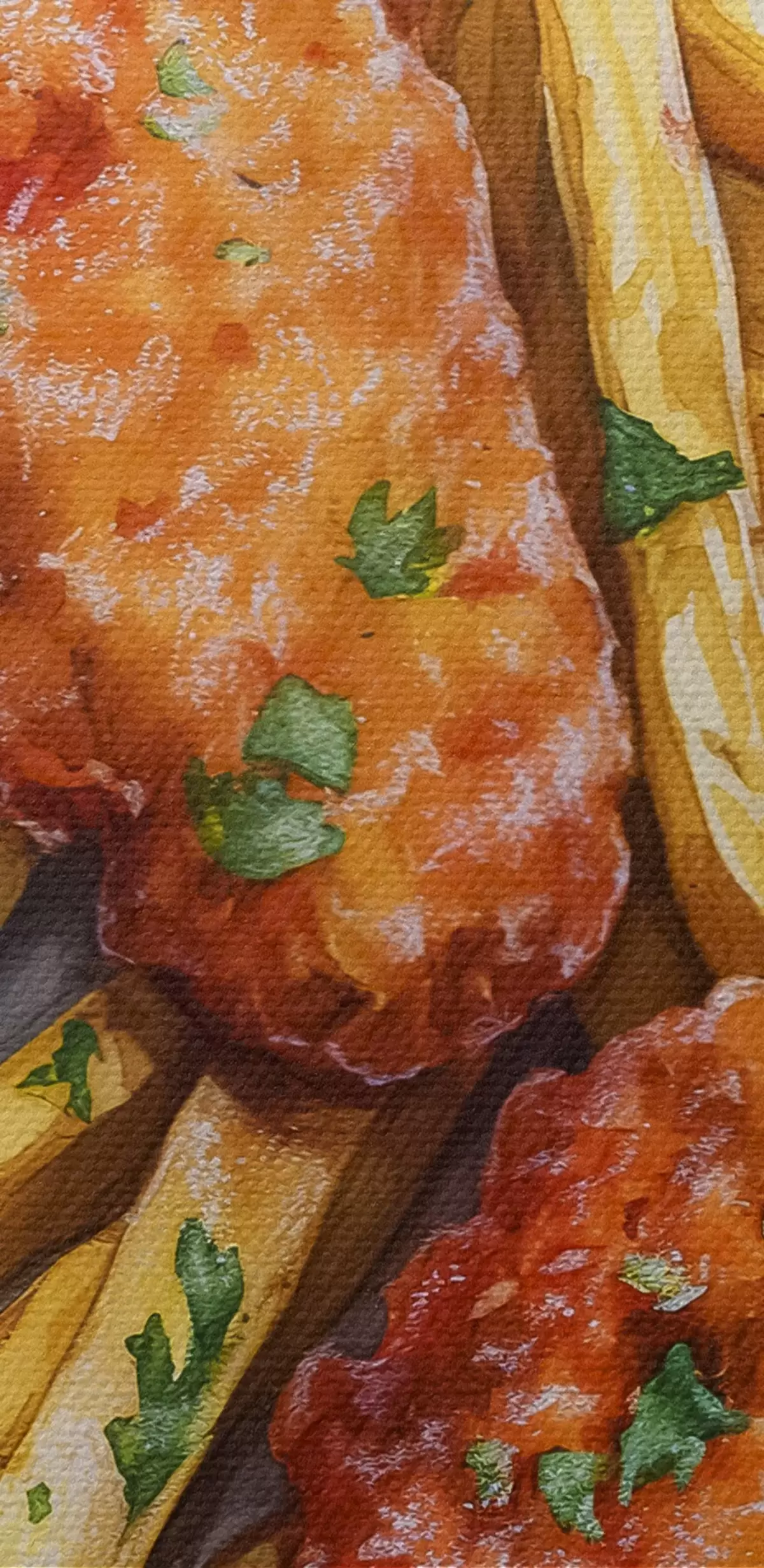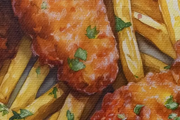 Foto Arte gastronómico en acuarela, papas fritas con pollo asado, delicioso Nr r39708