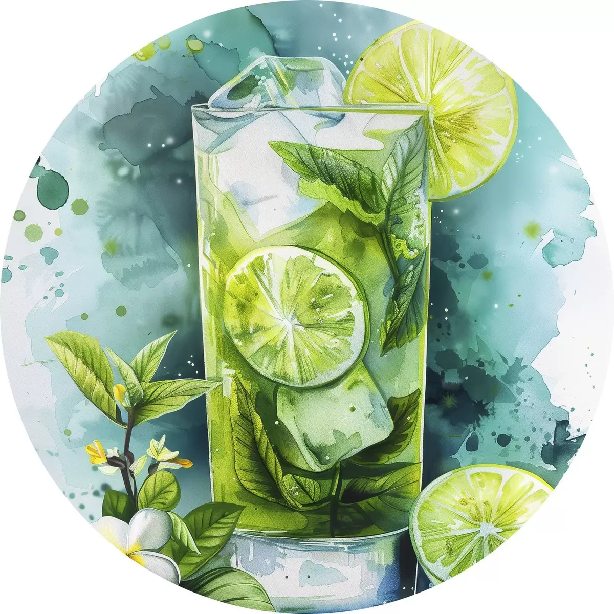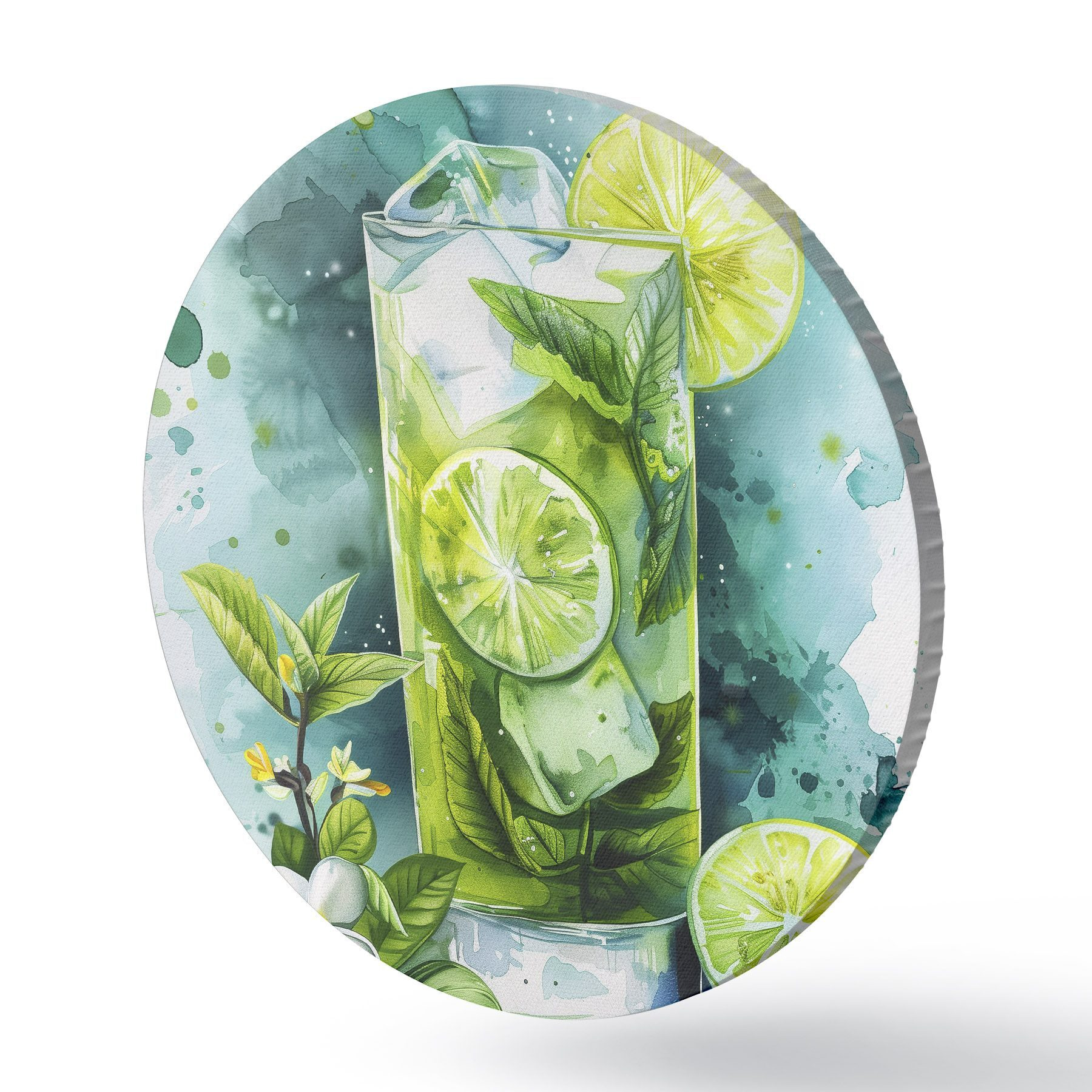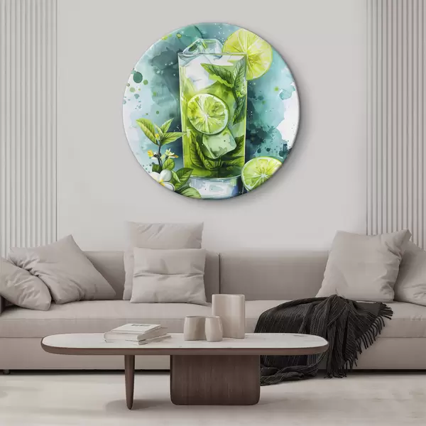 Cuadros redondos Cóctel de verano acuarela, mojito, lima y menta, flores, colores verdes r39712