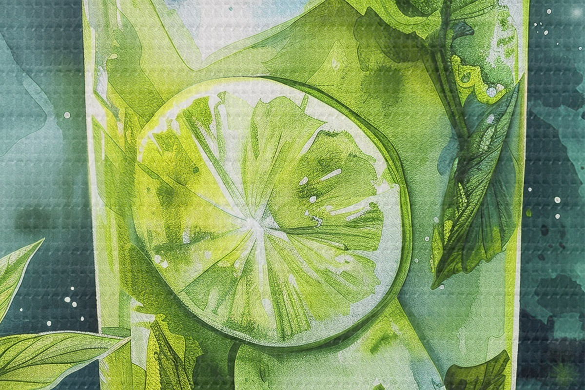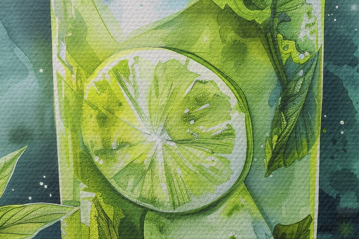 Foto Cóctel de verano acuarela, mojito, lima y menta, flores, colores verdes Nr r39712