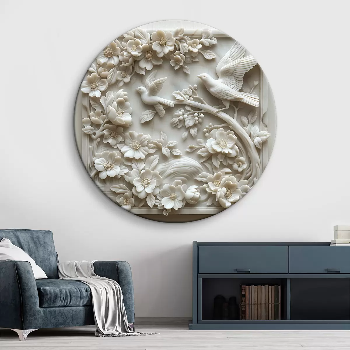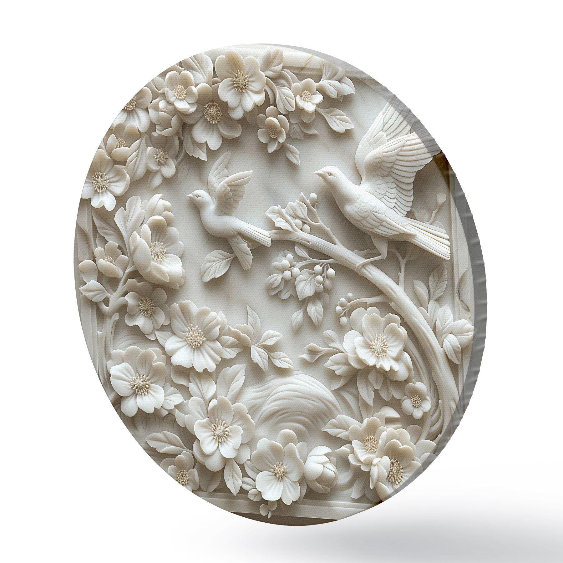 Cuadros redondos Jardín de mármol blanco con bajorrelieve de pájaros y flores r39728