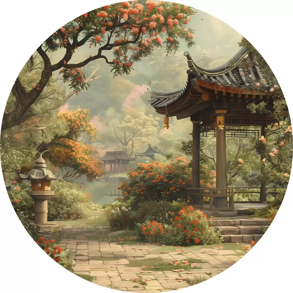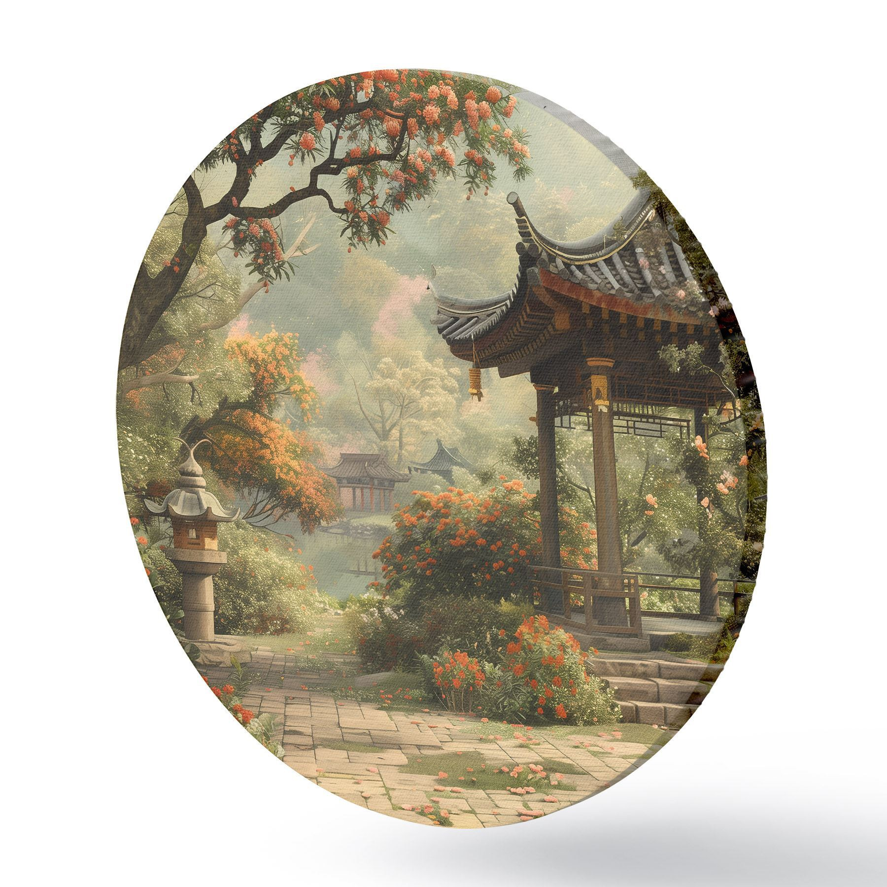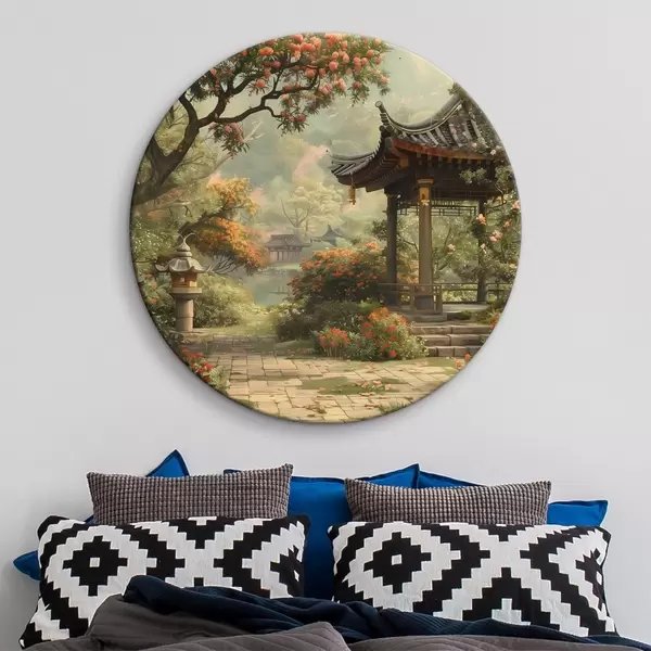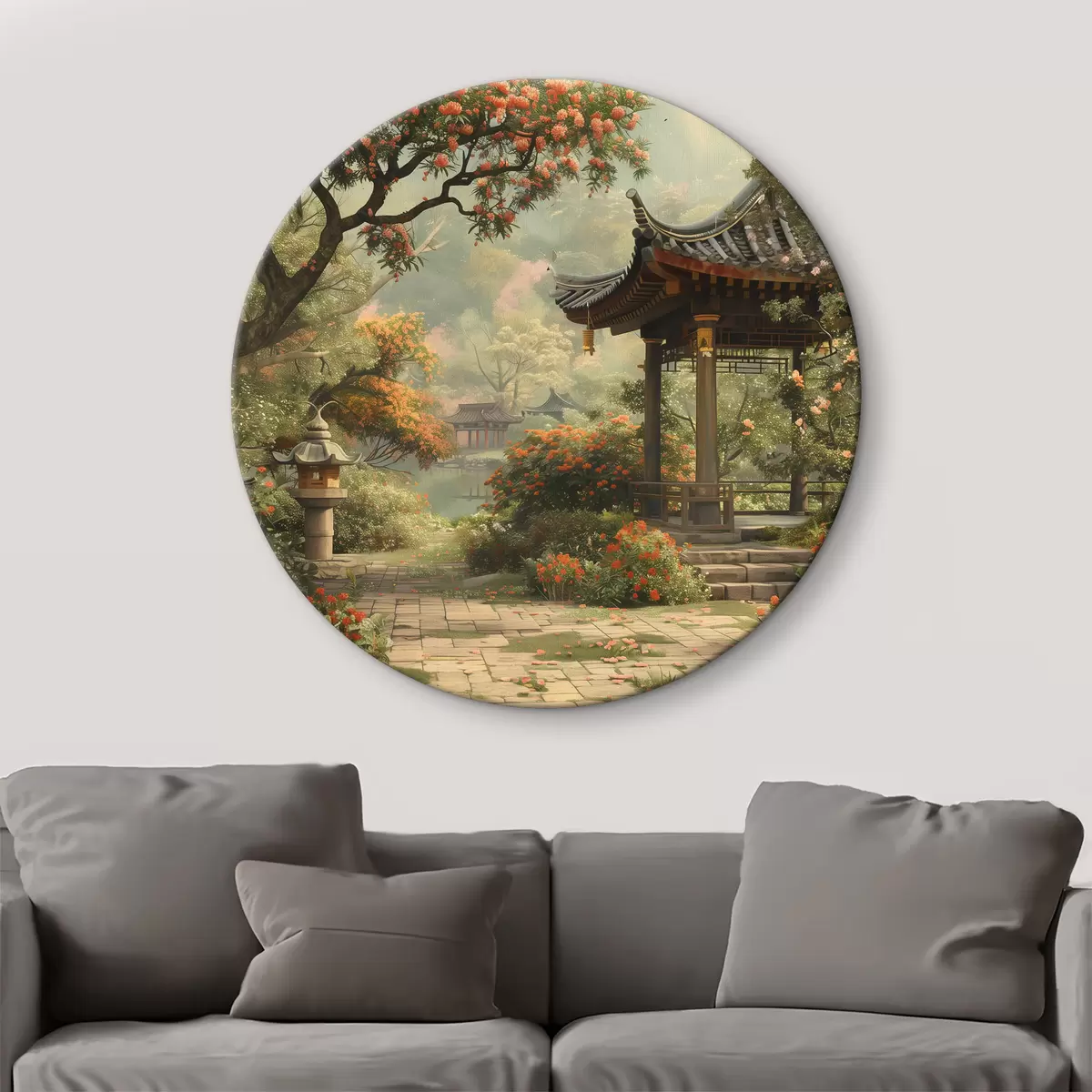 Cuadros redondos Parque japonés con árboles y flores en flor, bosque, casa de jardín, lago r39772
