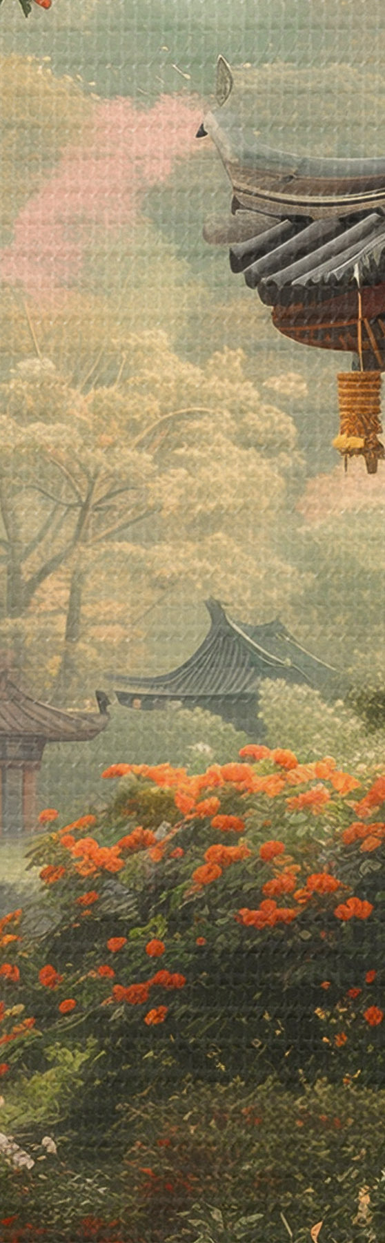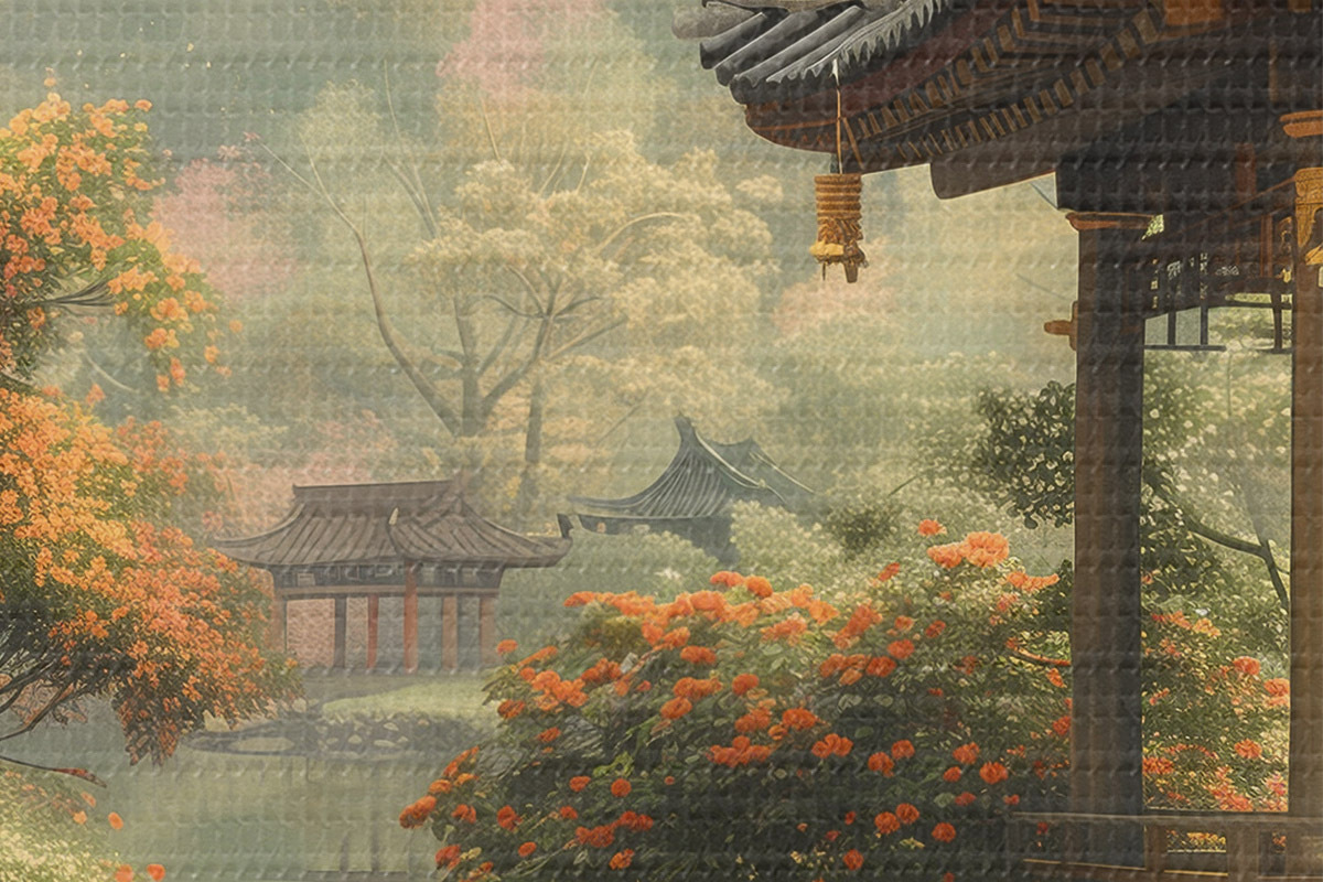 Foto Parque japonés con árboles y flores en flor, bosque, casa de jardín, lago Nr r39772