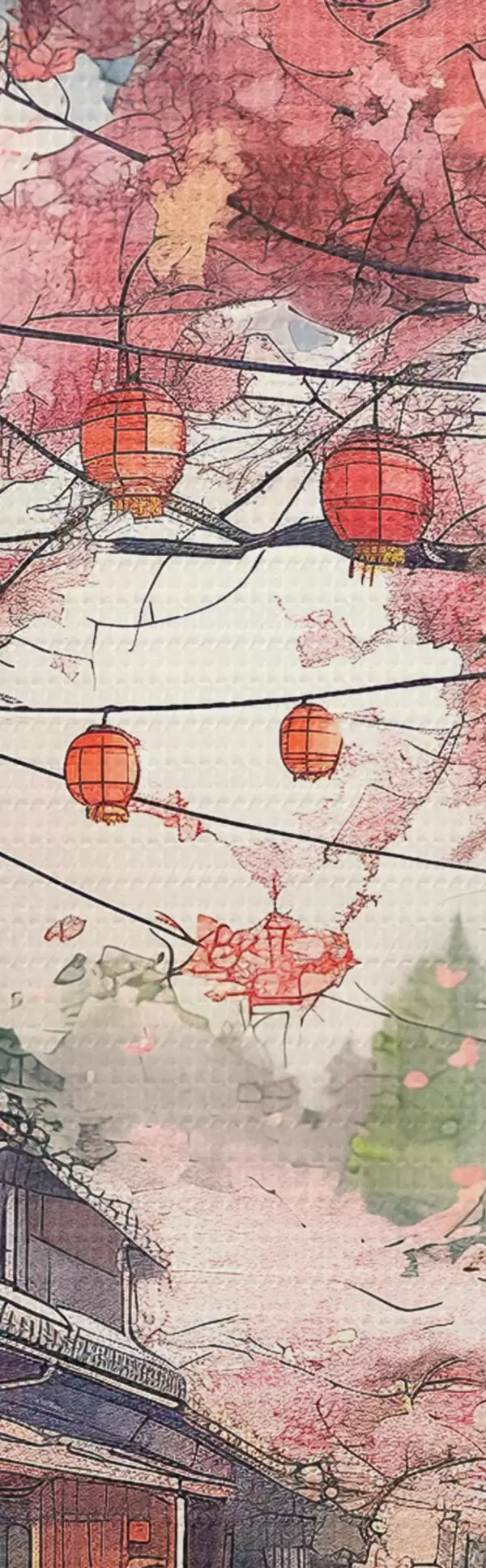 Foto Calle japonesa con cerezos en flor, arquitectura oriental, linternas Nr r39774