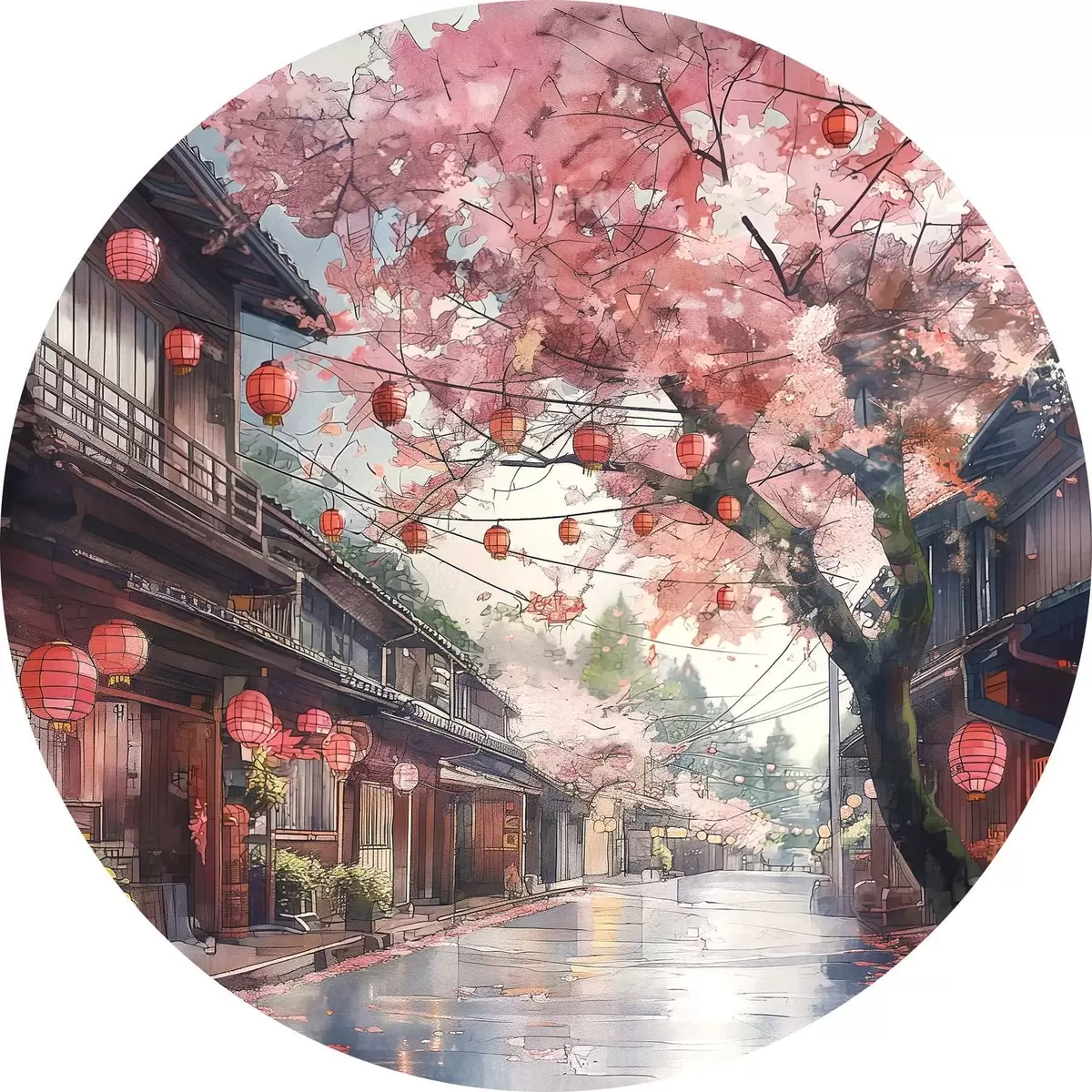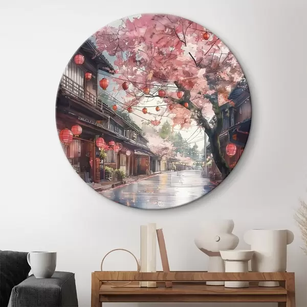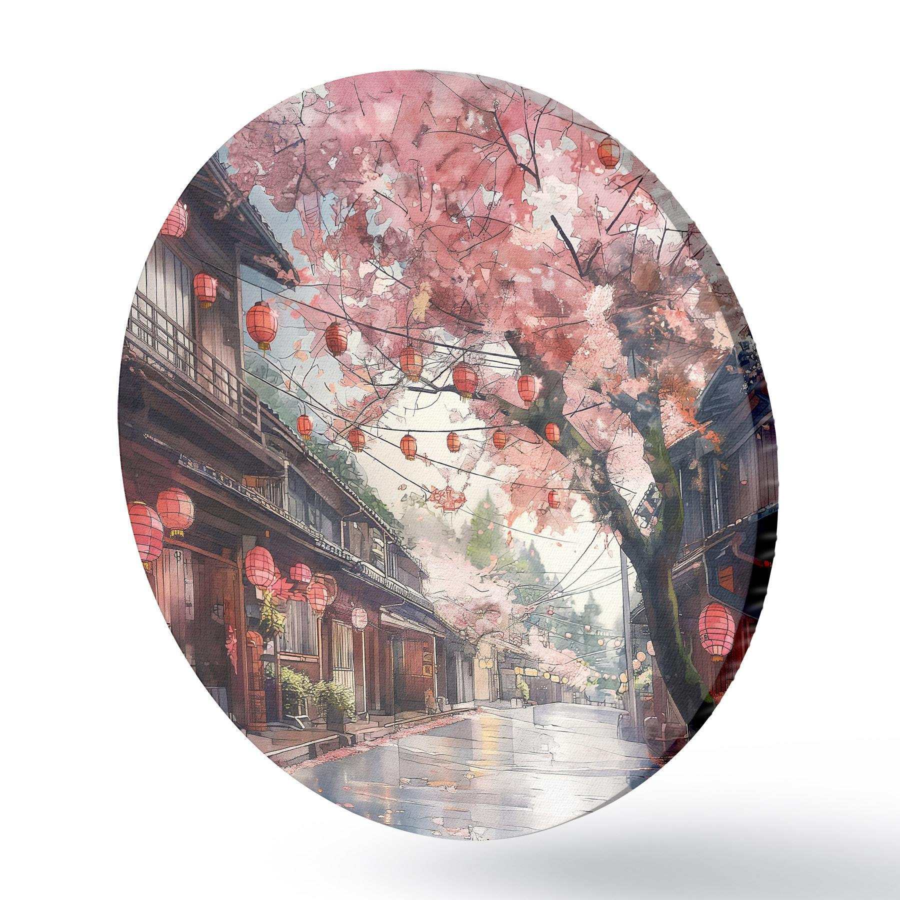 Cuadros redondos Calle japonesa con cerezos en flor, arquitectura oriental, linternas r39774
