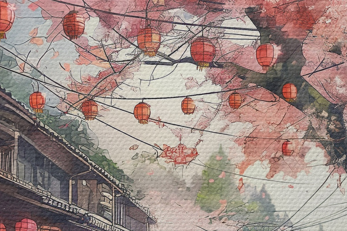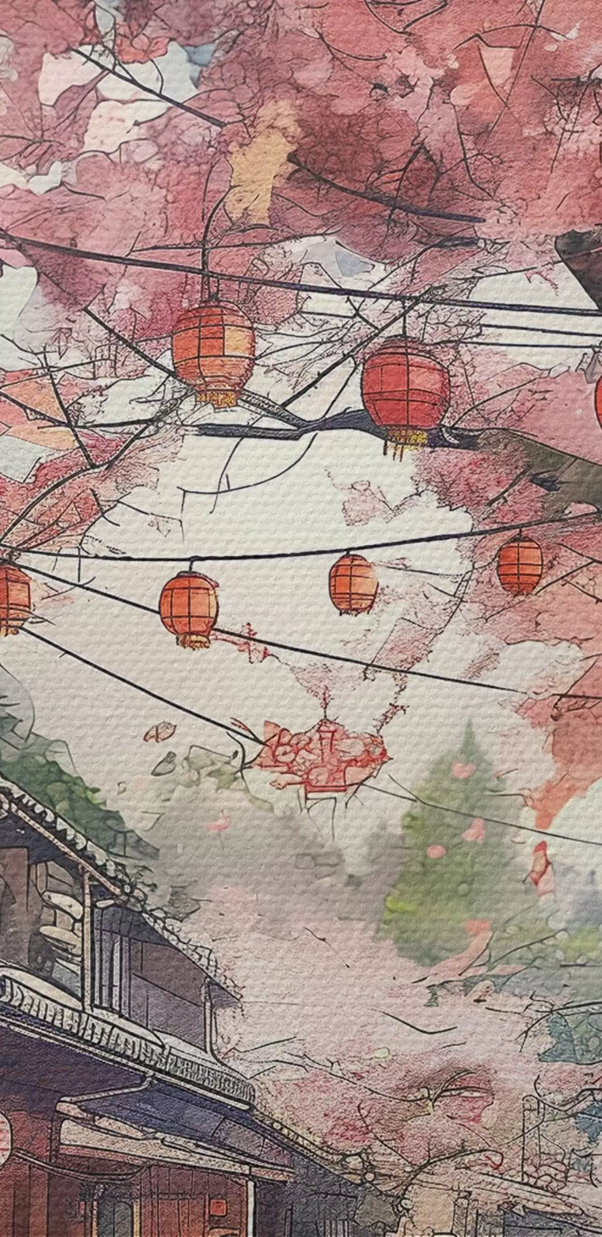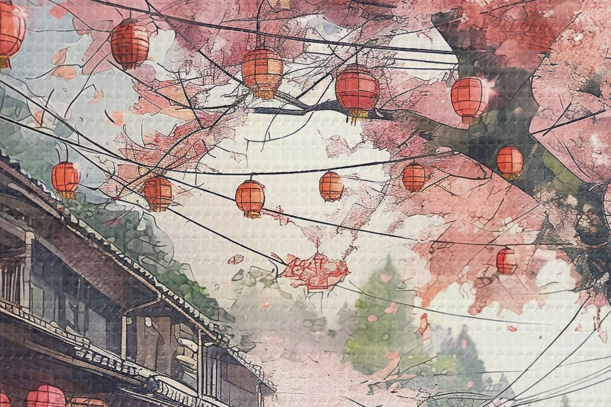 Foto Calle japonesa con cerezos en flor, arquitectura oriental, linternas Nr r39774