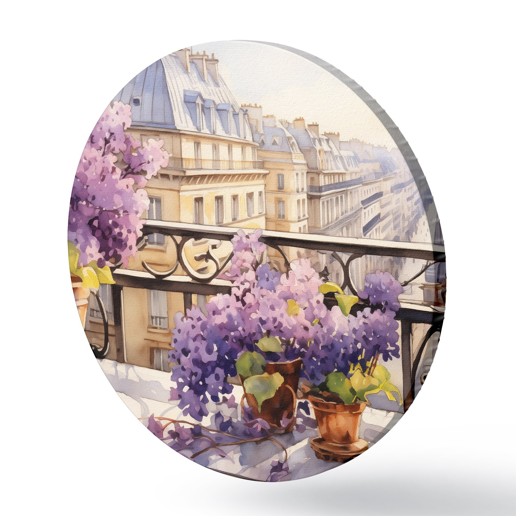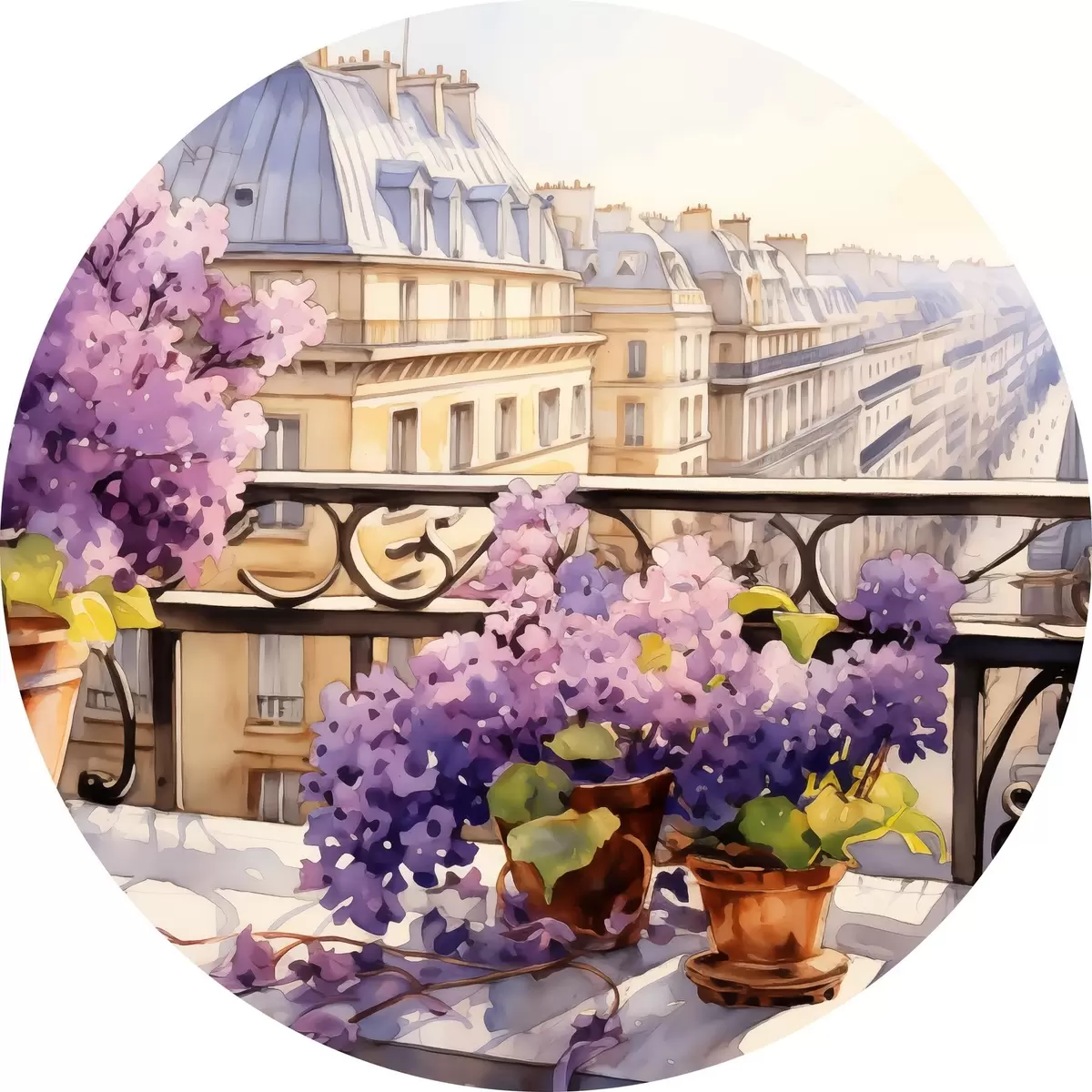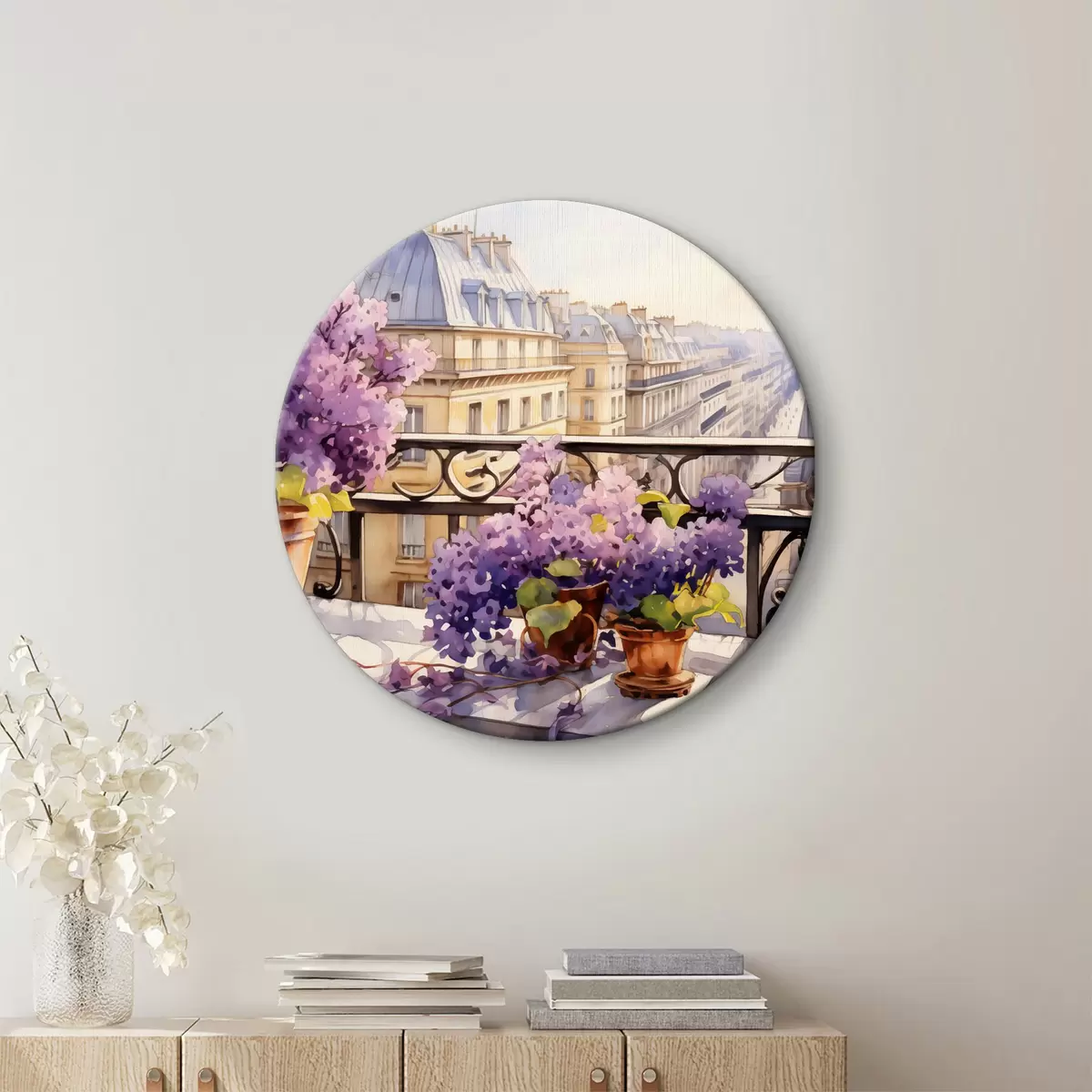 Cuadros redondos Violetas en maceta en un balcón de París acuarela r39931