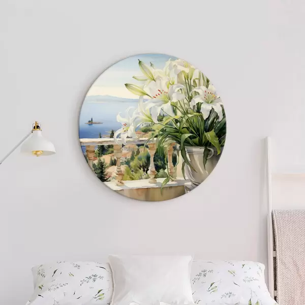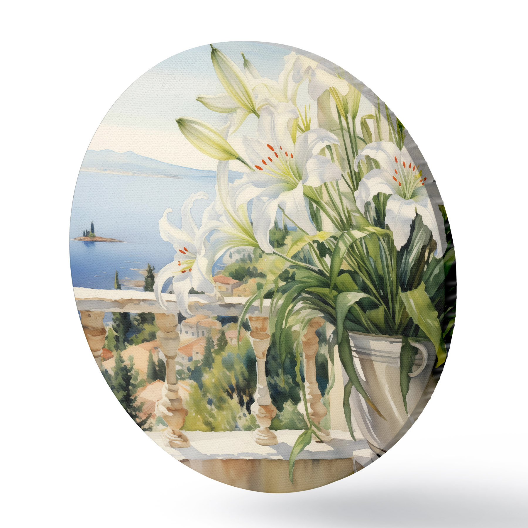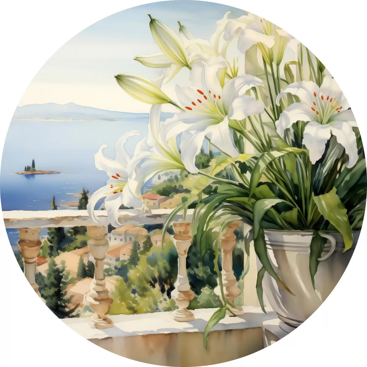 Cuadros redondos Lirios blancos en una maceta en un balcón con el fondo de la bahía acuarela r39932