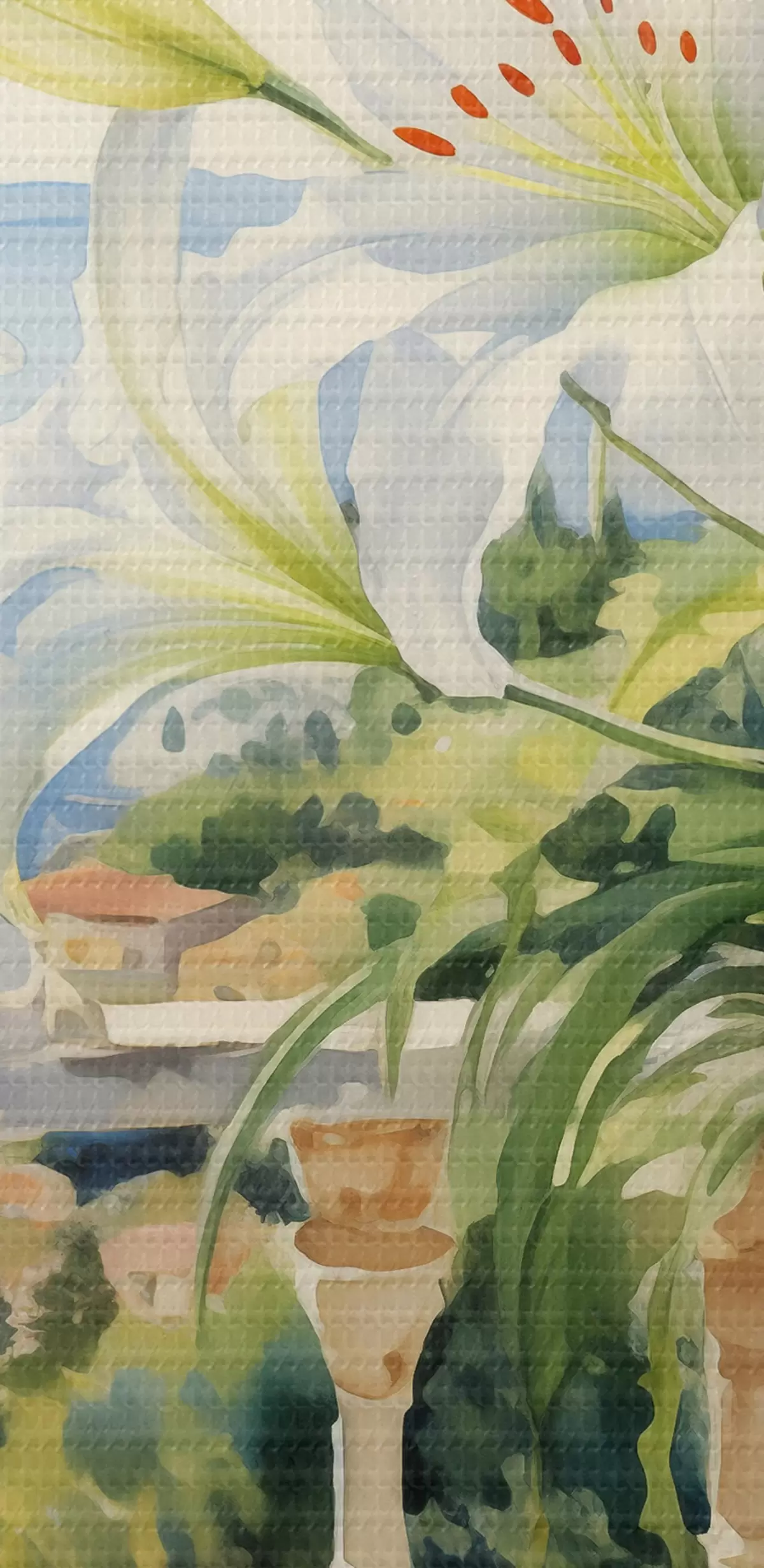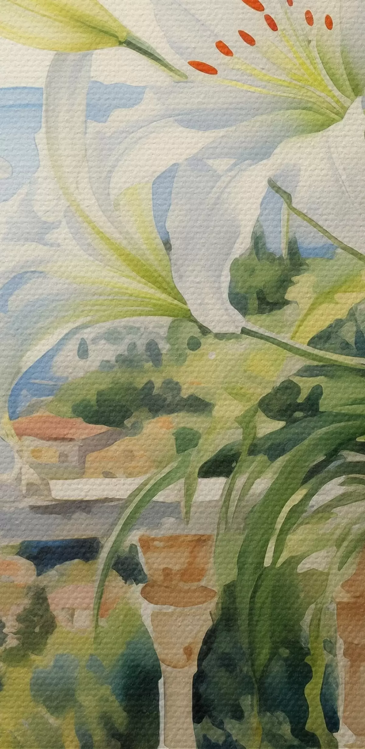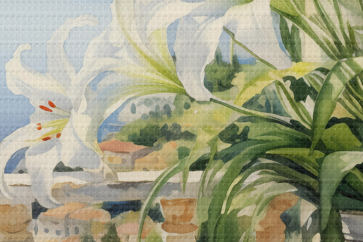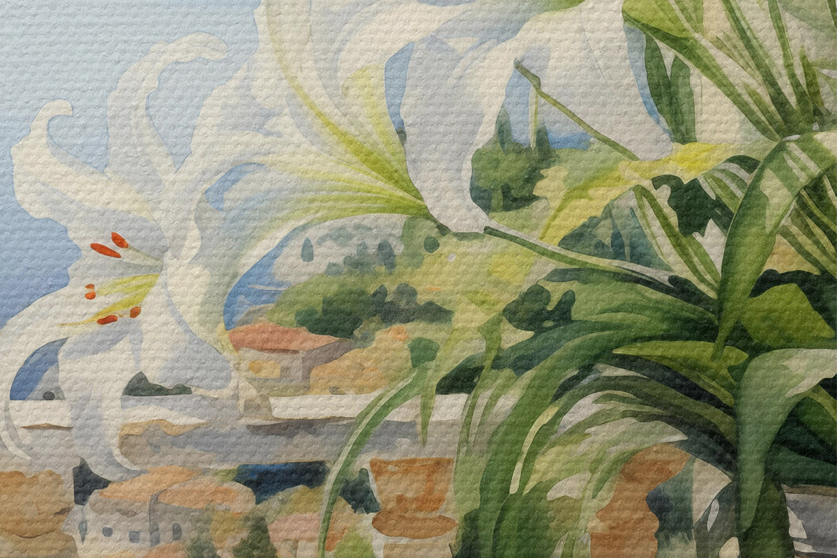 Foto Lirios blancos en una maceta en un balcón con el fondo de la bahía acuarela Nr r39932