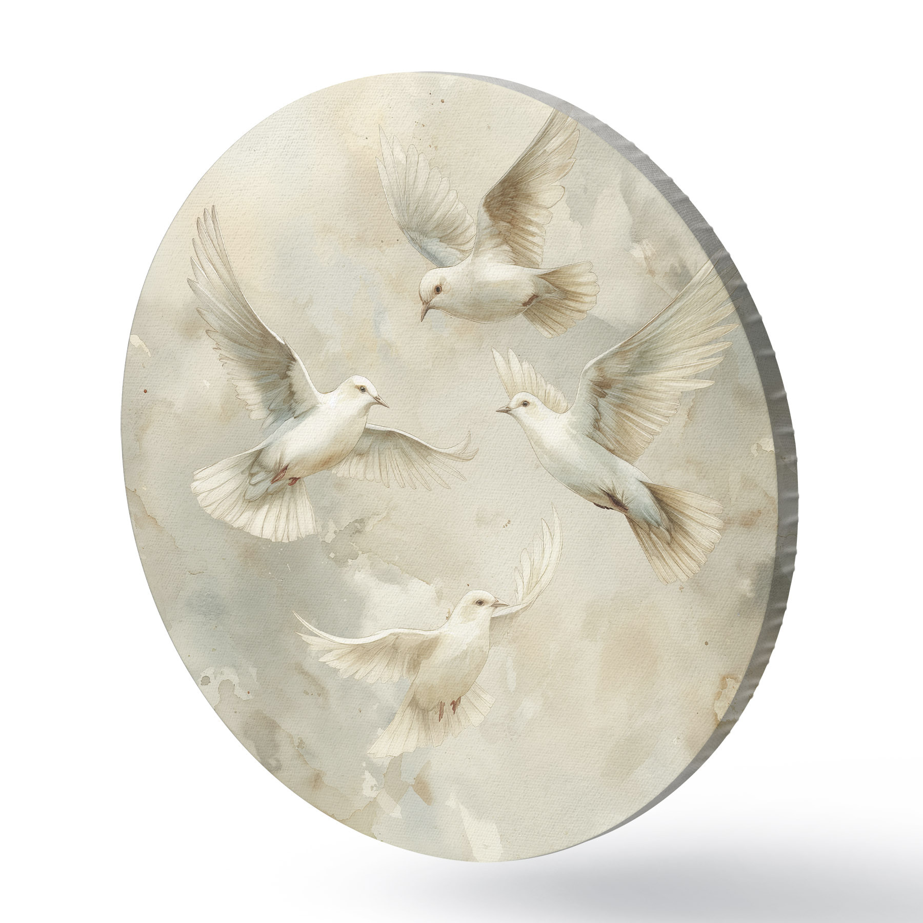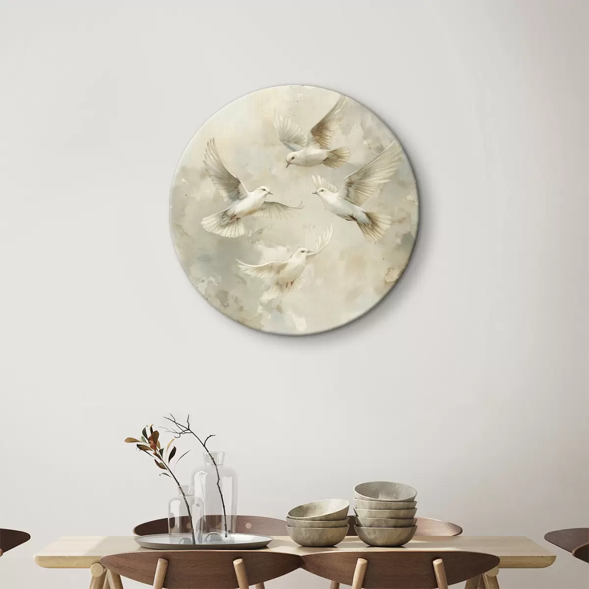 Cuadros redondos Pájaros voladores de acuarela, colores beige y blanco suaves, palomas r39976