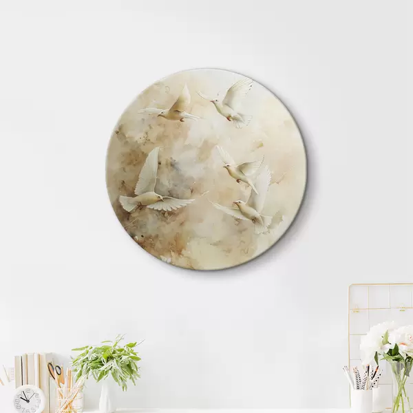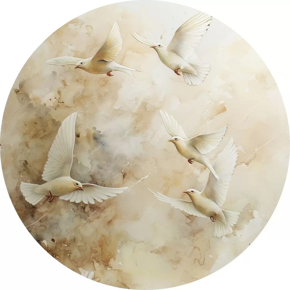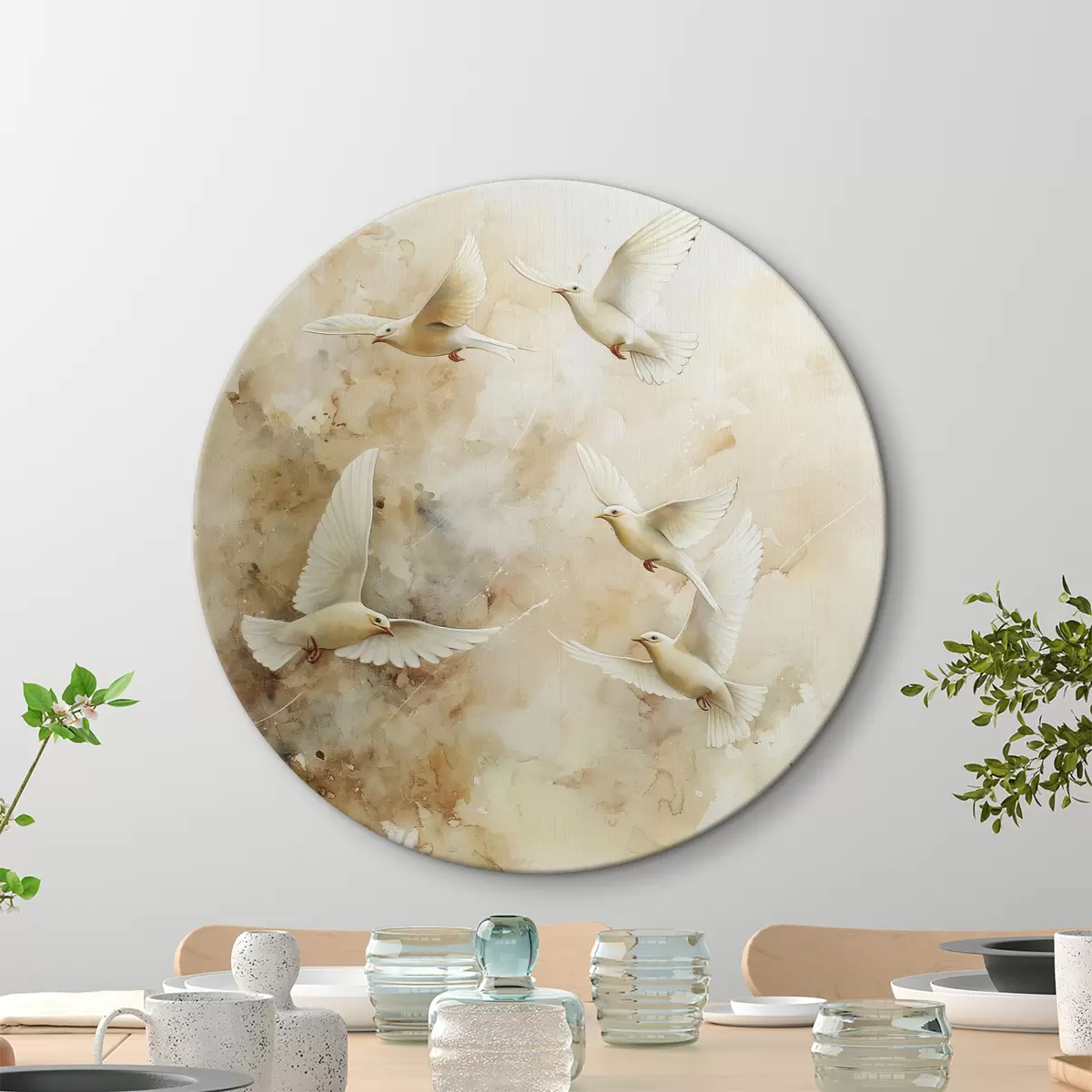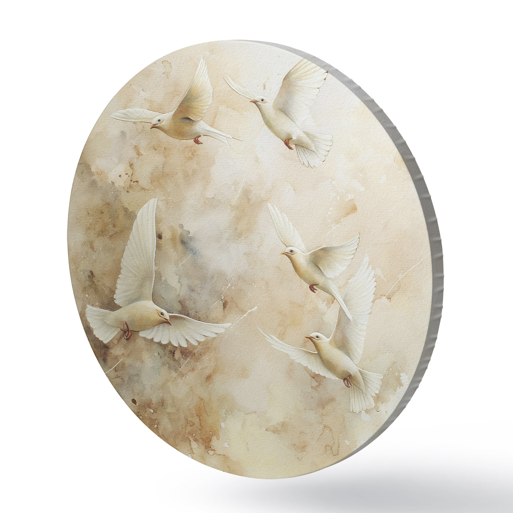 Cuadros redondos Palomas voladoras en acuarela, suaves colores beige y blanco r39977
