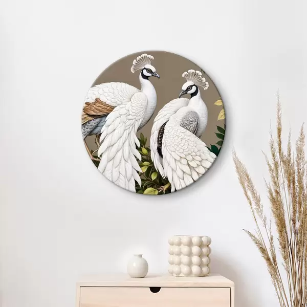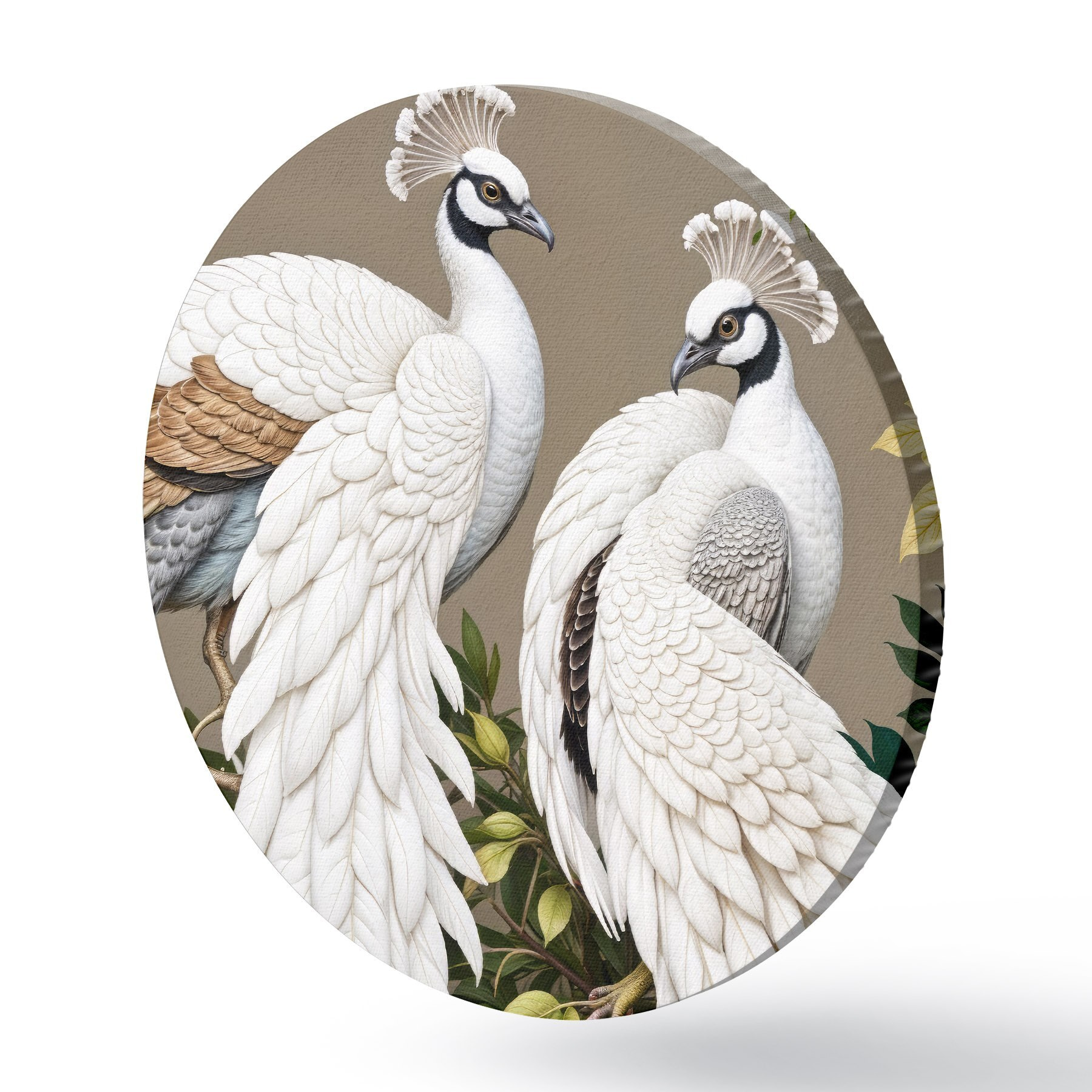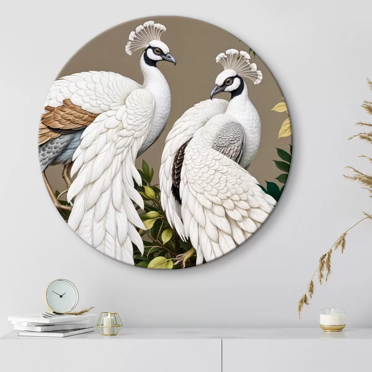 Cuadros redondos Dos pavos reales blancos con plumas adornadas posados en una rama con flores r40022