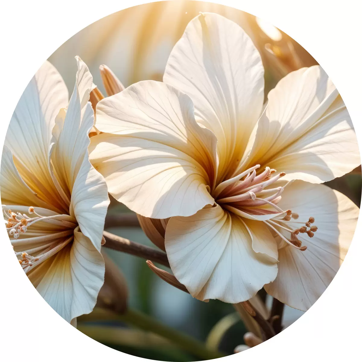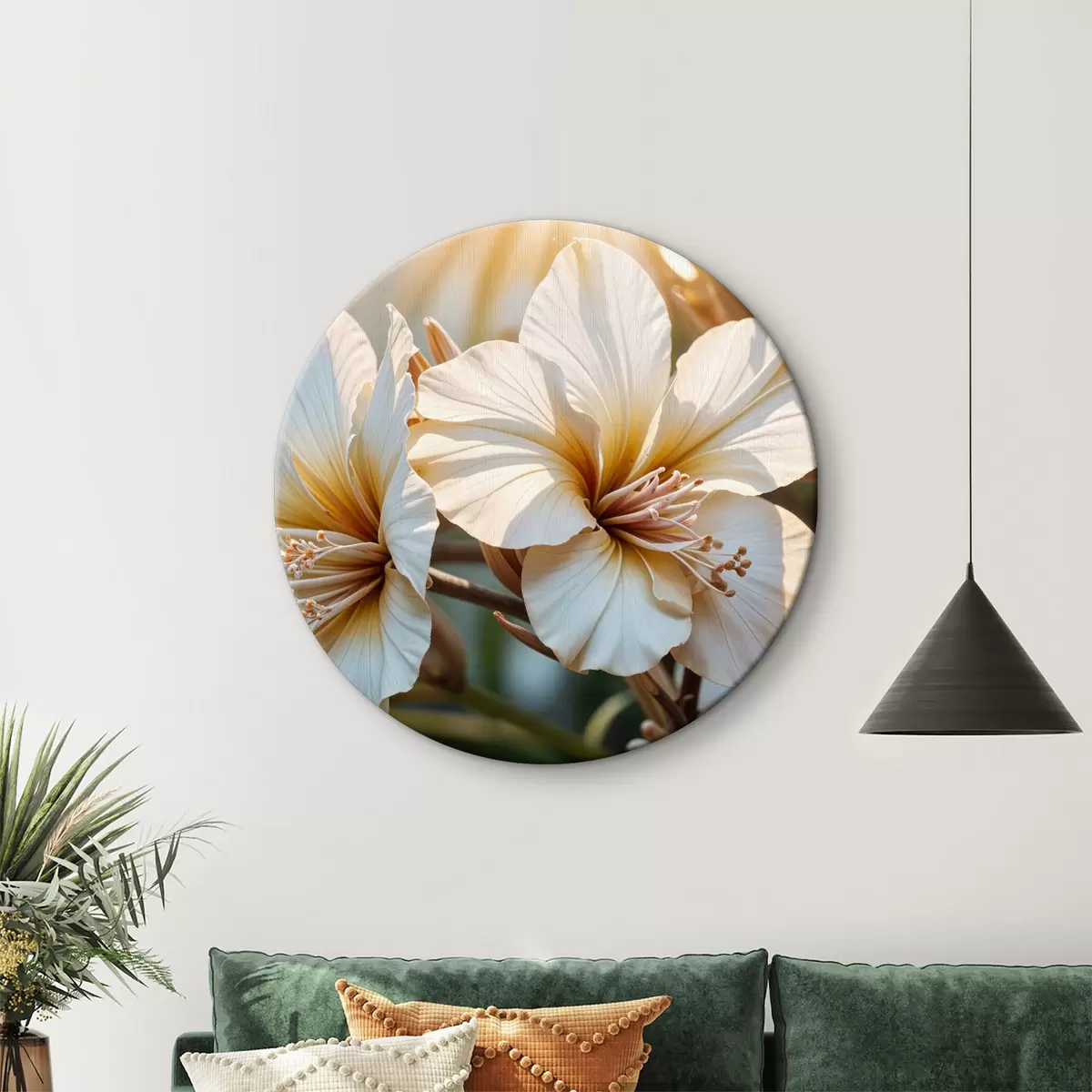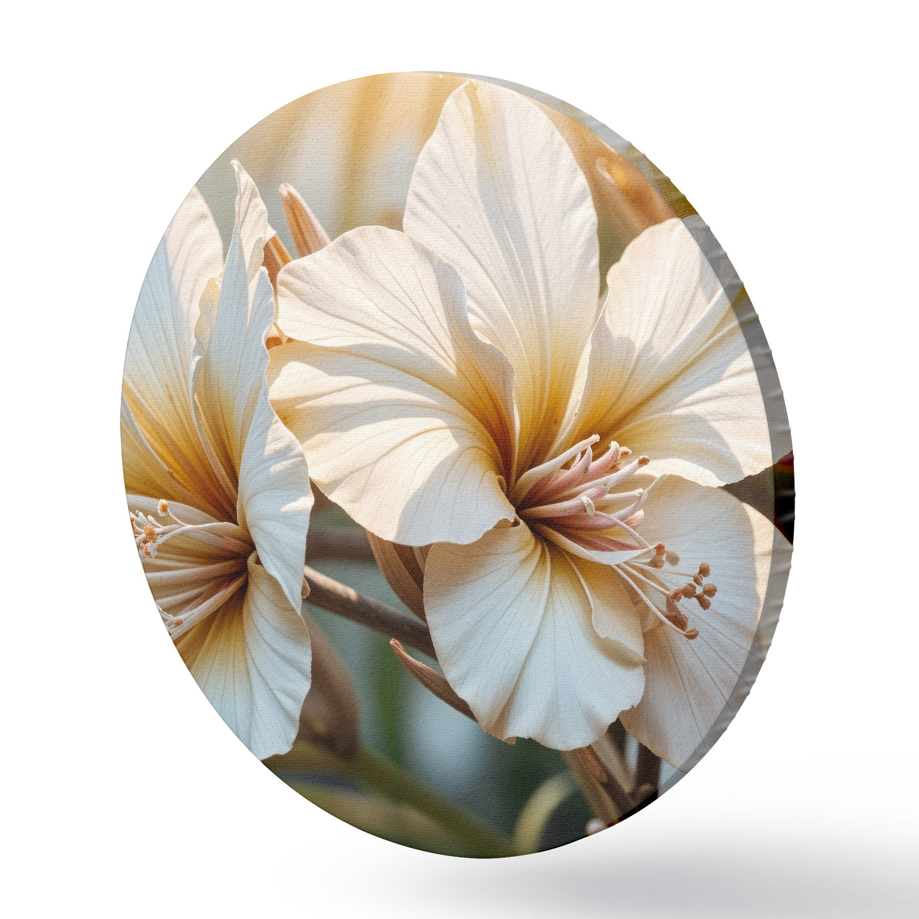 Cuadros redondos Flores de hibisco blancas y naranjas en flor, con un fondo de enfoque suave r40035
