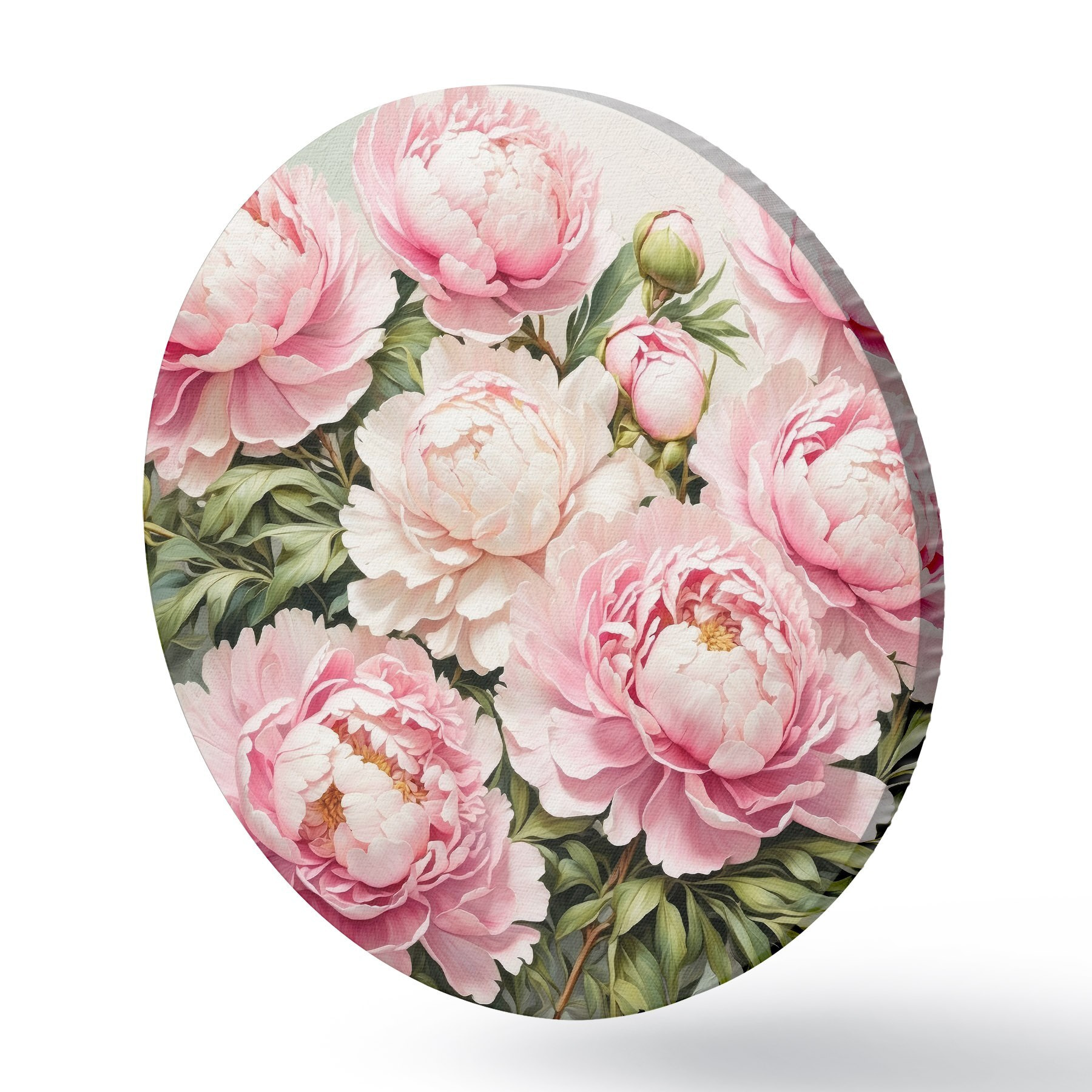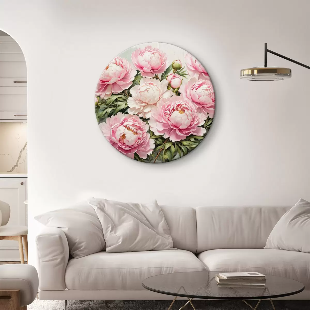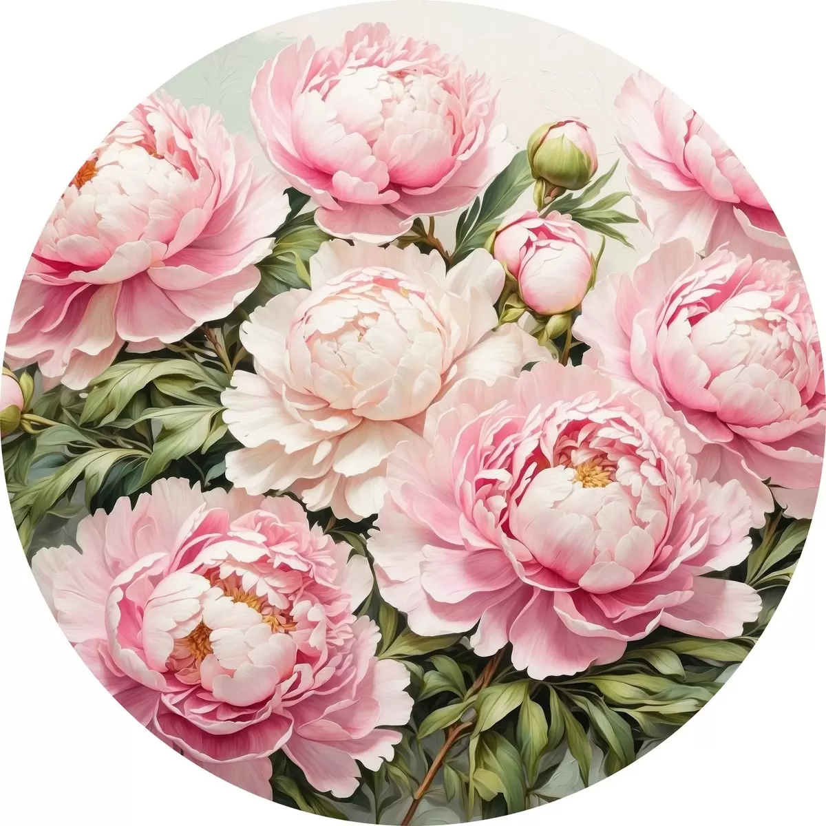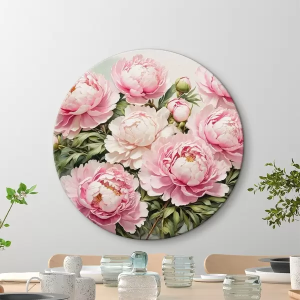 Cuadros redondos Flores y hojas rosas sobre fondo azul-blanco r40074